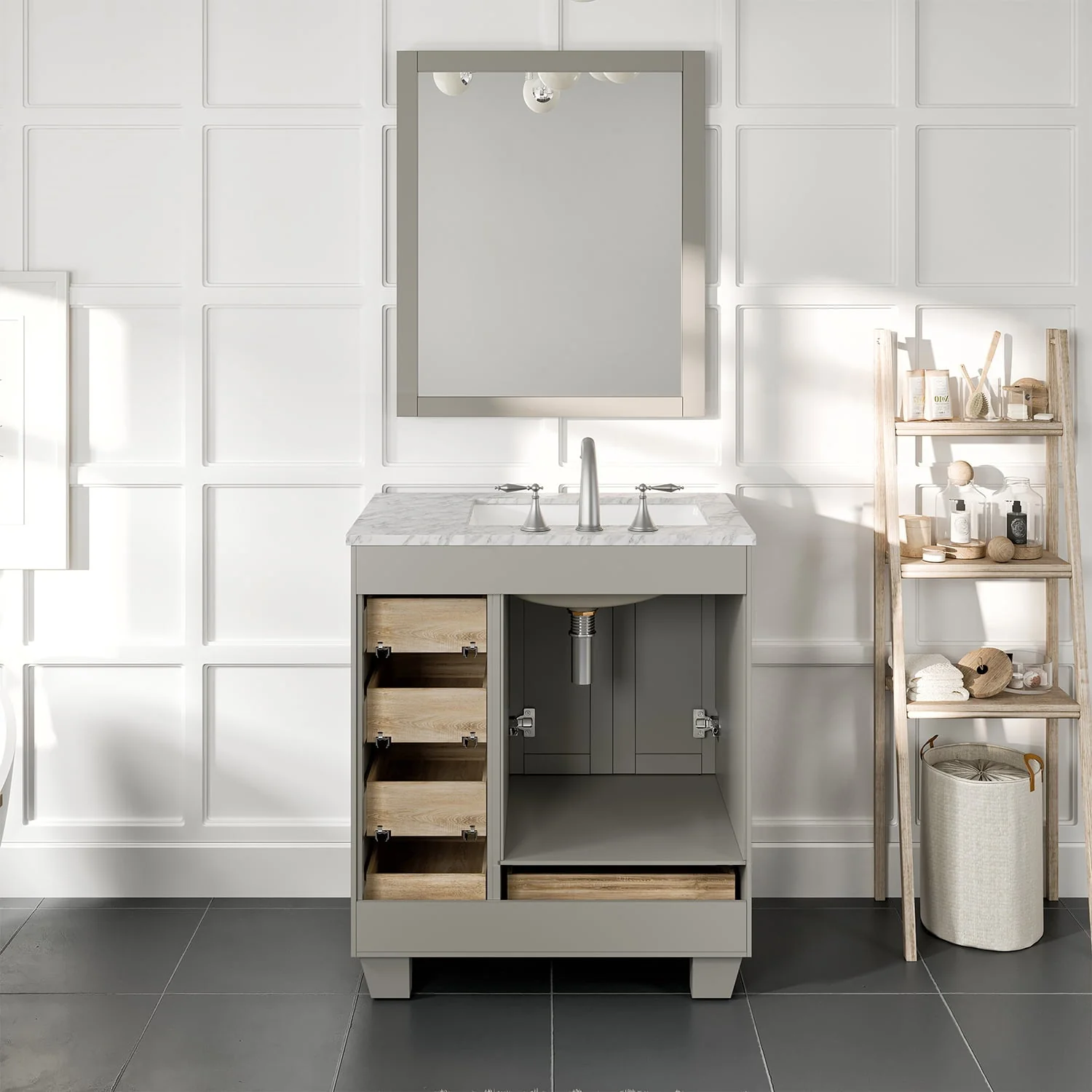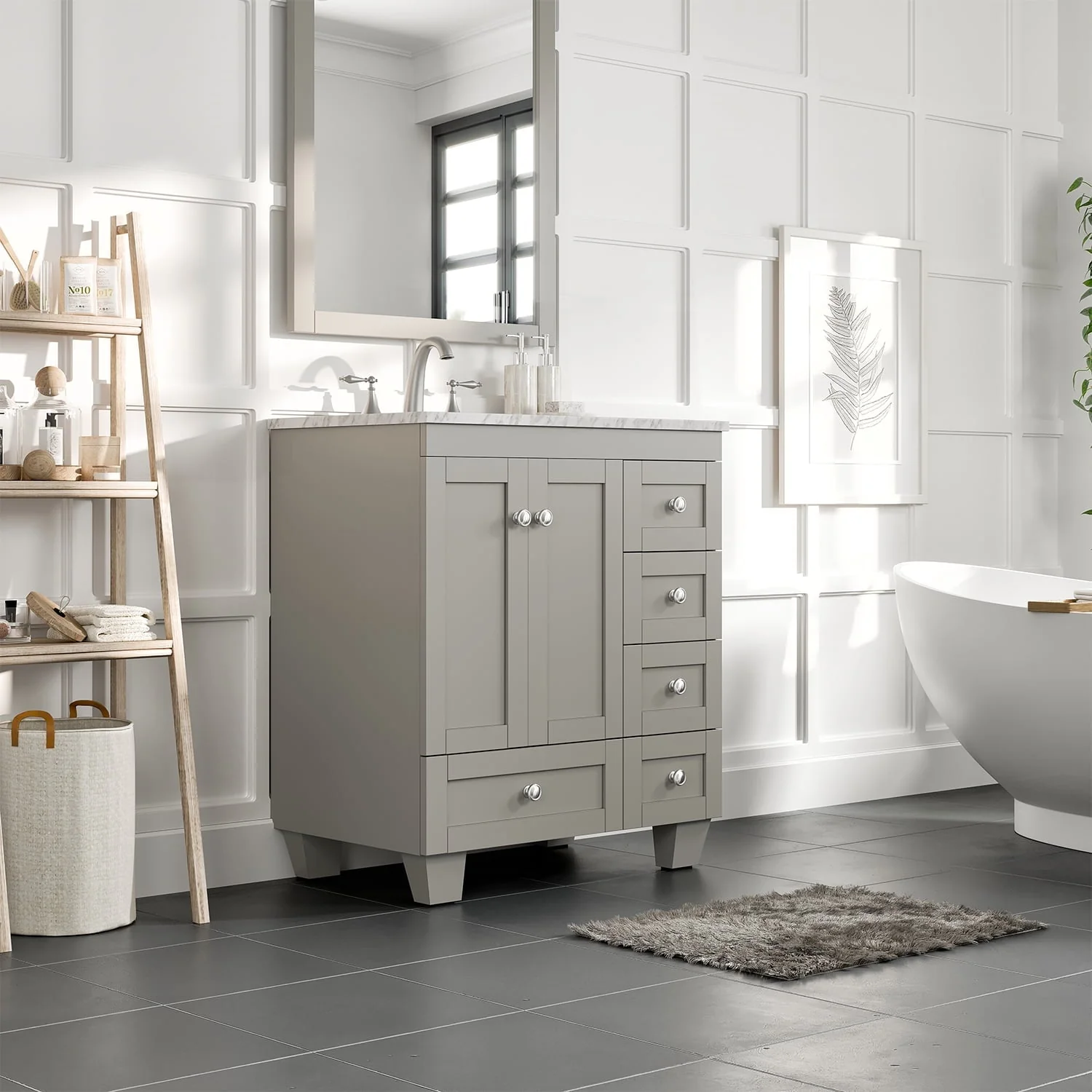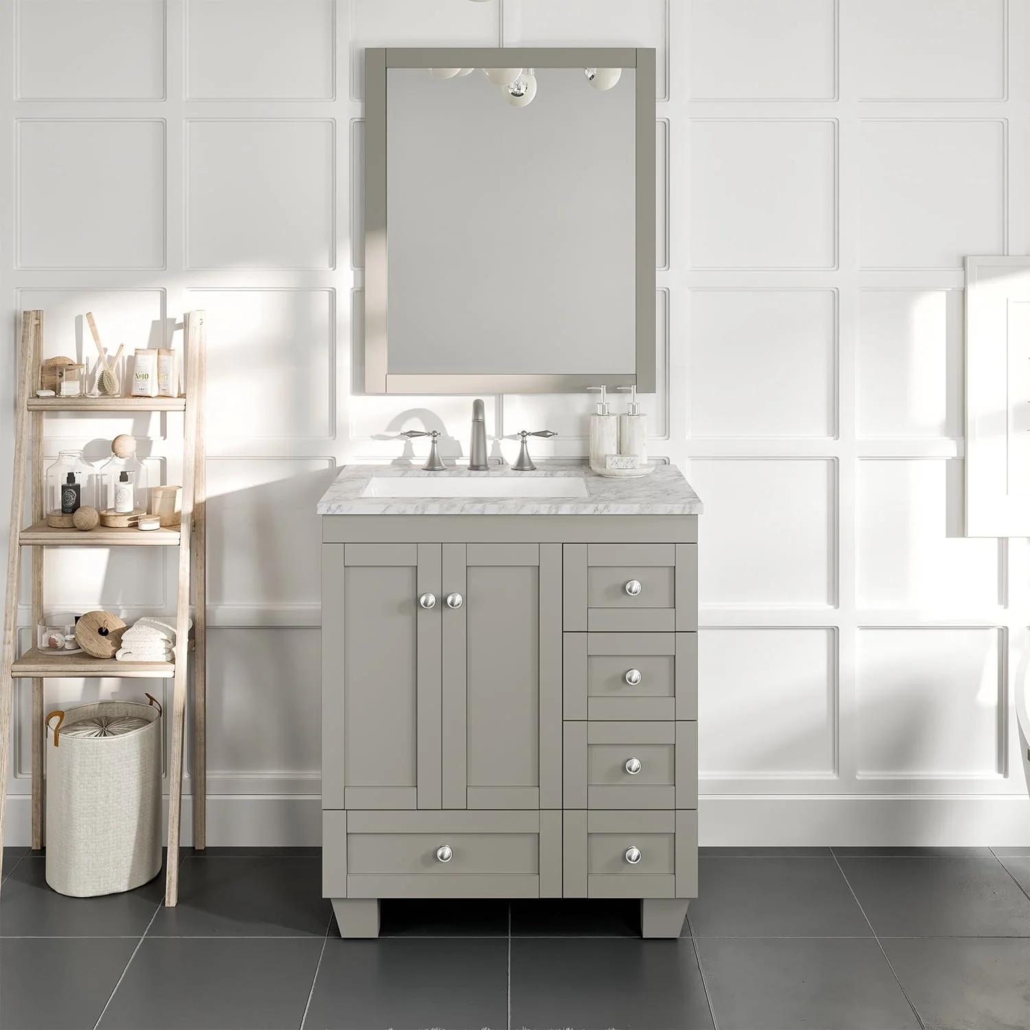 Eviva's bestselling bathroom vanity, the Acclaim features a white porcelain under-mounted sink, a solid wood construct, a durable water-resistant polyurethane finish outside and water-resistant layer inside, an Italian white carrara marble top, soft closing drawers and doors, brushed chrome handle/ knobs, 3 pre-drilled holes 8-inch wide spread for a faucet. Available in sizes 28 and 30 inches. Colors espresso, gray, white and teak in size 30 only.