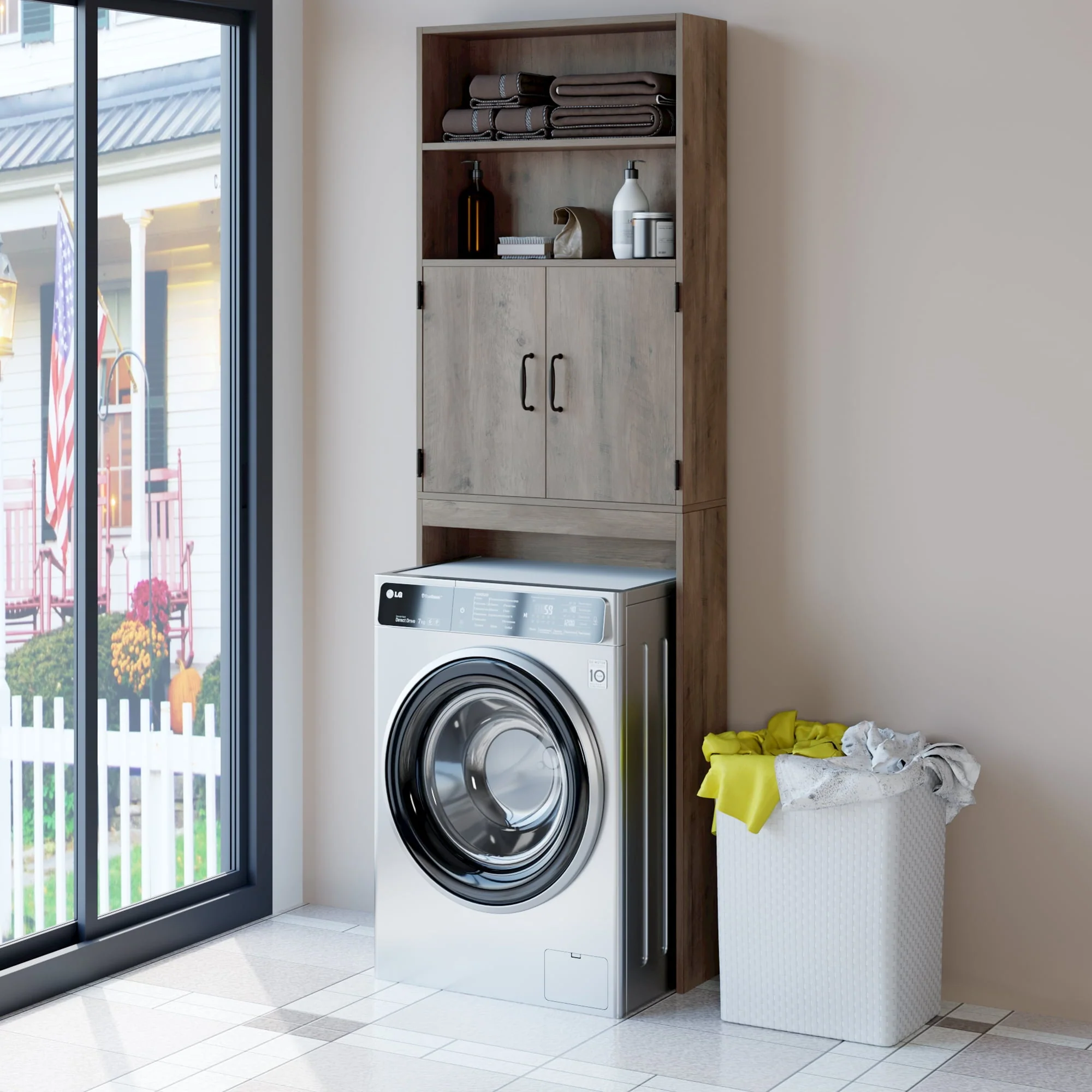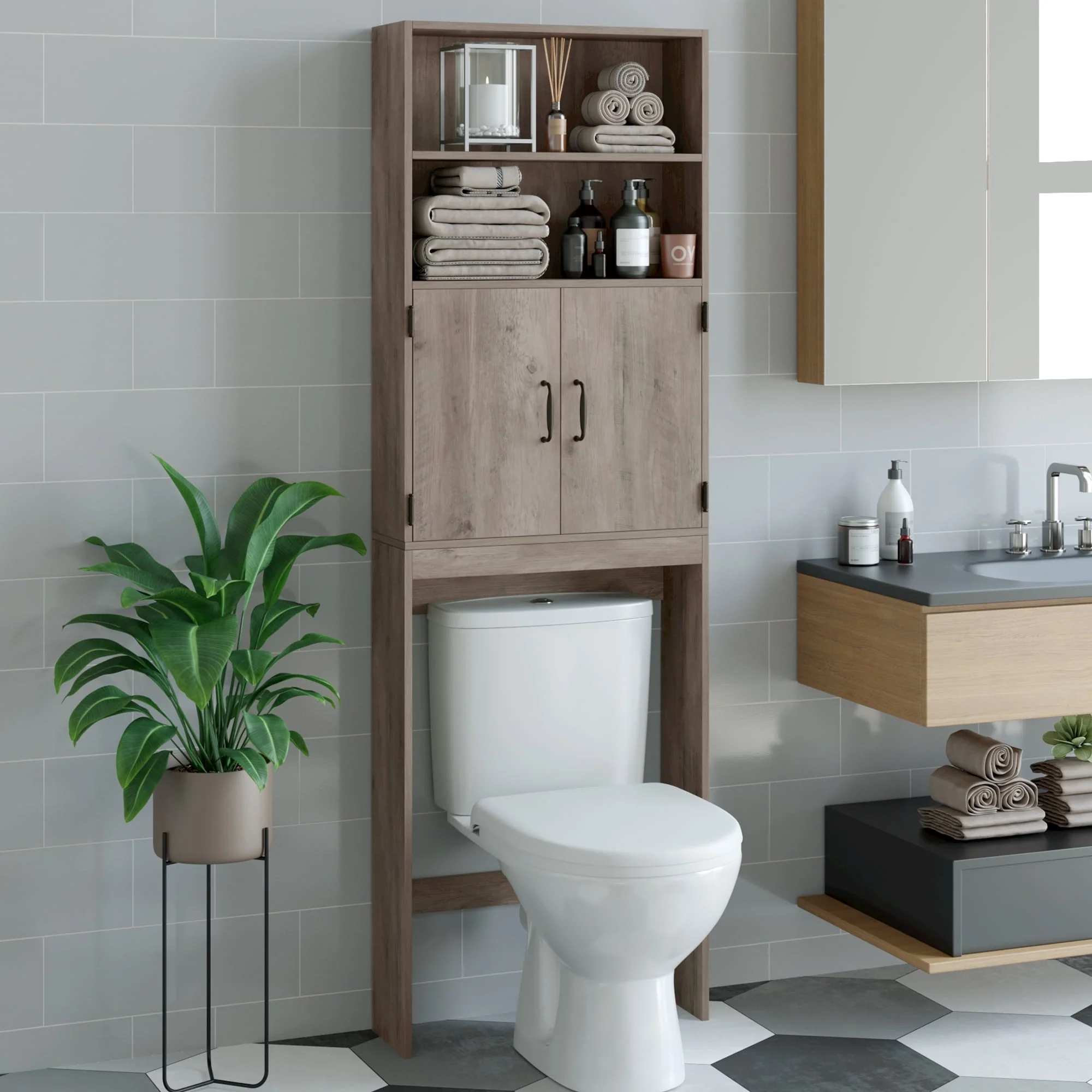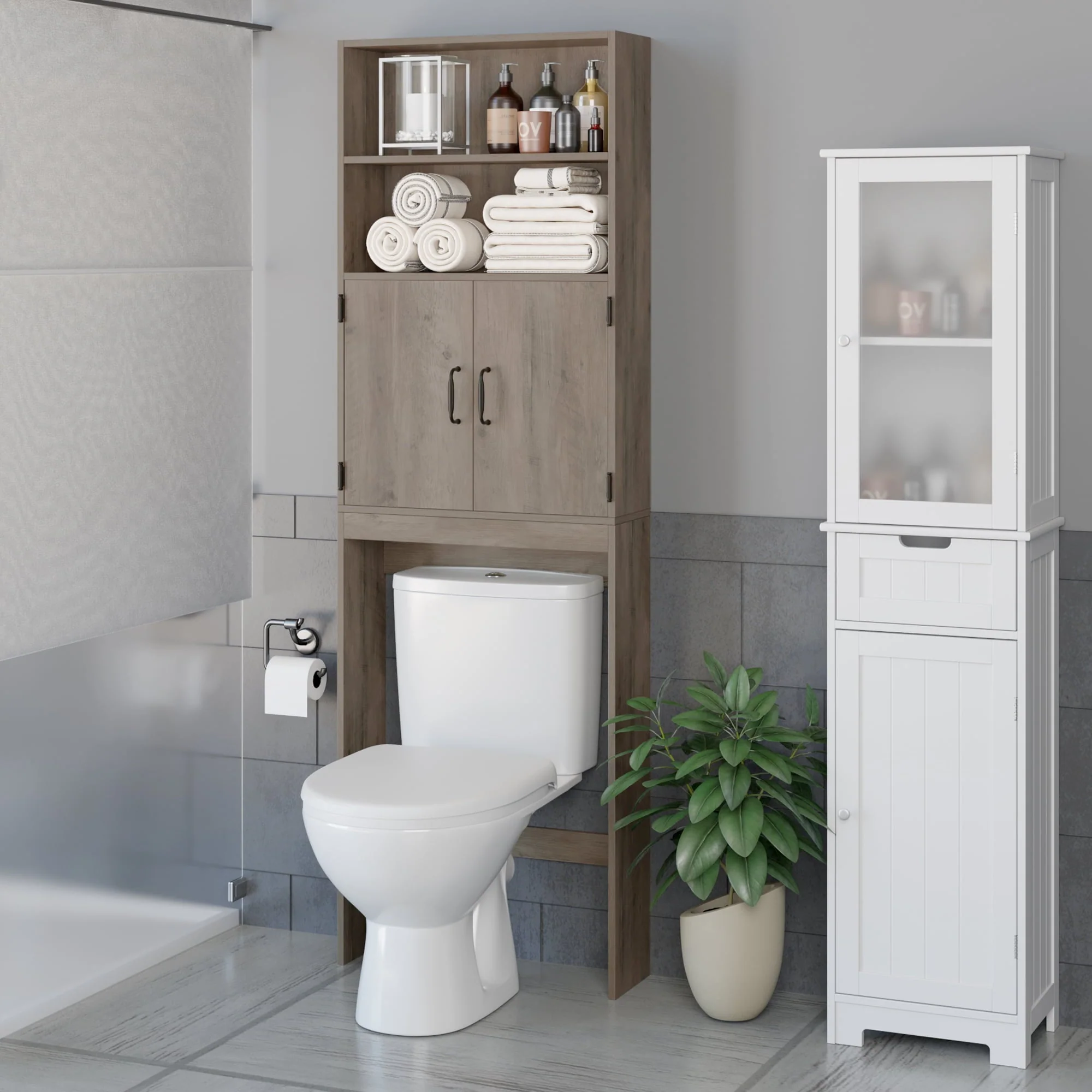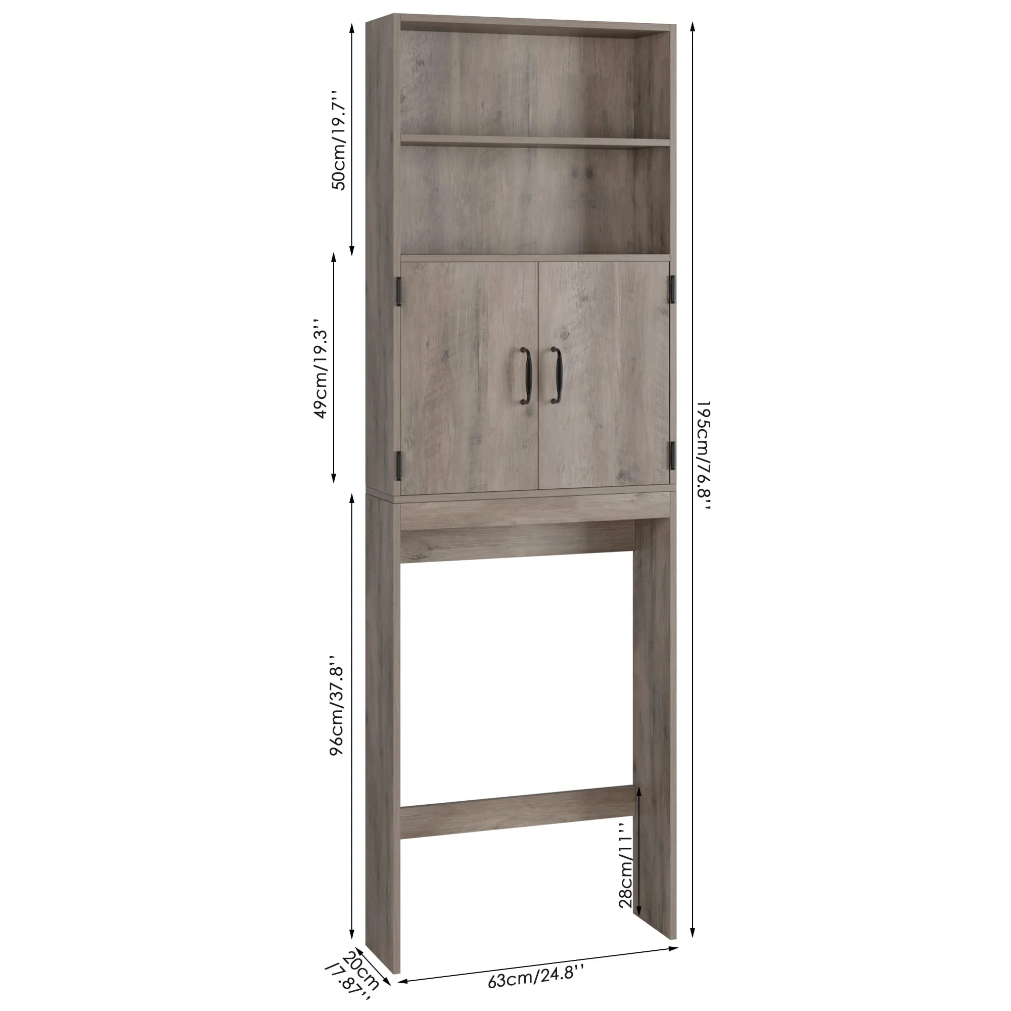 The over toilet storage has a simple design, allowing it to be dressed to fit almost any decor. Features one enclosed shelf with double doors, and two open shelves to place soap, toilet paper, and other decorative items. Keep toiletries, cleaning supplies, and more organized while adding a touch of fashional appeal to your bathroom with this essential storage shelf.