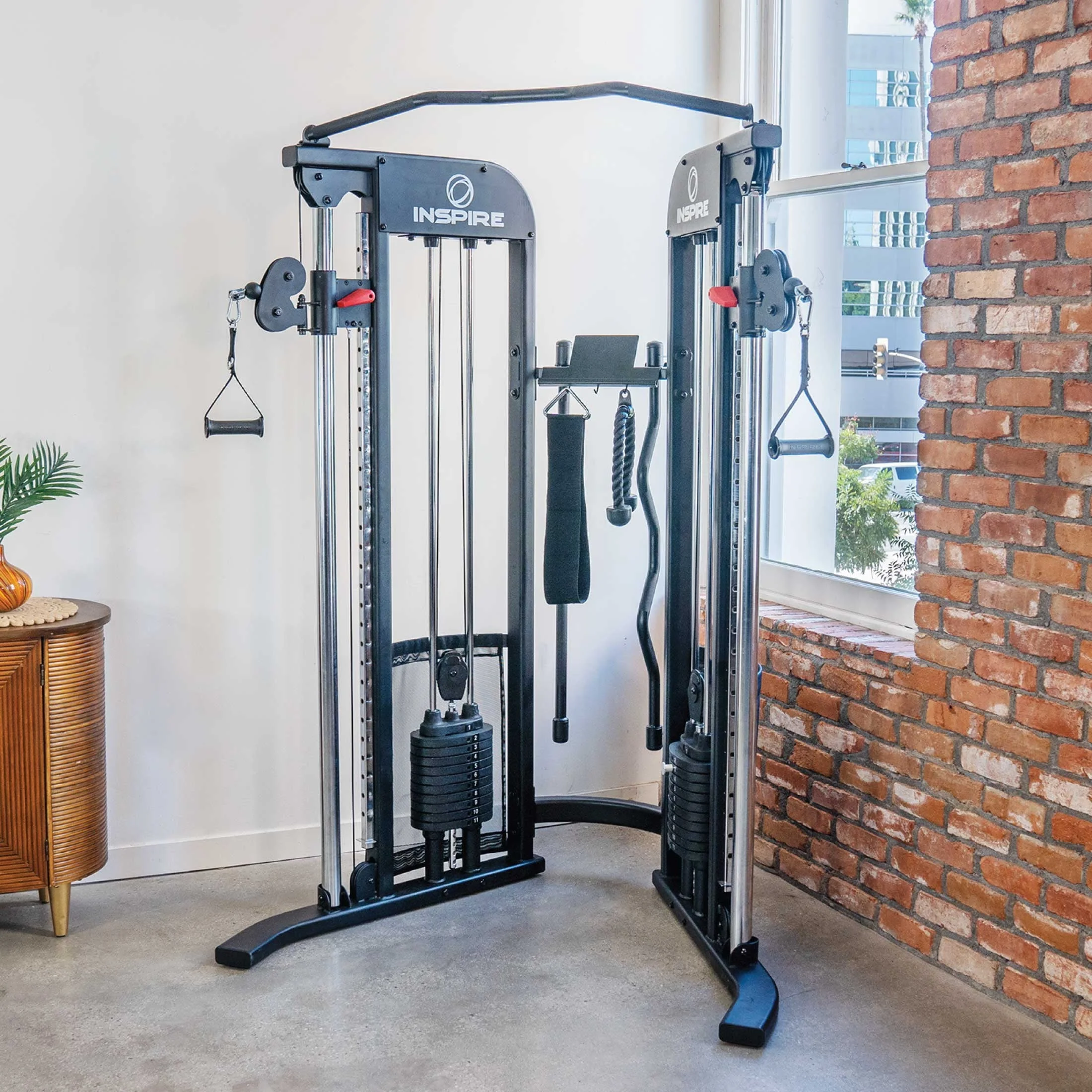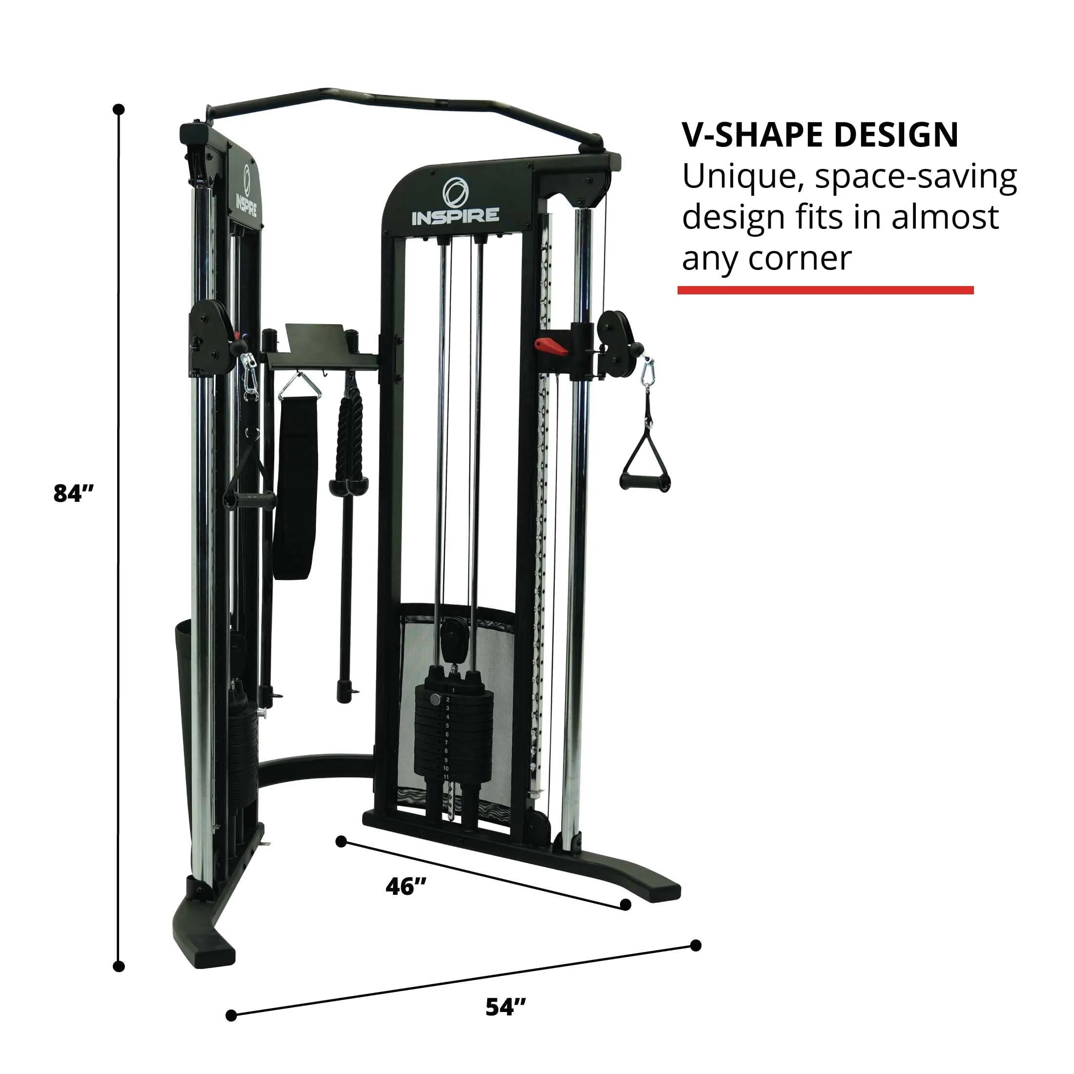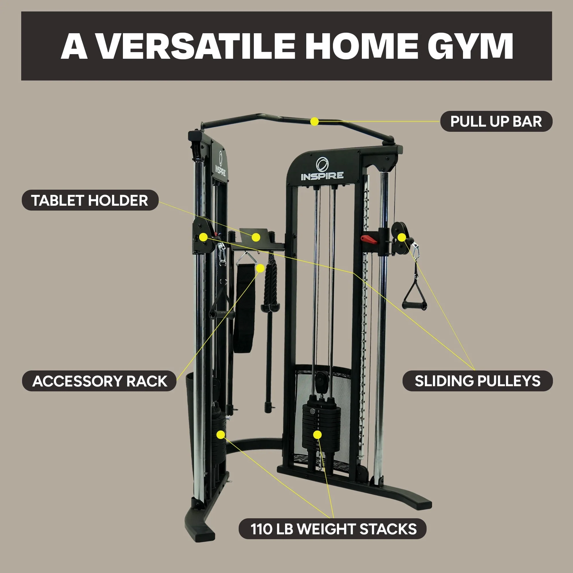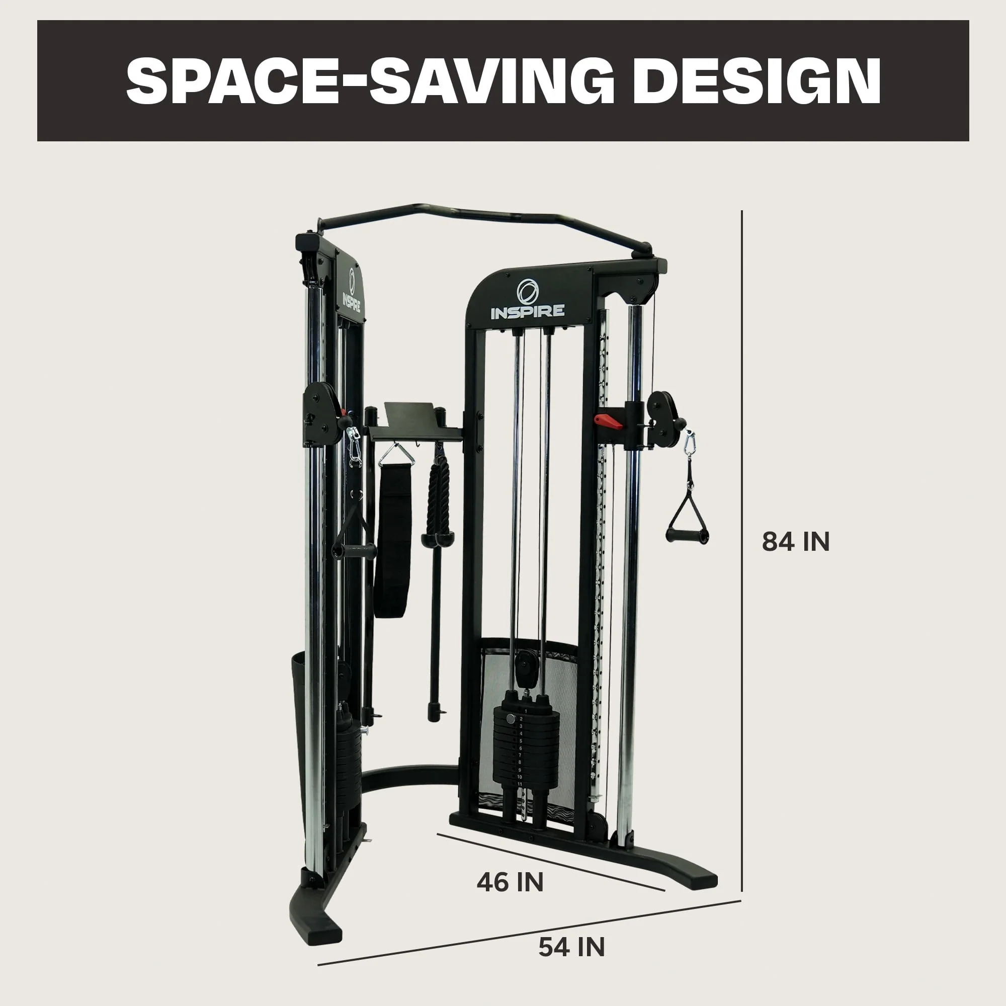 Inspire Fitness's CG3 Functional Trainer Home Gym is a game-changer for home gym enthusiasts. Combining versatility with a compact footprint, this functional trainer offers everything you need to achieve your fitness goals. The CG3 Functional Trainer Home Gym is intentionally designed to deliver versatility in a compact design, fitting perfectly into any corner. Although compact, the heavy-duty steel frame delivers a sturdy machine that's built to last. Equipped with two 110 lb. weight stacks, the CG3 allows for a wide range of resistance options. The 2 sliding pulleys with 30 vertical pulley positions bring unlimited versatility, enabling you to perform a variety of exercises for different muscle groups. Whether conducting standing, sitting, kneeling, or even bench exercises - the swivel adjustable pulleys can accommodate any position. This Functional Trainer also comes with a complete accessory package, accessory rack, device holder, and pull-up bar, making storage simple. Whether you're looking to build strength, improve endurance, or enhance overall fitness, the Inspire Fitness CG3 Functional Trainer is the ideal companion. Its compact design, sturdy construction, and comprehensive features make it a valuable asset in any home gym setup.
