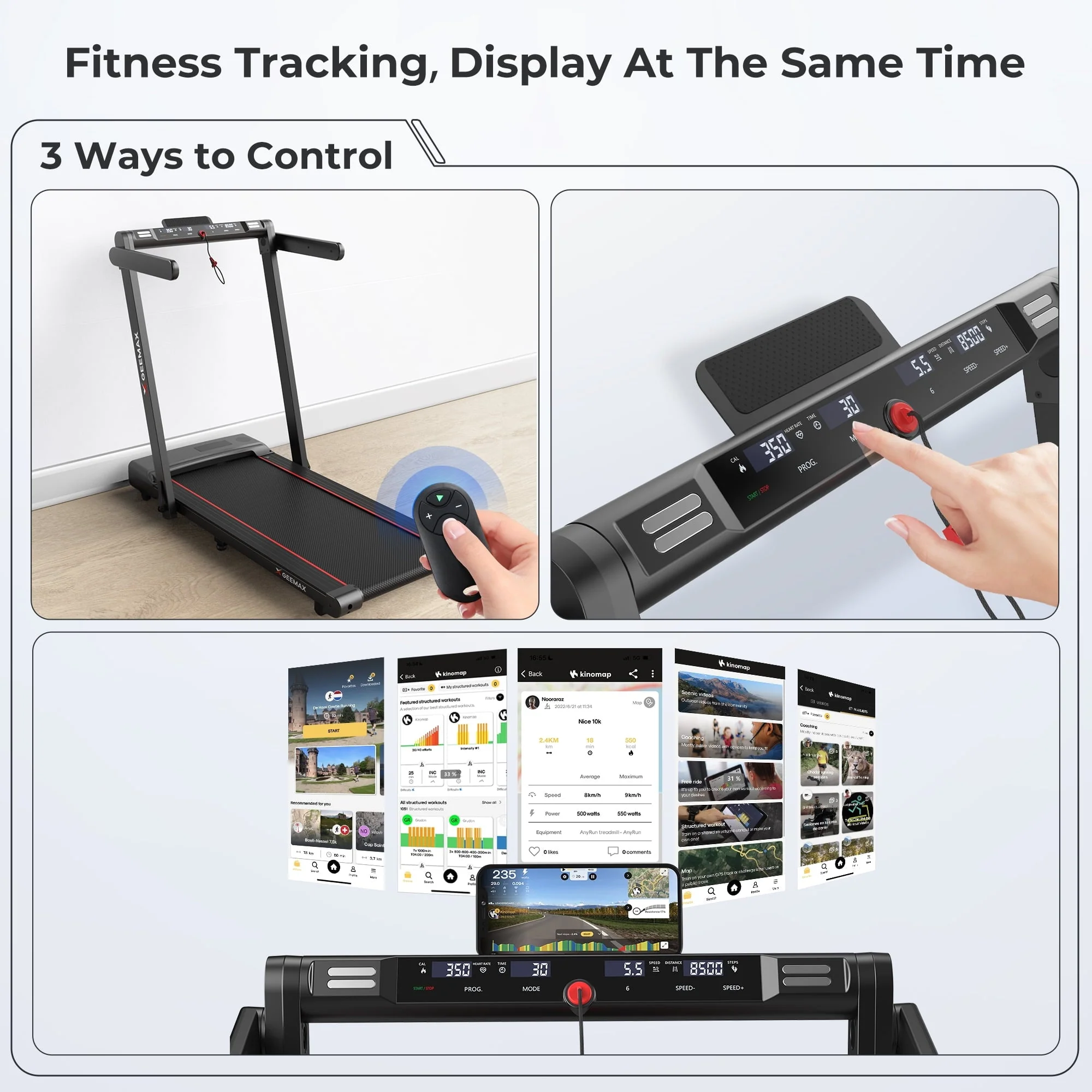 ③Multi-method control:Under desk treadmill offers three control methods: LED touch screen buttons, a remote control, and a mobile app. Users can easily navigate and operate foldable treadmill using their preferred control method, even without the remote control.