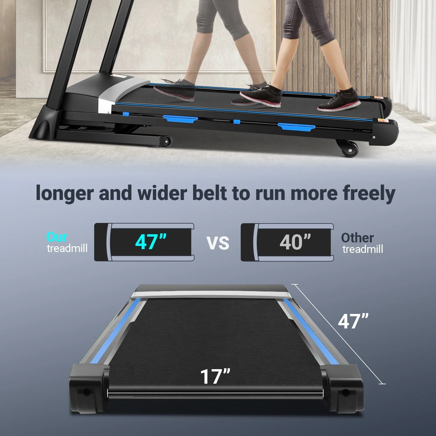 The 17" belt area gives plenty of space for running, and the equipment can support up to 300 lbs load.Treadmill Integrates with the Fit Show app via Bluetooth for easy operation and custom routines.(12 preset programs ranging from beginner to advanced).