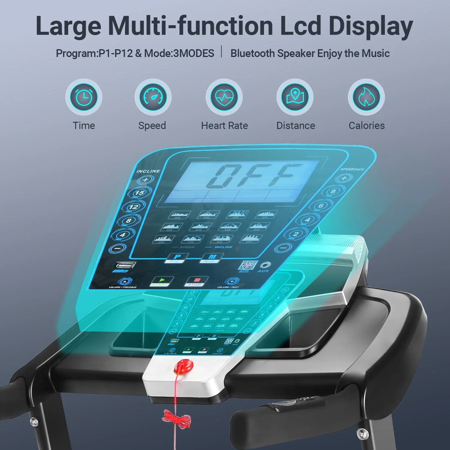 Advanced Multi-functional LCD Display which indicates distance, calories burned, time, speed, scan, and target zone heart rate monitoring. The shortcut keys on both sides of the handrail can adjust the tilt angle and running speed, allowing you to quickly adjust the movement form during the fitness process.