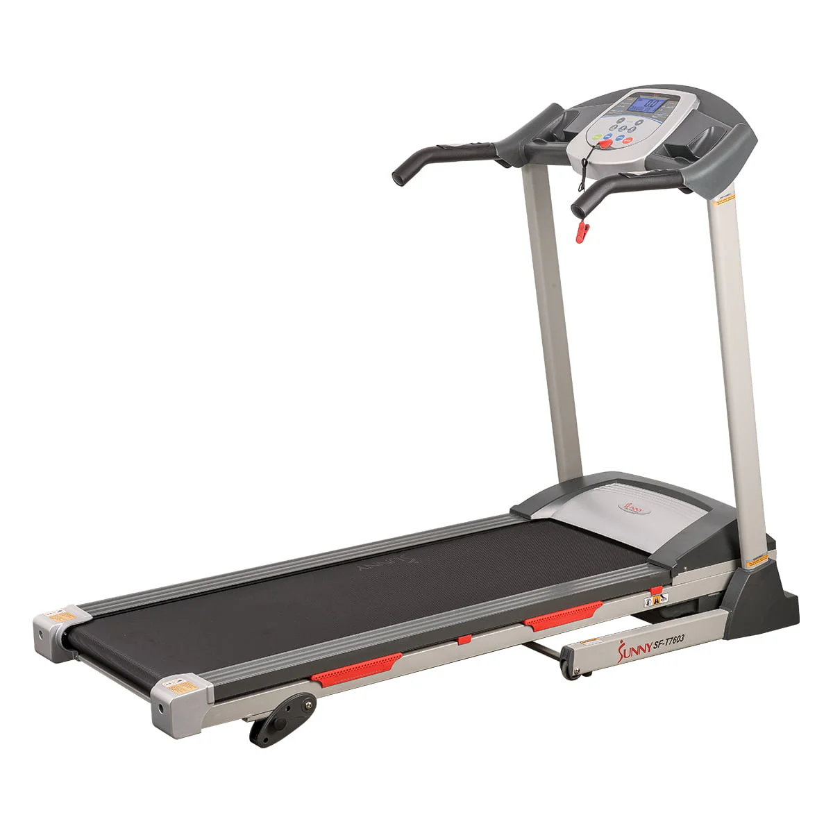 Sunny Health & Fitness presents our brand new Motorized Treadmill. If you don't have time to go to the gym or go running outdoors, this is the solution. With this Sunny Health & Fitness treadmill, your home is your gym that will help you stay in shape. It features a folding mechanism and a soft drop system to help you fold and unfold your treadmill safely and with ease. The handrail controls allow you to control start, stop, adjust speeds, and measure your pulse rate. This treadmill comes with 9 built-in user programs with 3 manual adjustable incline levels. It helps keeps track of your overall workout goals with an easy to read LCD that displays time, distance, speed, and calories. The Sunny Health & Fitness Treadmill is expertly designed for performance and total efficiency with a 220 lb maximum user weight.