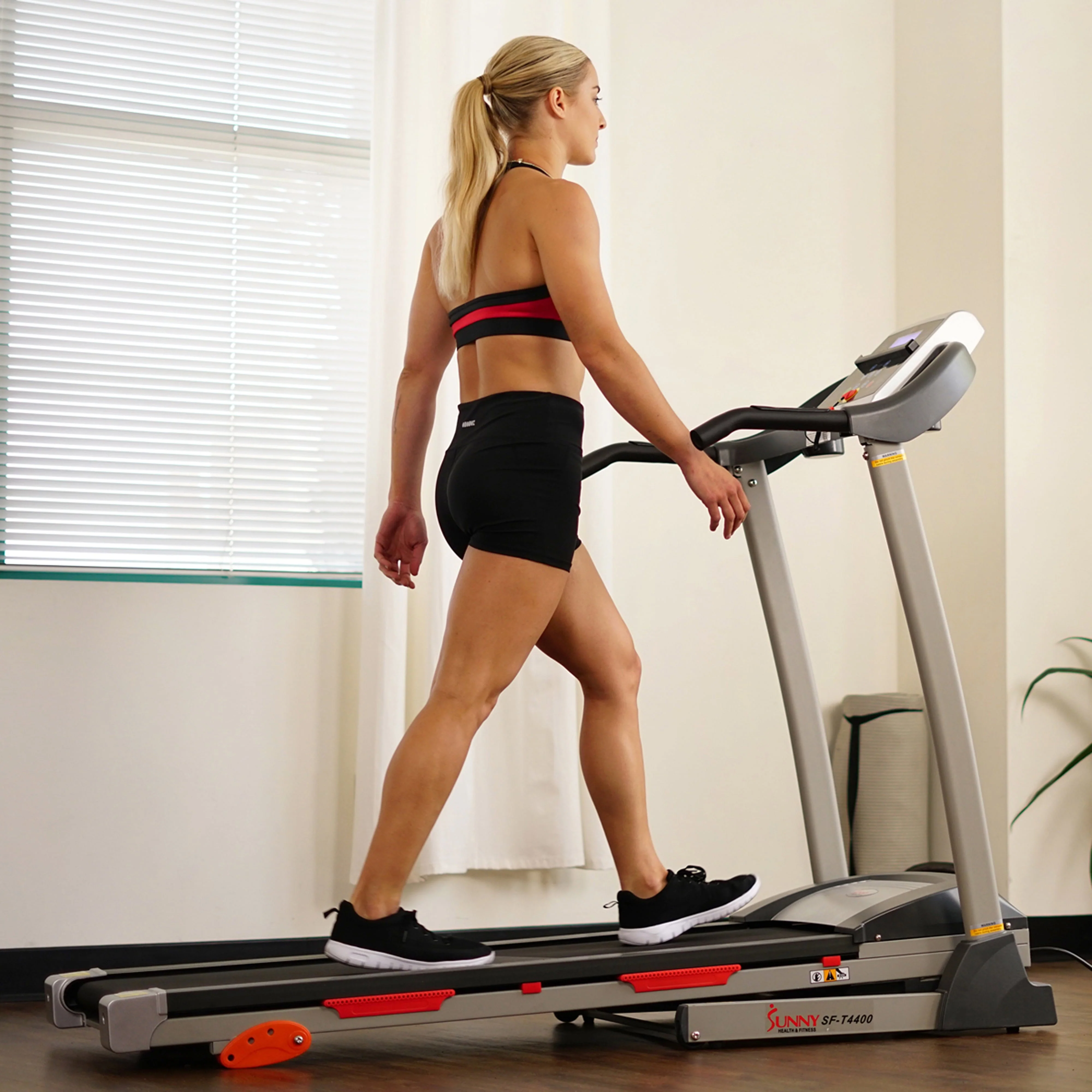 The Sunny Health & Fitness' Treadmill with Manual Incline features 9 built-in workout programs, handrail controls, and a phone/tablet holder that will add comfort and accessibility during any workout routine. This well-designed treadmill features an easy folding mechanism and soft drop system. The soft drop system will assist you when opening the treadmill, avoiding a big slam or damage to your wood/carpet floor. It features an LCD screen that tracks your speed, time, distance, pulse, and calories which makes it easier to track your fitness goals. This treadmill is expertly designed for maximum performance, optimal comfort, and ultimate efficiency, with a maximum user weight capacity of 220 lbs.