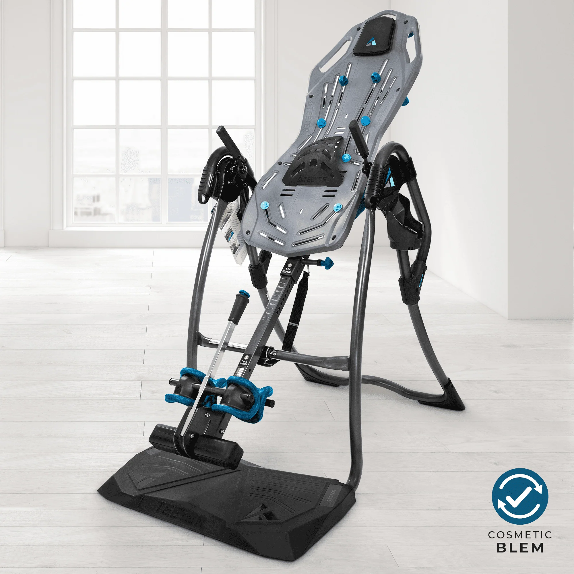 Discover how amazing your back can feel with the premium Teeter FitSpine LX9 Inversion Table, designed to give you more comfort and real results on your journey to back pain relief. The smooth FlexTech™ Bed encourages your spine to decompress better than any other inversion table surface, while the patented 8-point floating suspension system flexes as you move for a deeper stretch. Ideal for back pain sufferers, the Deluxe EZ-Reach™ Ankle System features an extra-long handle and micro-adjustments to ensure the most comfortable fit. The LX9 offers a unique arched base with boarding platform that makes mounting and dismounting even easier! Stretch Max™ Handles and EZ-Stretch™ Traction Handles provide added support and stretching options to you while inverted. Included Lumbar Bridge and Acupressure Nodes add targeted traction and pressure-point relief for boosted benefits. Precision-balanced and easy to store, the Teeter FitSpine LX9 offers a comfortable, effective way to find back pain relief in your own home. Feel better, move better, live better... with Teeter.