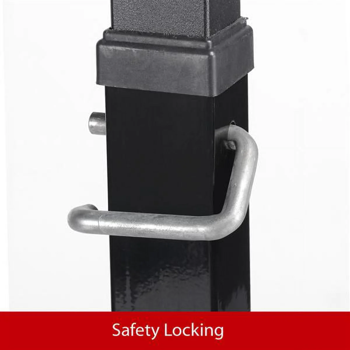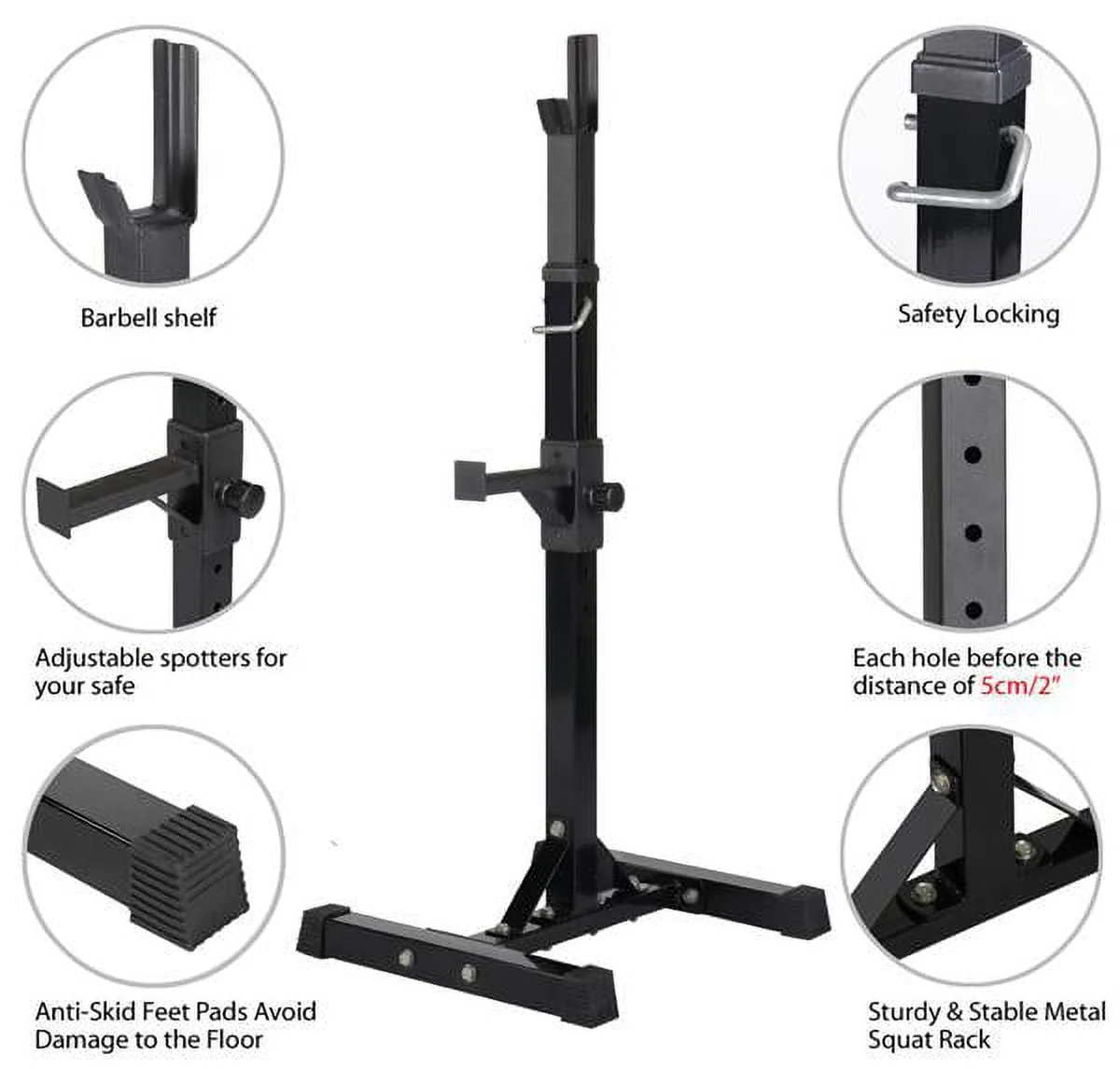 This sturdy and stable metal squat rack is great for home exercise and commercial use. It is ideal for squatting, bench pressing, or standing exercises. The height is adjustable and there is an adjustable safety pin on each post to secure the rack.
