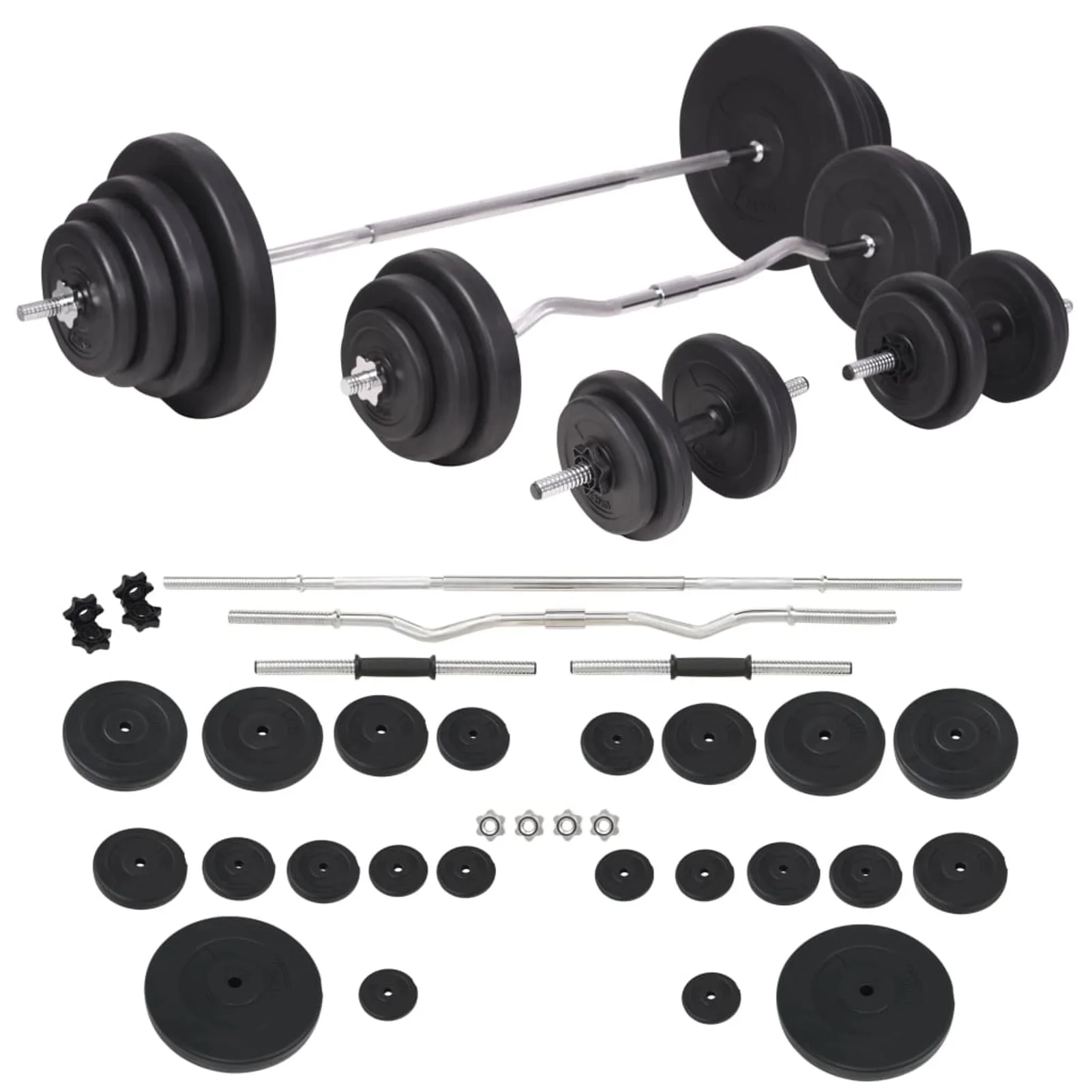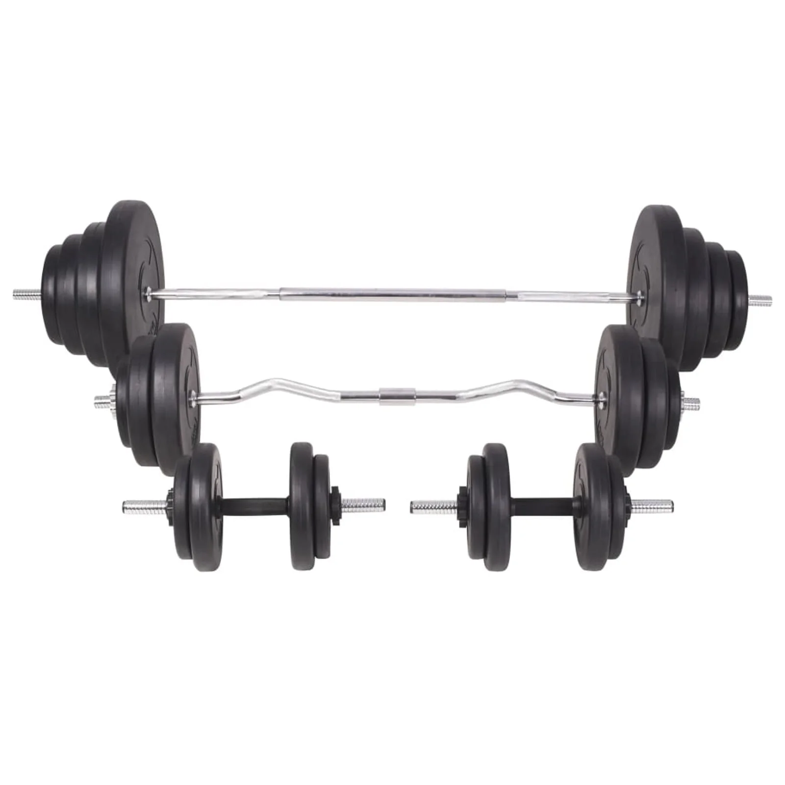This adjustable workout bench with a weight rack and barbell and dumbbell set will be a great choice for working out in the comfort of your own home, and saves you the hassle and expense of going to a gym. The adjustable, padded bench can be inclined or placed horizontally. You can choose either position to meet your requirements. This bench is suitable for homes and offices with limited space, as it can easily be stored vertically when not in use. The sturdy steel construction of the bench ensures your safety during the exercises. The durable, cotton-padded cushion will offer you the utmost comfort. This versatile barbell and dumbbell set is perfect for chest, biceps, arms, triceps and back muscles. It includes two 33.1 lb plates, two 22 lb plates, two 16.5 lb plates, four 11 lb plates, six 5.5 lb plates, six 2.8 lb plates, two barbell bars and two dumbbell bars and has a total weight of about 264.6 lb. This set allows the users to variably select the weights they want to lift for different exercises. These plates are made of cement with a shell and they can easily be secured onto the bars with the included star locks. The weight is clearly stamped on each plate for quick and easy identification.