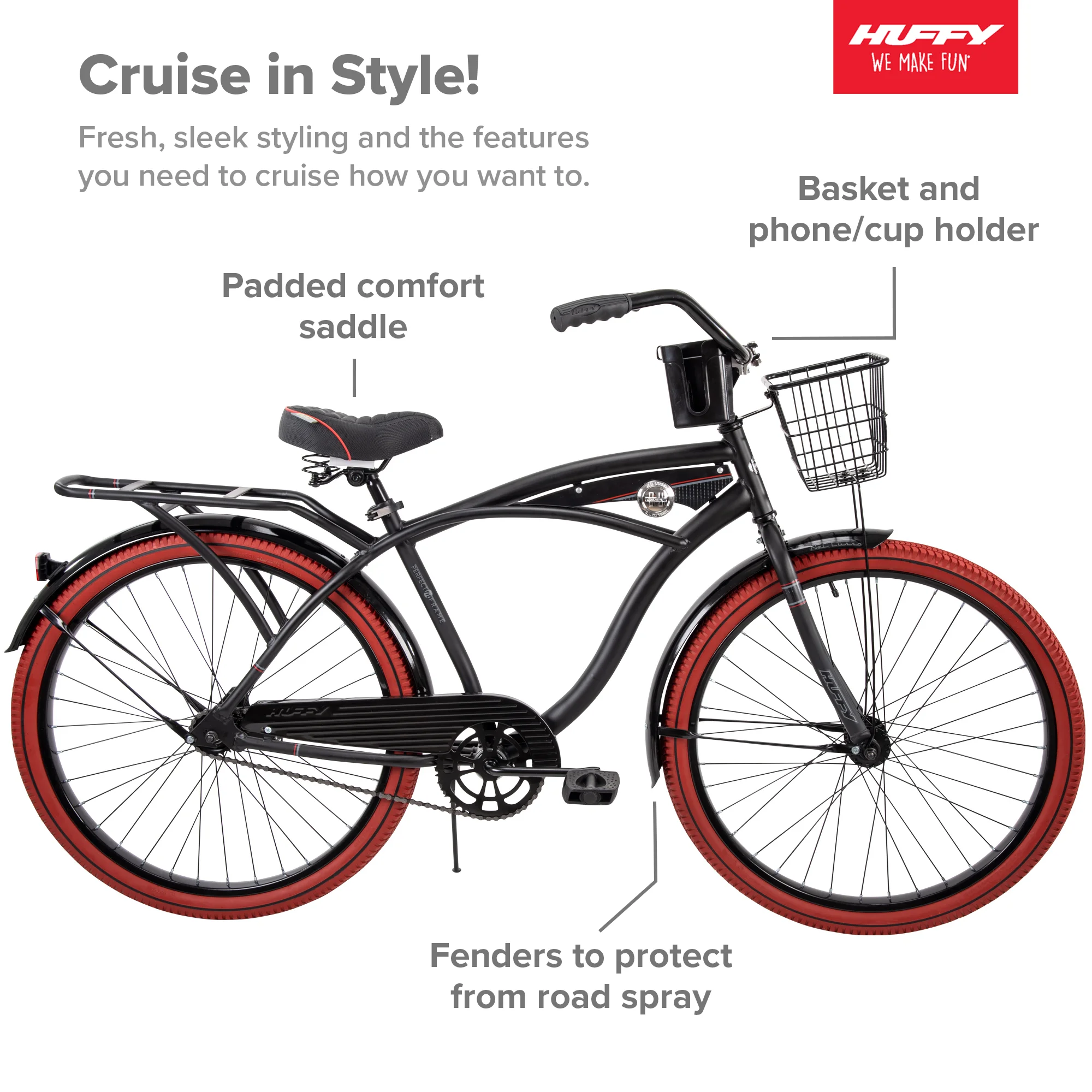 - Description: stylish, 26" Huffy cruiser bike has plenty of comfort features and accessories