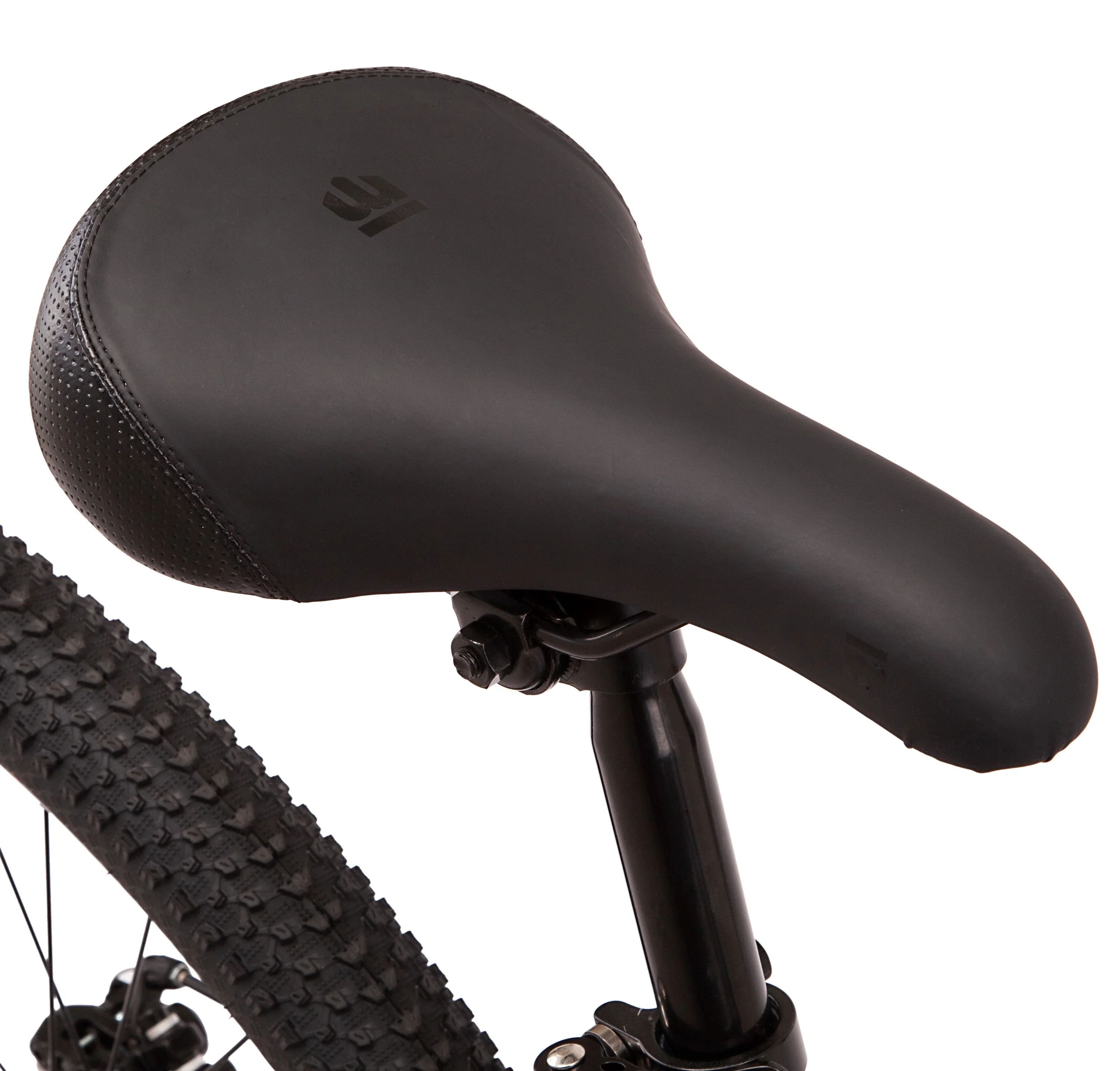 - Alloy double wall rims with 2.3-inch wide mountain tires provide lightweight strength and improved traction.