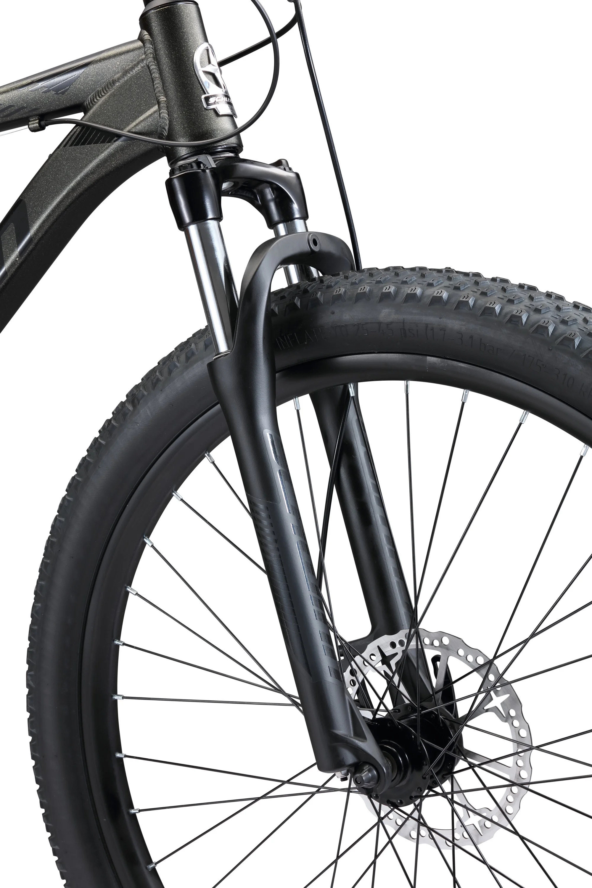 - 100 mm travel front suspension fork with lockout absorbs bumps on the trail for a more comfortable ride.