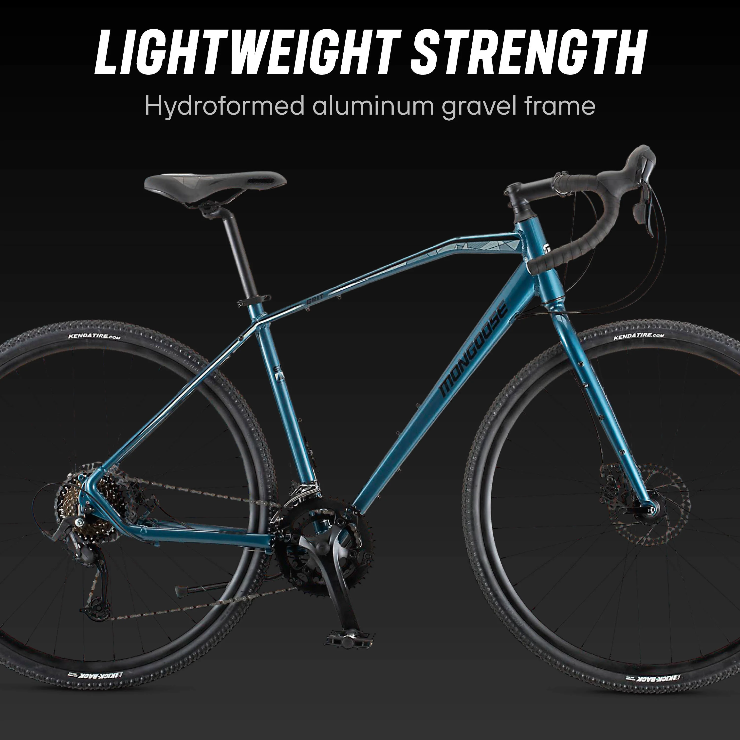 - Mongoose hydroformed aluminum gravel frame is lightweight and durable, with go anywhere capabilities. 700c wheels fit riders 64 to 74 inches tall.
