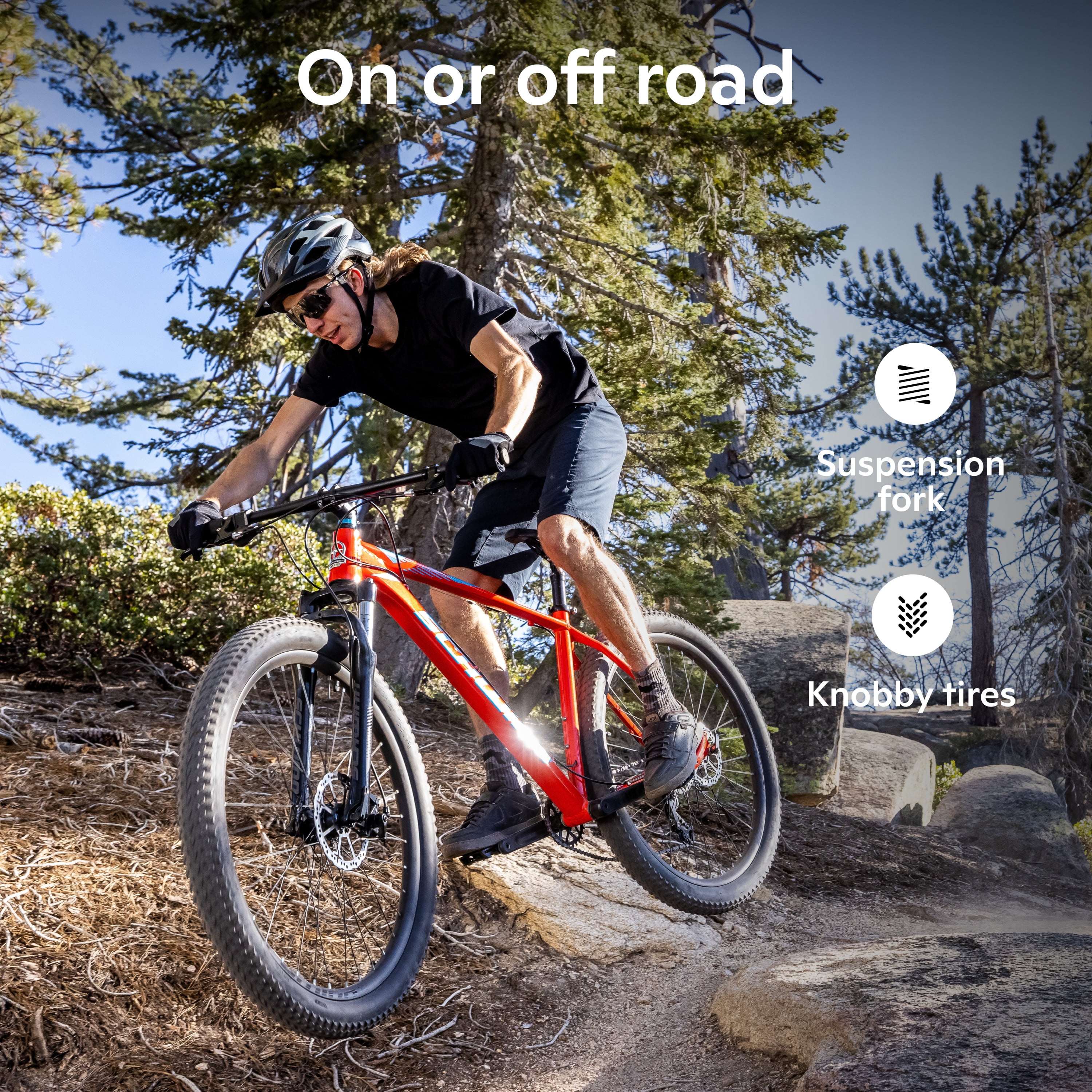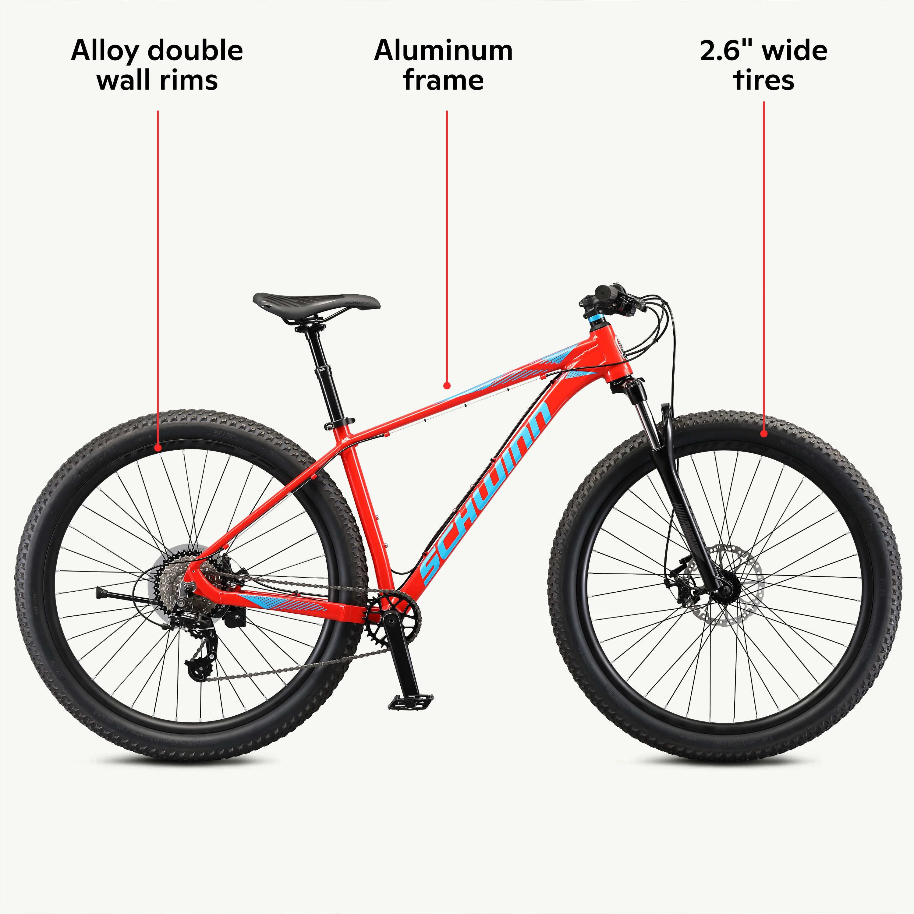 - Alloy double wall rims provide lightweight durability while 2.6 inch wide mountain tires let you roll over just about anything.