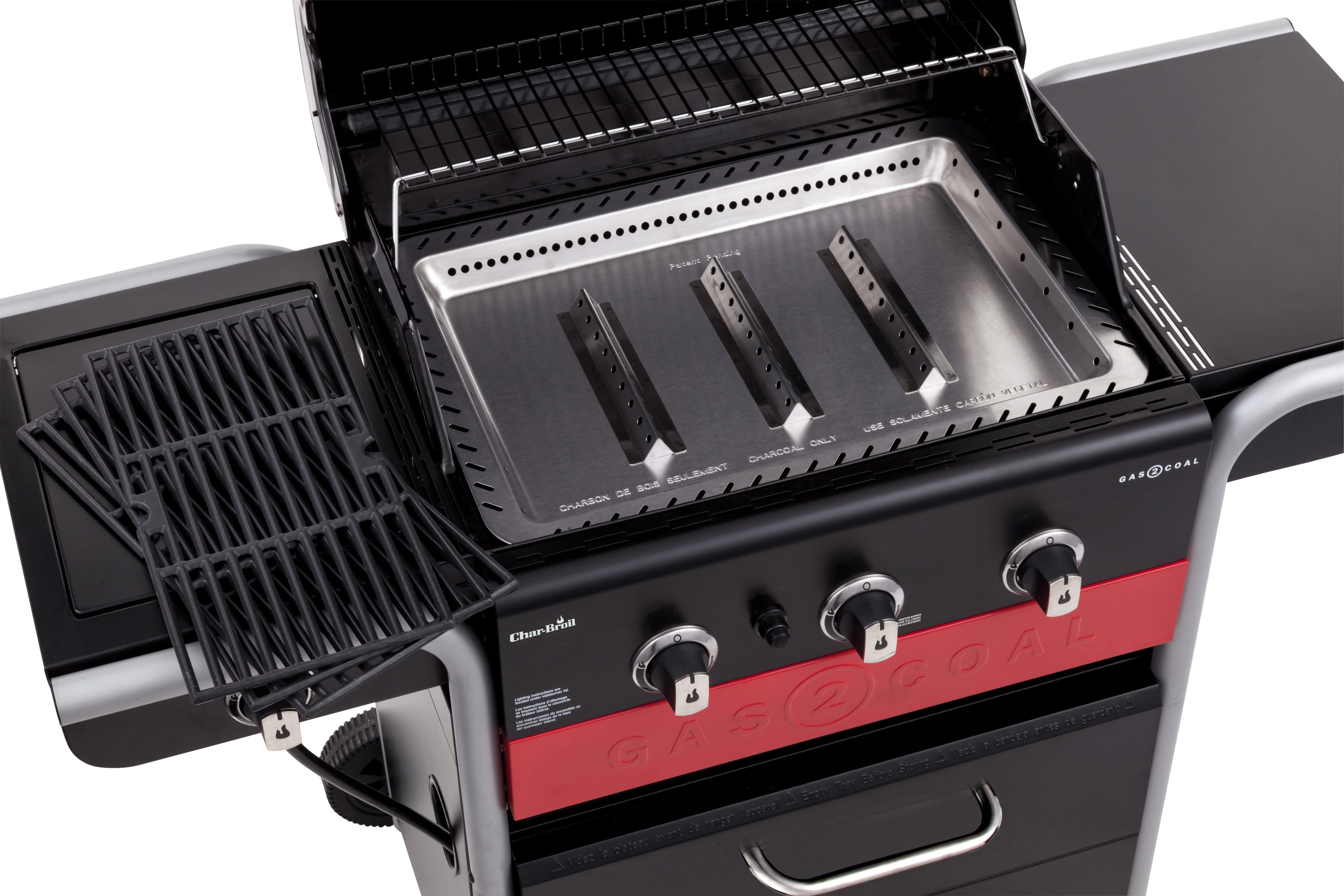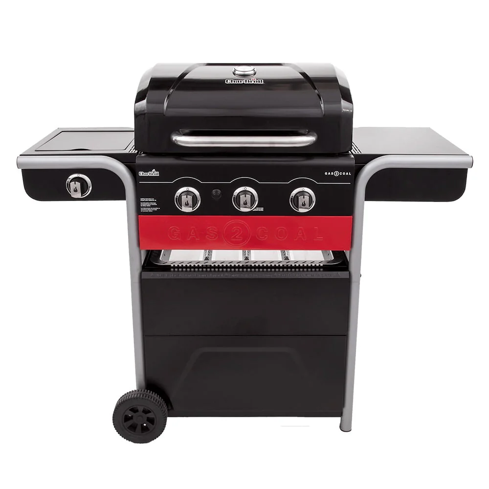 Enjoy the convenience of gas and flavor of charcoal with this combination Char-Broil Gas2Coal 3-Burner Liquid Propane and Charcoal Combination Cart-Style Grill 40,000 BTU grill. It quickly converts from propane gas to charcoal. Simply place the patented charcoal tray over the burners and load your favorite charcoal. It's easy-to-use, helps to reduce flare-ups and allows your charcoal to burn more efficiently. In-line stainless steel burners and heat tents are rust resistant and can stand up to the elements. The removable porcelain-coated cast-iron grates are durable, prevent food from sticking and easy to clean. 420 square inches of cooking space allows you to grill up to 25 burgers. Electronic ignition sparks easy starts and a temperature gauge monitors internal heat. A 12,000 BTU side burner heats your sides or sauces. Fixed side shelves offer prep space for seasonings, utensils or keeping condiments close by. A lid-mounted temperature gauge allows you to keep track of pre-heat status and monitor the inside temperature of your grill.