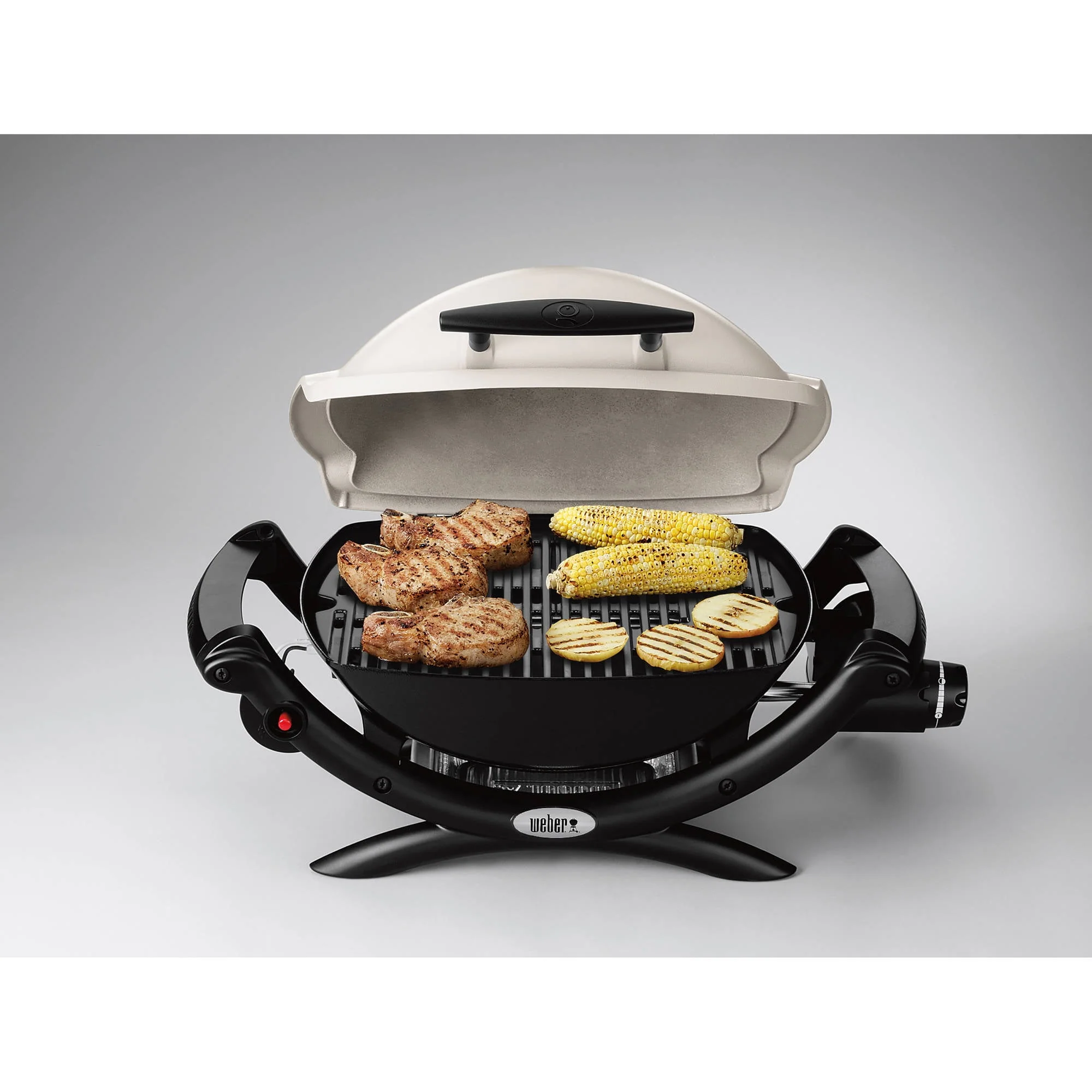 Weber Q 1000 Portable Propane Gas Grill - Titanium - 50060001. 50060001. Portable Gas Grills. Ready, set, grill on the go! The Weber Q 1000 portable gas BBQ grill offers 189 square inches of cooking space to create the grilled foods you love anytime, anywhere. Weber Q gas grills are perfect for tailgating, camping or small spaces like apartment balconies. With the push of a button, the grill ignites quickly and easily. The durable stainless steel burner produces 8,500 BTUs and the infinite control burner valve allows you to set it to the precise temperature you need with an easy-to-use knob. This Weber portable gas grill features a two-piece, porcelain-enameled cast iron cooking grate that heats evenly across its surface. It also features a cast aluminum lid and body with drip ducts and a sturdy glass-reinforced nylon frame and handles. A removable grease catch pan is included to make clean-up easy. This Weber Q 1000 operates on a portable 14. 1 or 16. 4 ounce propane cylinder (not included). An optional 20-lb tank adaptor hose is available as an accessory for those times you need to feed larger groups. Weber Q recipe booklet is included....