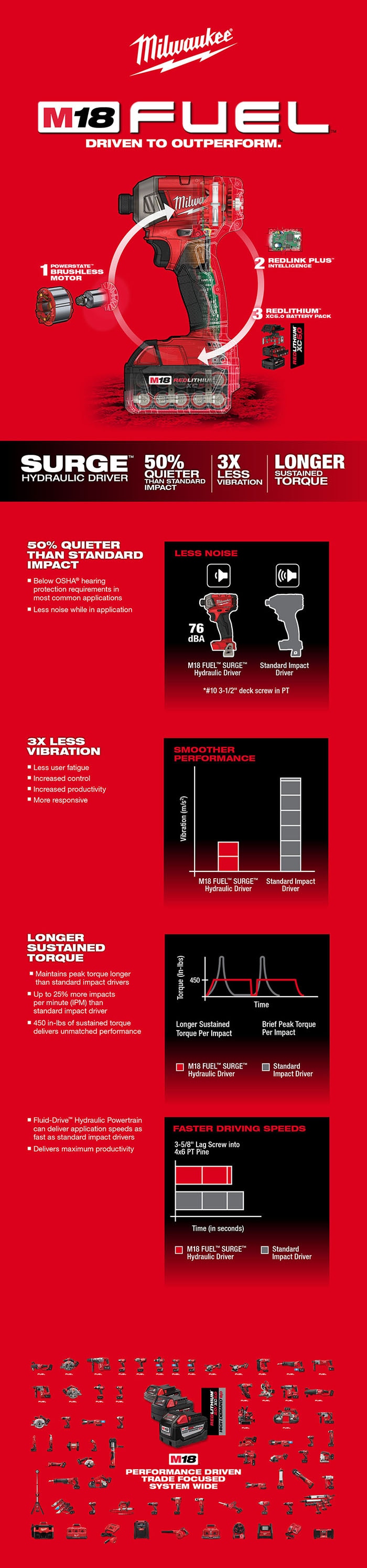 The Milwaukee M18 FUEL SURGE 1/4" Hex Hydraulic Driver is the quietest cordless fastening solution on the market. With Milwaukee's new FLUID-DRIVE Hydraulic Powertrain, users will experience up to 50% quieter operation, 3X less vibration for smoother operation, and faster driving speeds compared to standard impacts. The POWERSTATE Brushless Motor delivers up to 0-3,000 RPM with constant power output to drive screws faster. REDLINK PLUS Intelligence is the most advanced electronic system on the market, preventing damage to the tool and battery caused by overloading or overheating. The 4-Mode DRIVE CONTROL provides greater control over output speed and power for greater versatility. Self-Tapping Screw Mode is designed to reduce walking when starting self-tapping screws as well as reduce overdriving, breaking, and stripping out screws. The Milwaukee M18 REDLITHIUM XC5.0 Ah Battery Pack and the Milwaukee M18 REDLITHIUM CP2.0 Ah Battery Pack delivers up to 2.5X more runtime, 20% more power, and 2X more recharges than standard lithium-ion batteries.