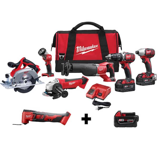 Includes: (1) M18 hammer drill/driver (2607-20), (1) M18 sawzall reciprocating saw (2621-20), (1) M18 6 in. circular saw (2630-20), (1) M18 in. hex impact driver (2656-20), (1) M18 cordless 4-1/2 in. cut-off / grinder (2680-20), (1) M18 led work light (2735-20), (2) M18 REDLITHIUM 3.0 Ah xc extended capacity battery (48-11-1828), (1) M18 and M12 multi-voltage charger (48-59-1812), (1) M18 18-Volt Lithium-Ion Cordless Oscillating Multi-Tool (2626-20), (1) M18 18-Volt Lithium-Ion XC Extended Capacity Battery Pack 5.0Ah (48-11-1850) & bag