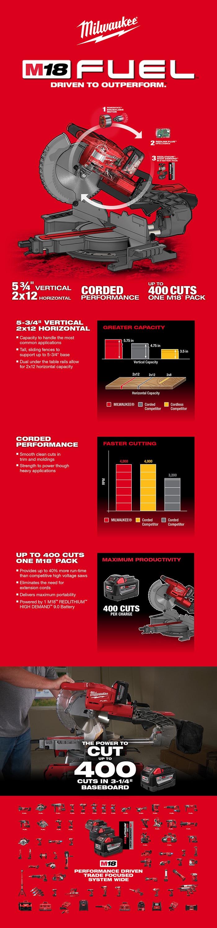Milwaukee m18 fuel 10in. Dual bevel sliding compound miter saw was designed to meet demanding needs of professional carpenters and remodelers. Delivering greater capacity than many corded 10 in. Sliding miter saws and powerstate brushless motor delivering corded cutting performance 2734 provides users a solution to replace ir corded miter saws. Redlithium hd9.0 battery pack delivers up to 400 cuts per charge making saw capable of lasting an entire day on site with only one (1) pack. Premium features like an adjustable stainless steel detent plate, cam locking miter system, easy access bevel adjustment lever, and both a detent override lock and chop lock lever located on front of tool m18 fuel miter saw is designed for easy operation and repeatable, accurate cuts.Milwaukee cordless m18 fuel 8-1/4in. Table saw with one-key delivers power of a 15 amp corded saw with 24-1/2 in. Of rip capacity and up to 600 in. Ft. Of cutting per charge.