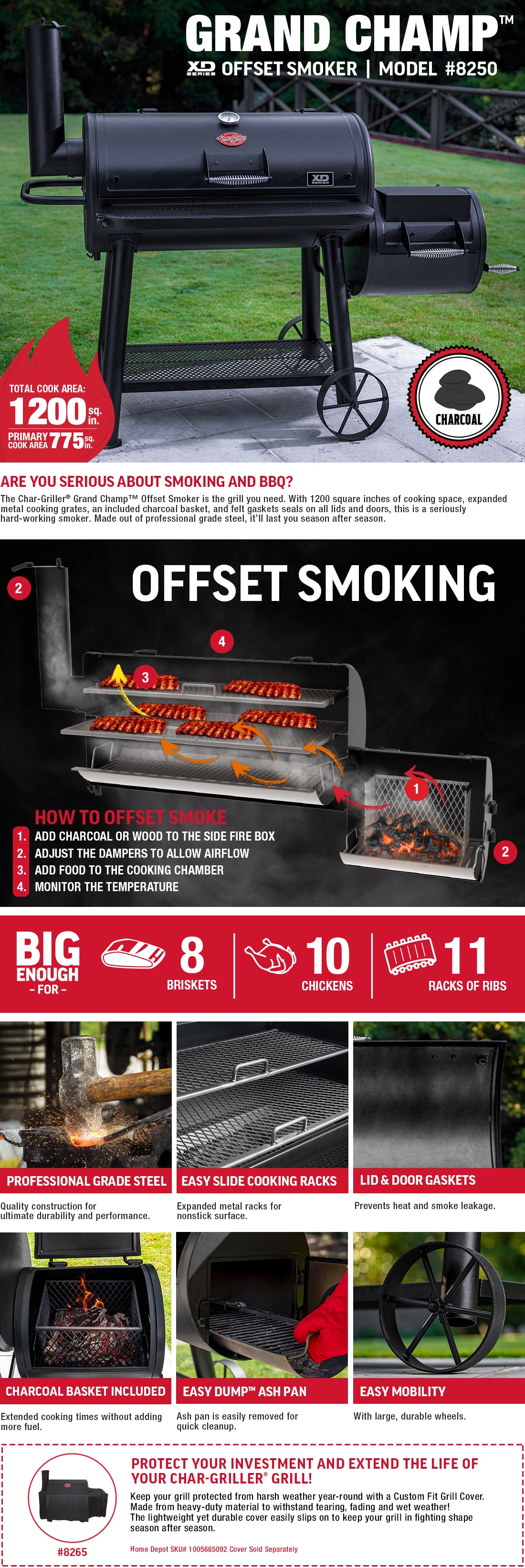 Protect your investment and extend the life of your Char-Griller Grand Champ Charcoal Grill with a custom-fit grill cover, sold separately. Model 8265, Home Depot SKU# 1005665092