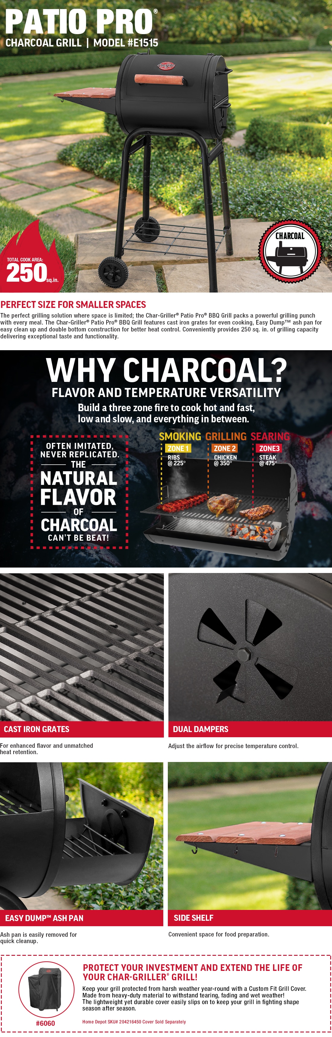 The flavor and aroma of a charcoal grill makes cooking with the Char-Griller Patio Pro Charcoal Grill a great pleasure. It has a cast iron cooking grate and 250 sq. in. of cooking space. You'll love the slide-out drawer for coal and ash access, and dual air vents that give you temperature control. Great meals and simple maintenance make this grill a pleasure to use. Other features include tubular steel cart construction, heavy steel body and side shelf.