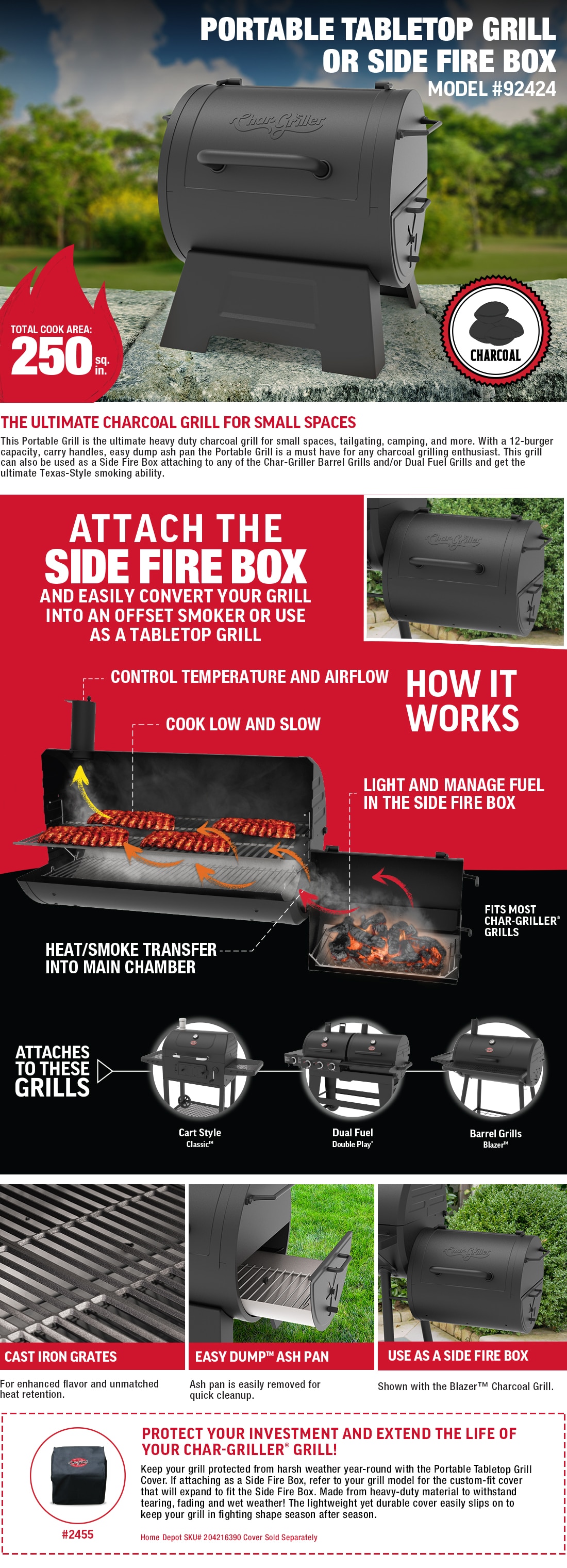 Protect your investment and extend the life of your Char-Griller Table Top Grill with a custom-fit grill cover, sold separately. Model 2455, Home Depot SKU# 1000583778