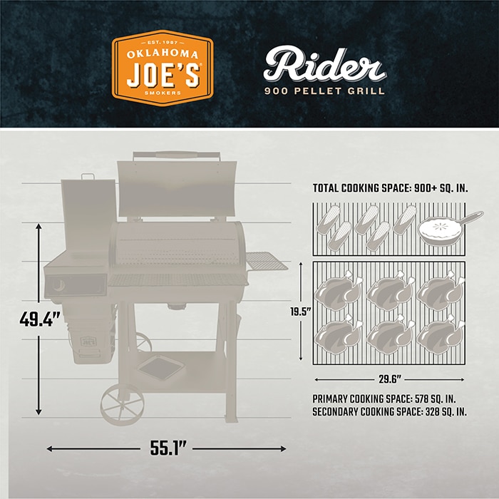 The Oklahoma Joe's Rider Gen2 DLX 900 Pellet Grill features the innovative Pit Control 2.0 system with category-first dual-sensor temperature control for incredible accuracy. Take advantage of the cooking grate and chamber-mounted temp sensors with Fire Focus, which optimizes temp control for your selected cooking style - whether it's low-and-slow smoking or high-heat grilling. Go from 200¡ãF for smoking to 650¡ãF for red-hot direct heat using the built-in Sear Mode. Plus, the newly upgraded Power Feed system boasts a high-torque auger motor that powers through pellets for incredible reliability and performance, and the 20 lbs. capacity QuickDraw Hopper provides easier storage, removal and swaps.