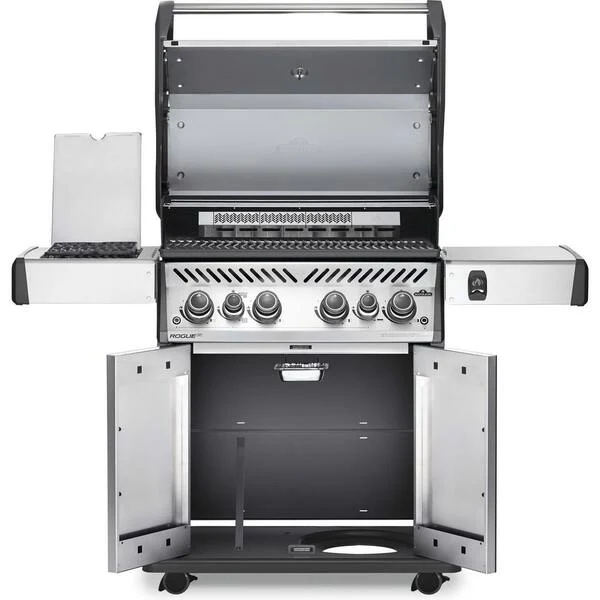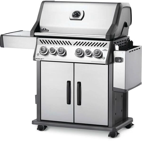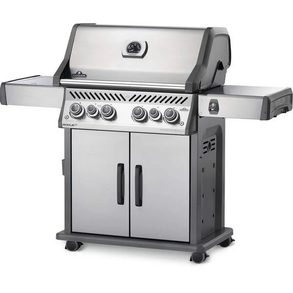 The Napoleon Rogue SE 525 Stainless Steel Propane Gas Grill with Infrared Side Burner and Rear Burner is a durable stainless steel grill. Featuring four main burners, a rear rotisserie burner, and a high top lid, this grill has everything you need to create gourmet meals. Sear restaurant-style steaks on the sizzle zone side buner, while generous side shelves provide plenty of prep space. Rogue SE models boast exclusive features including an integrated bottle opener, a high-top lid, and a sleek new control panel with backlit, ergonomic knobs. No other grill gives you such versatility with an affordable price and high-quality components. So get out there and grill different. Go, Rogue.