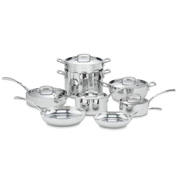 This 13-piece set is the home chefs dream of stainless cookware. These multifunctional and elegant pieces. Set includes 1 Qt. Saucepan with cover / 2 Qt. Saucepan with cover / 3 Qt. Saute Pan with helper handle and cover / 8 in. French Skillet 10 in. French Skillet / 4 Qt. Dutch Oven with cover / 8 Qt. Stockpot with cover / 24 cm Pasta Insert (fits 8 Qt. Stockpot)go anywhere a cook desires on the stove, under the broiler or right into the oven. The set offers everythingfood lovers need to create world-class meals at home.