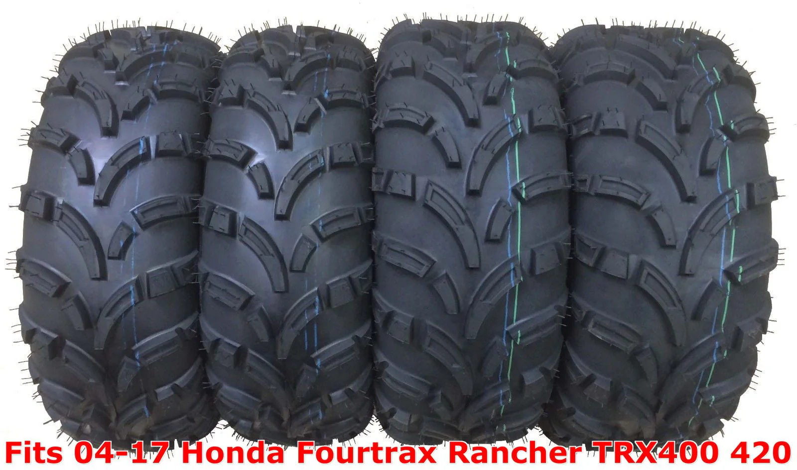 Full set (24x8-12 & 24x10-11) fit for 04-17 Honda Fourtrax Rancher TRX400 420. Original equipment tread design. Durable, light weight, smooth rolling design provides quicker acceleration and braking. Deep, widely spaced tread bras shed mud. Excel in a wide variety of terrains. Heavy 6 ply rated nylon construction resists punctures and abrasions. Tread depth: 0.6" vs other similar pattern tires: 0.5" or less.