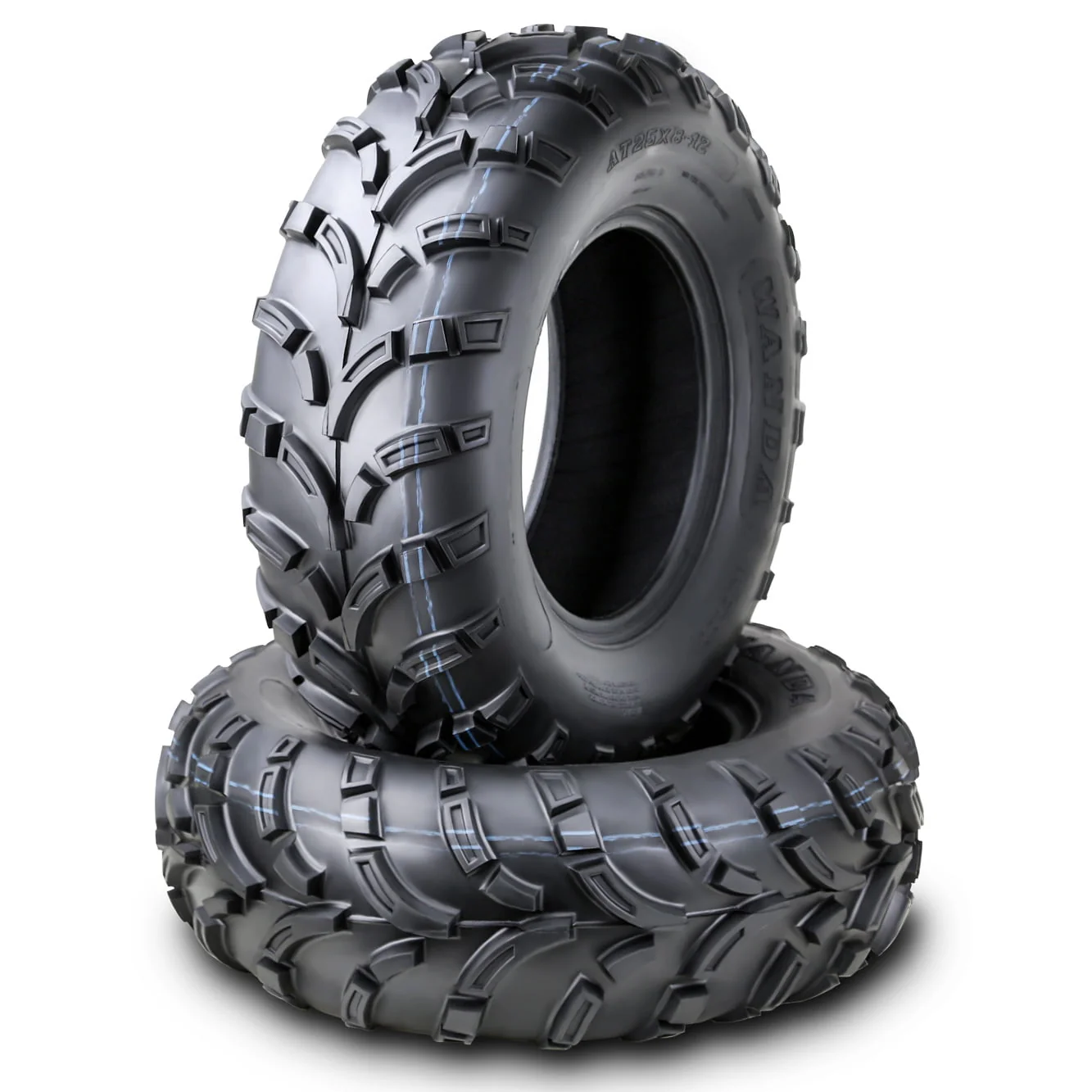 Set of two 25x8-12 6PR WANDA ATV tires fit for a variety of ATV applications. Durable, light weight, smooth rolling design provides quicker acceleration and braking. Deep, widely spaced tread bras shed mud. Excel in a wide variety of terrains. Heavy 6 ply rated construction resists punctures and abrasions. Tires only, wheels are not included.