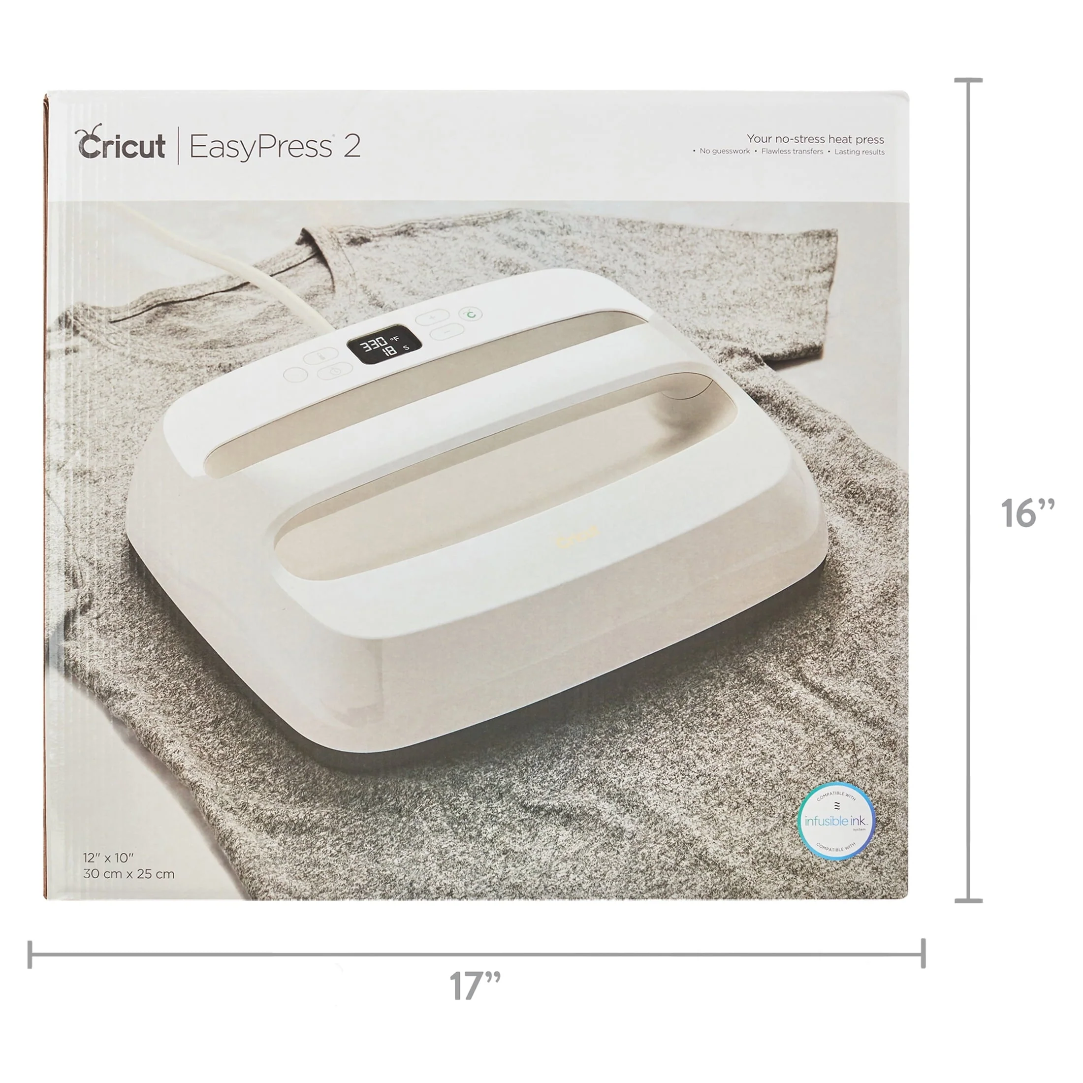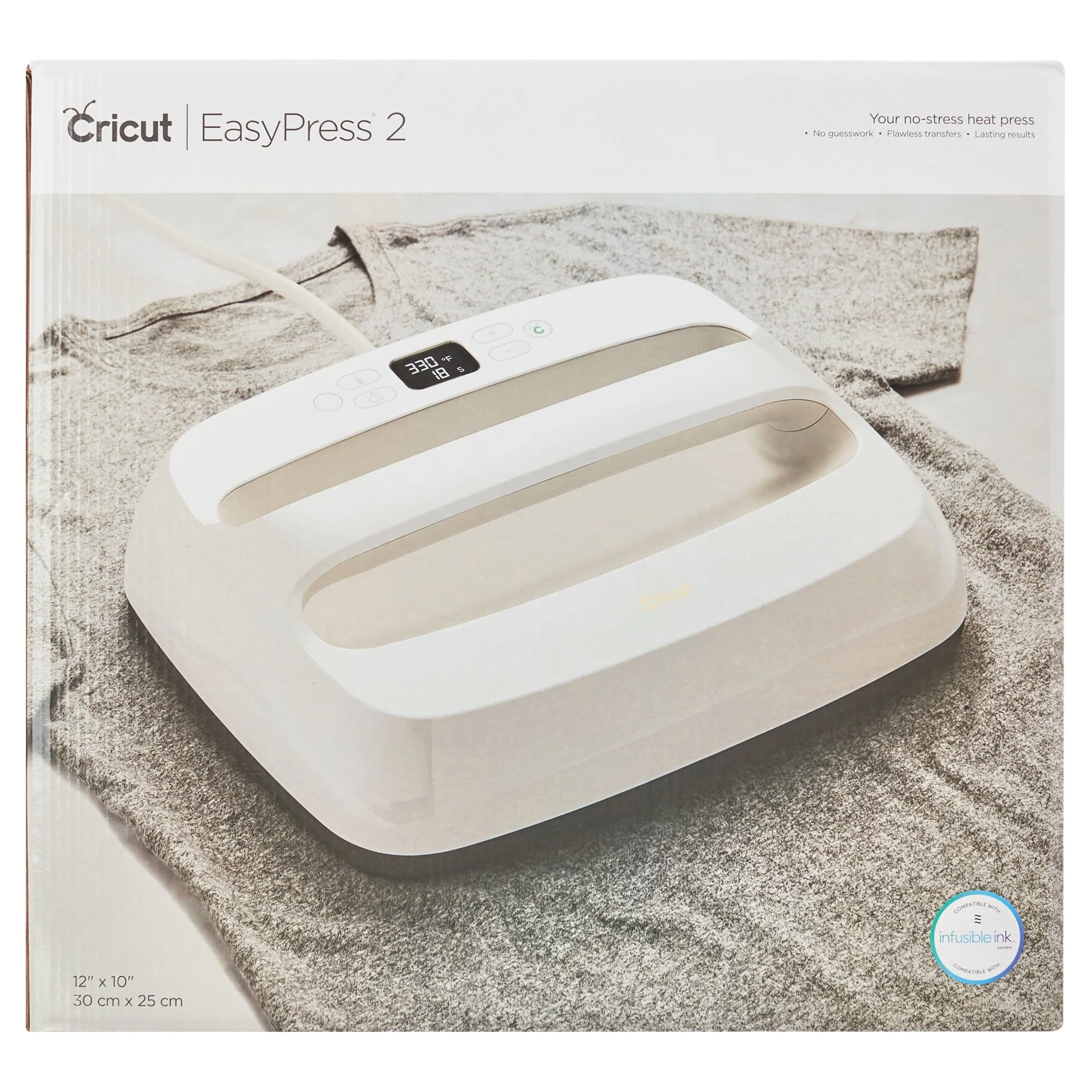 Bring on your larger iron-on projects! Enjoy heat-transfer perfection every time. Cricut EasyPress® 2 combines the speed of a heat press and the convenience of a household iron. Eliminate guesswork and get fast, effortless results that really last – even after repeated washes! Just enter the recommended time and temperature settings, apply heat, and when the beep sounds, you’re done! Its ceramic-coated heat plate is adjustable up to 400℉ (205°C). You'll love the safety features, including an insulated Safety Base and auto-shutoff feature. Plus it's super lightweight, unbelievably portable, easy to store, and compatible with all Infusible Ink™ products and most major brands of heat-transfer vinyl material. And of course, it's a perfect complement to Cricut® cutting machines. WARNING: Requires maximum input 120V outlet. Not recommended for use outside North America.