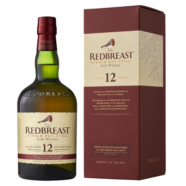 A well-balanced single pot still Irish whiskey, Redbreast 12 Year Old has been matured in a combination of bourbon and sherry casks, creating a sweet-and-spicy character. The nose holds aromas of sweet fruit, toasted oak and warm spices, and the palate offers notes of buttery hot-cross-buns, dried fruits, baking spices and spicy oak. REDBREAST 12 WHISKEY 750ML
