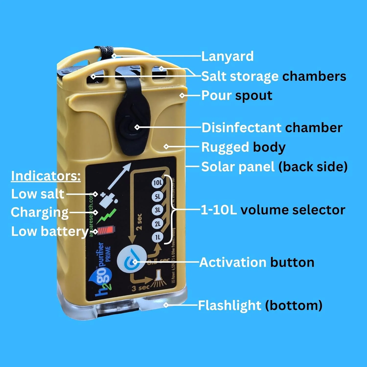 - BE READY TO GO – The H2gO Purifier weighs only 3.8 ounces and can fit in your pocket. The unit is rechargeable in the wild with its integrated solar panel. A single cup of salt will supply safe water for an entire year (at 5 gallons per day).