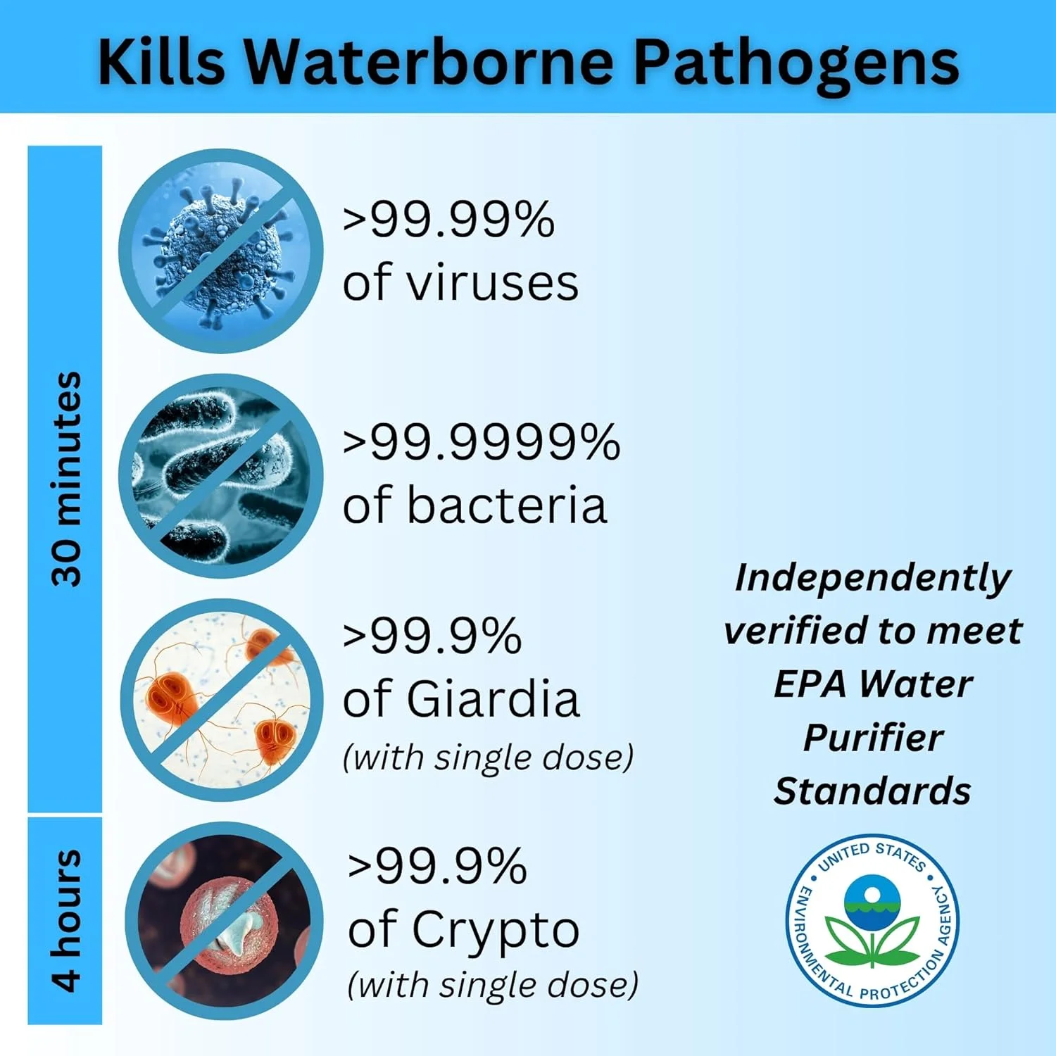 - KILL ALL GERMS – Proven effective against the tiniest of viruses, bacteria, Giardia, and Cryptosporidium in all water conditions. Specifically designed to handle the toughest water.