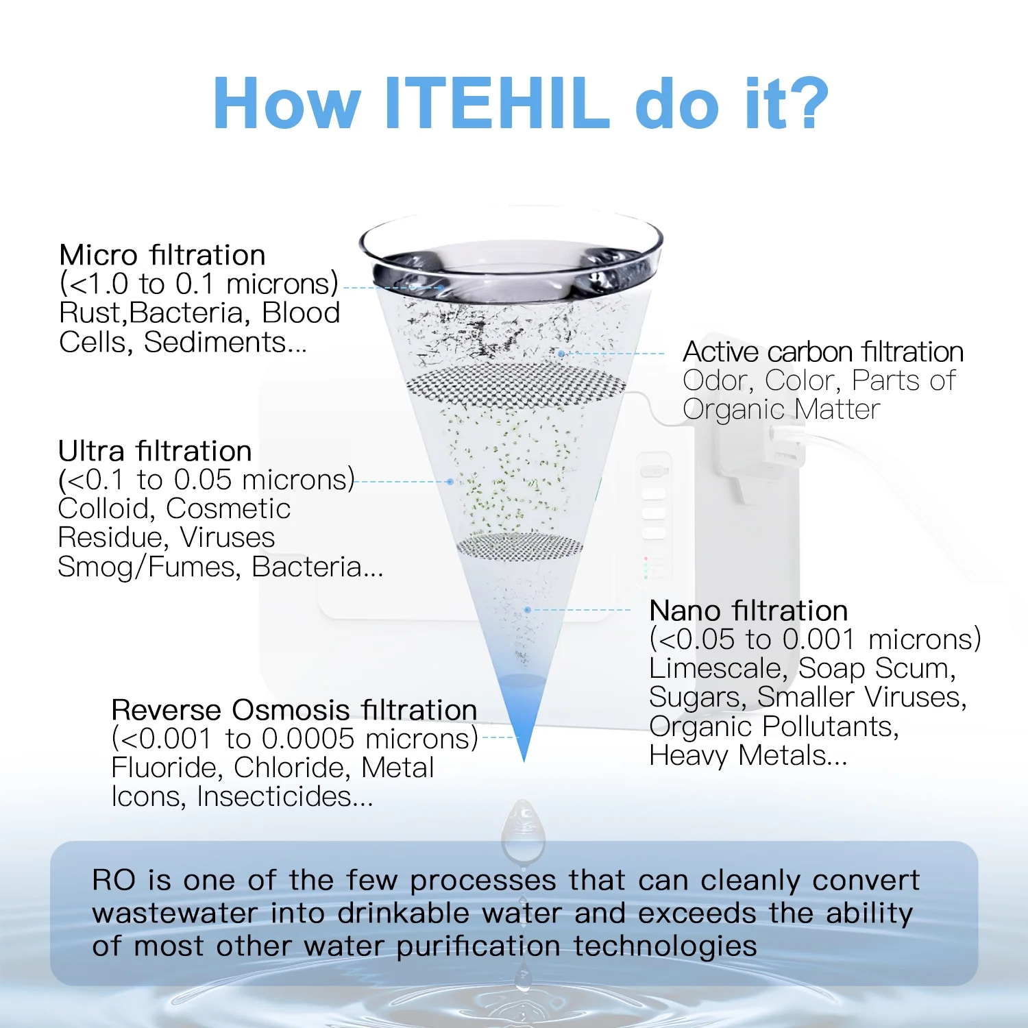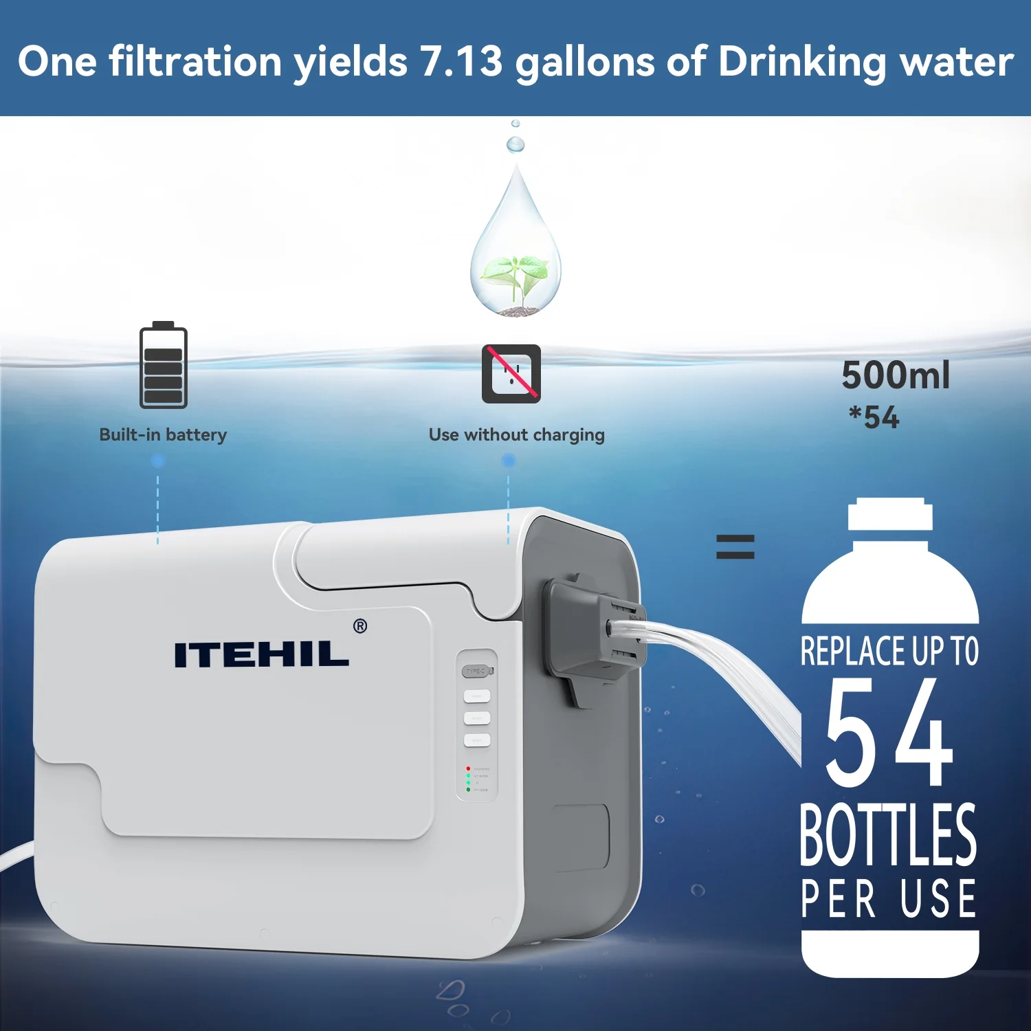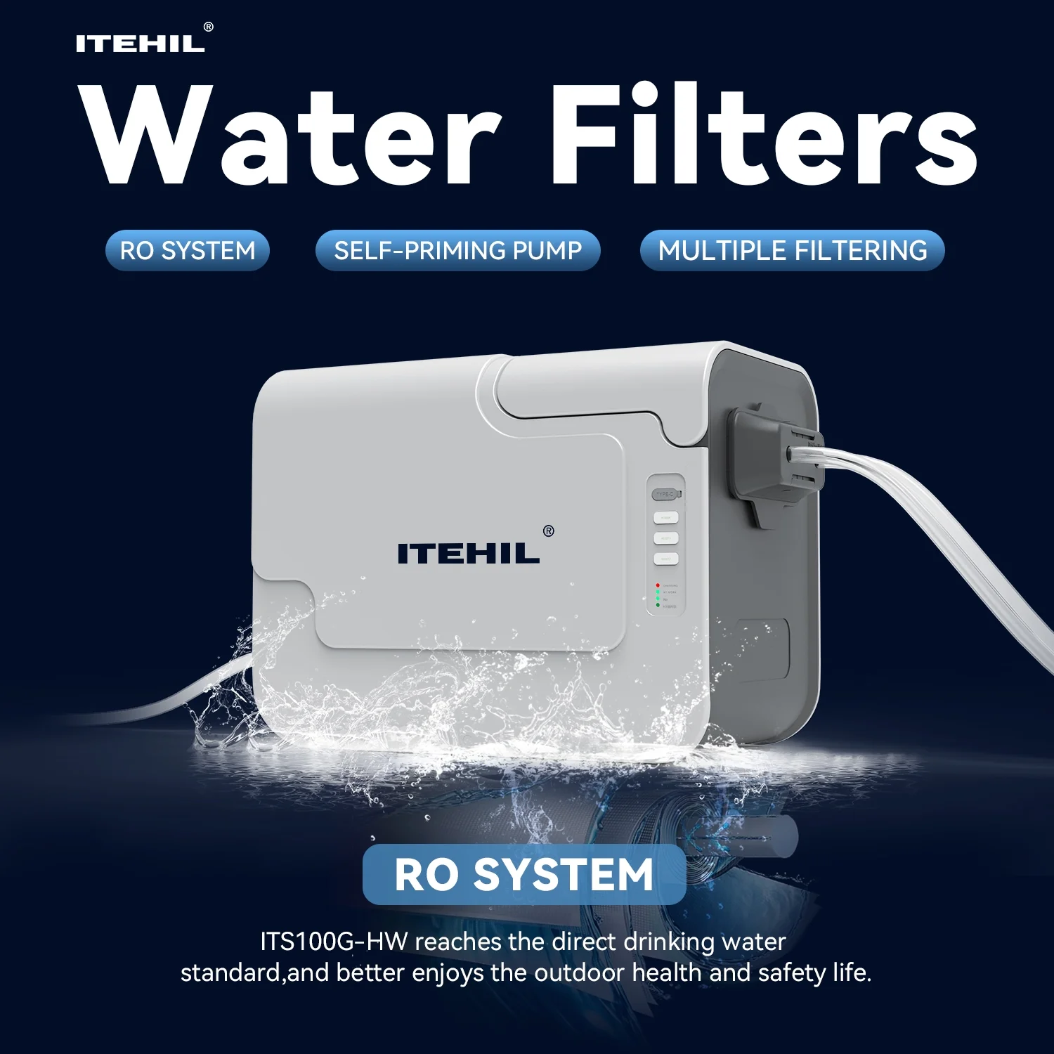 - Hybrid filter element combined with RO filter element purifies 99.99% of viruses, ensuring clean and safe drinking water while camping
