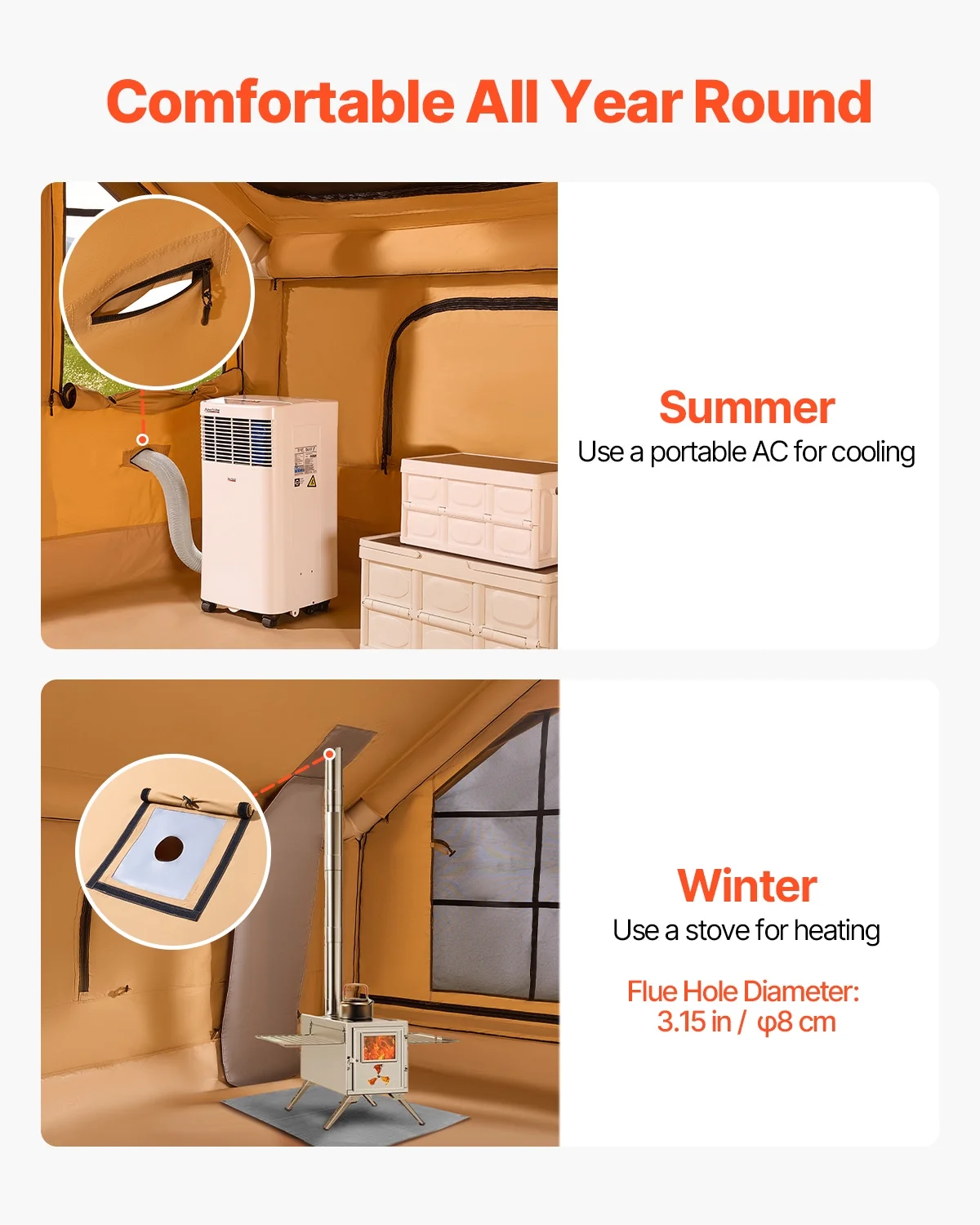 VEVOR Inflatable Tents for Camping, 5 - 8 Person Easy Setup Blow up Tent with Hand Pump, Luxury Glamping Tent with 2 Skylights, Canopy, Stove Jack 2 Doors & Mesh Windows (Storage Bag Included)