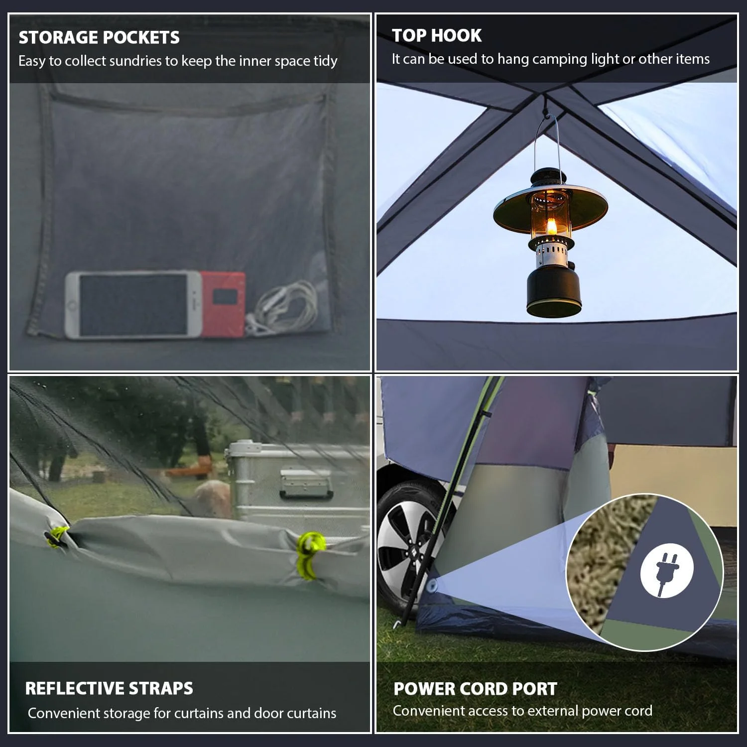 - 【SEAMLESS CONNECTION】Our SUV tent securely connects to your trunk, offering extra sleeping and storage space without any gaps; stay dry even during rainy weather when accessing items from your car, a E-port allow you connection to power outlets to keep your devices charged.