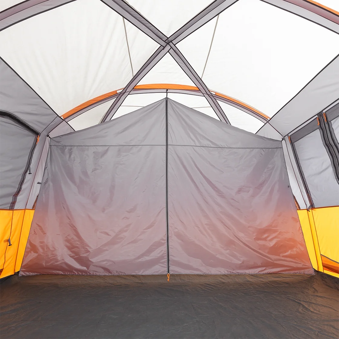 Give your family a tent they could not possibly grow out of! With a 16' x 11' floor space and a center height of 86", the CORE 12 Person Extra Large Straight Wall Tent allows your whole crew to stand, stretch, and move around with ease! The extra tall ceilings make it easy to change clothes and arrange your home away from home with space to spare! Enter from the front T-Door or back D-Door. Attach the included room divider to create separate living and sleeping spaces. Make one side or the other your private sleeping space (5.5' x 11') and use the rest of the space for gear organization (10.5' x 11'). Setup is simple with color-coded fiberglass poles, sleeves, and joints. The water repellent rainfly is removable in warmer weather to expose the mesh ceiling for panoramic views or star gazing on clear summer nights. All CORE Equipment tents feature CORE H20 Block Technology- water repellent fabrics with active bead technology for faster water runoff paired with sealed seams on rainfly, doors, and windows. The advanced venting system uses the adjustable air intake vent designed to draw in cool air from the ground while the mesh ceiling allows hot air to escape keeping you comfortable all season.