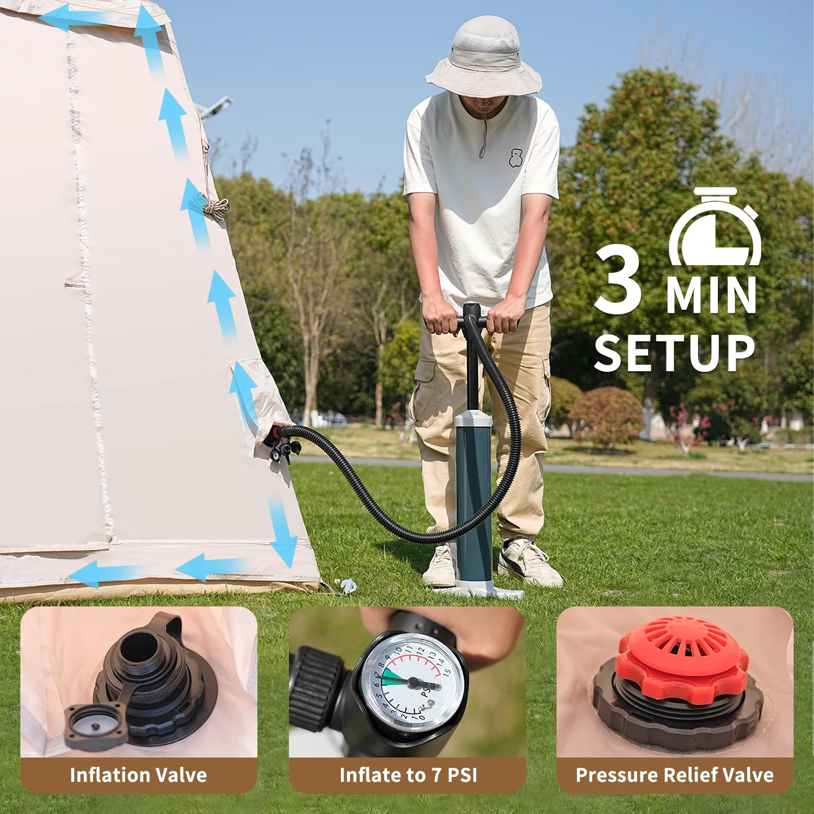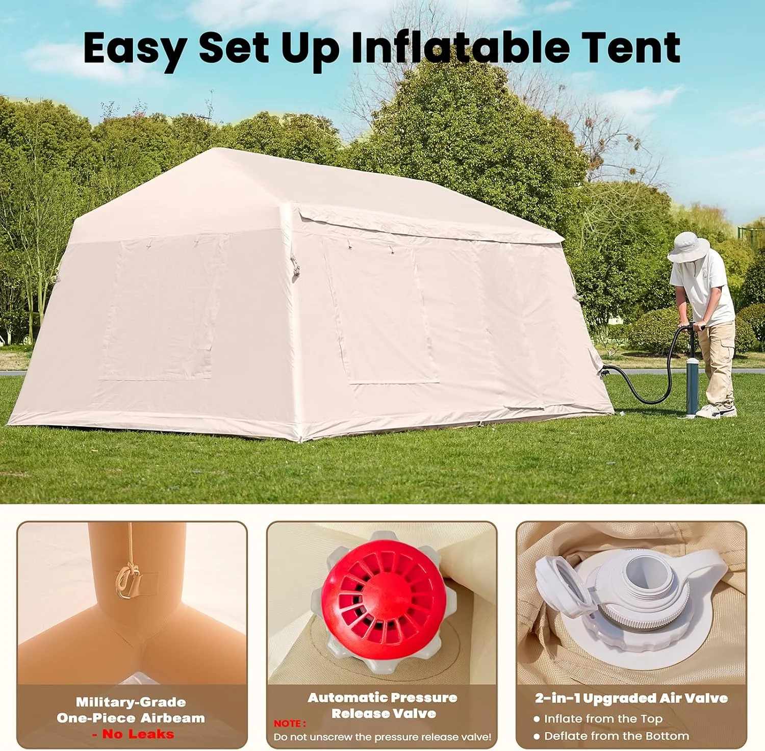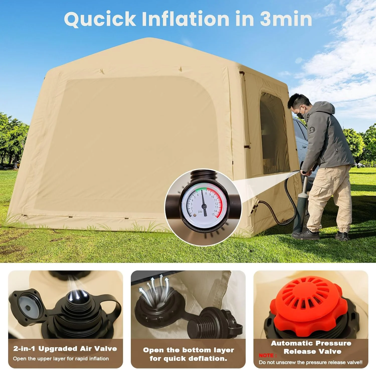 Quick-Setup Blow Up Tent :Inflates in just 5 minutes with the included high-pressure pump. No poles needed! This inflatable tent is perfect for beginners and families seeking hassle-free camping.