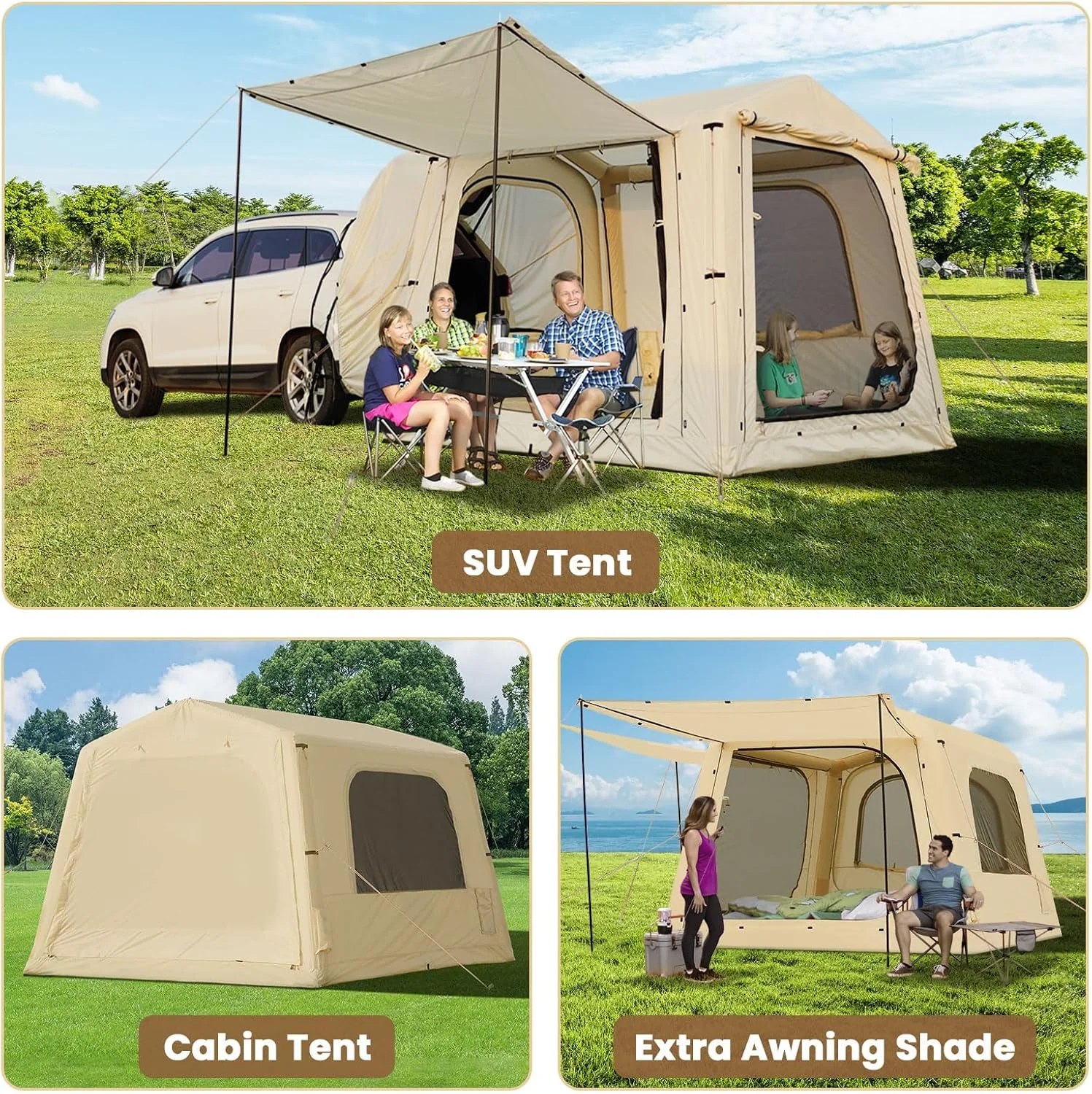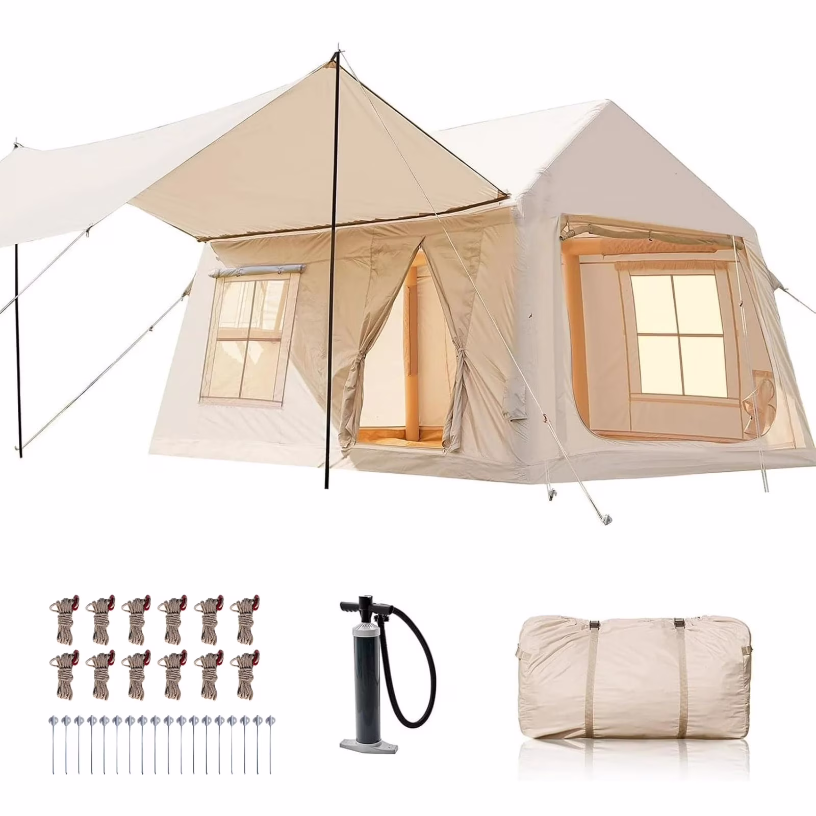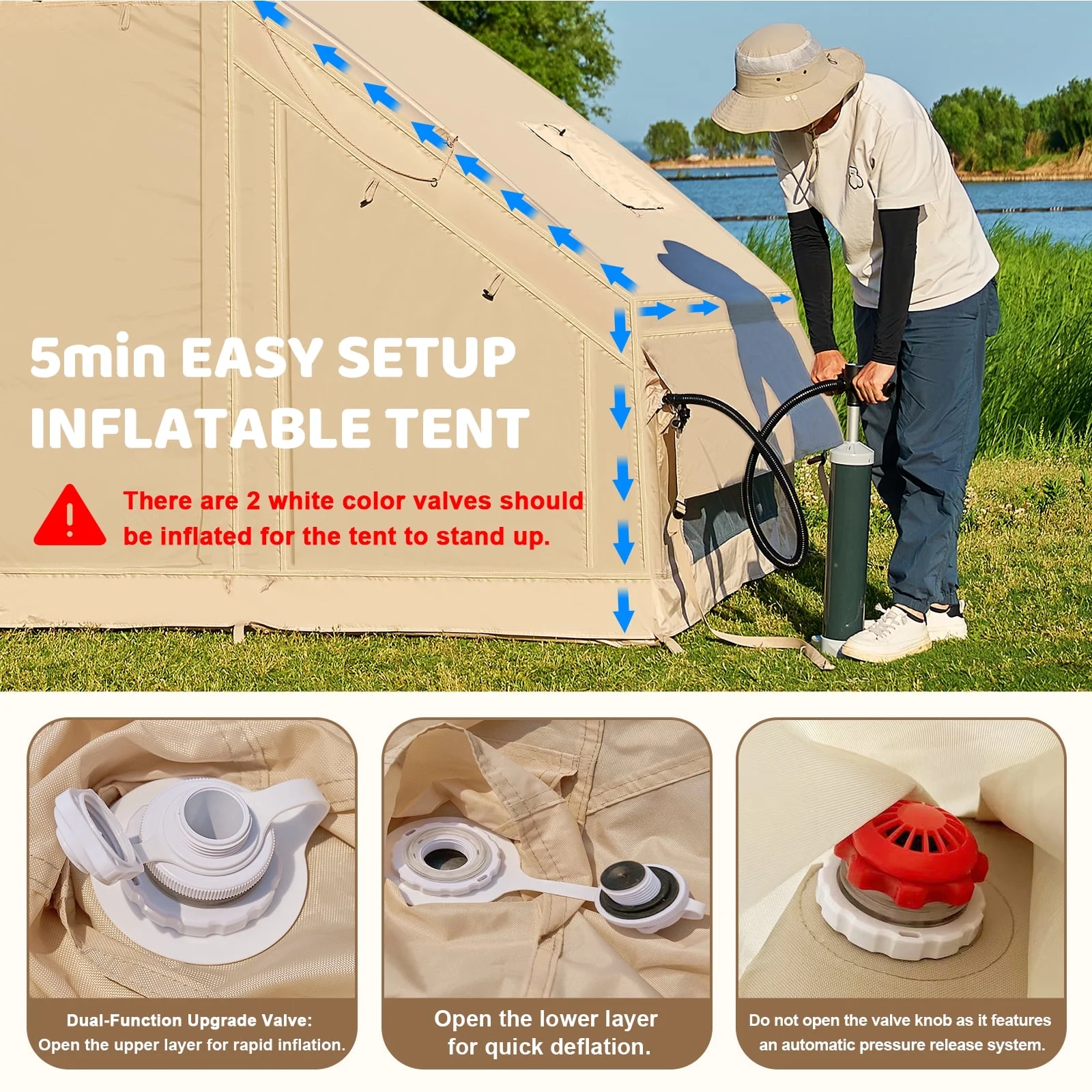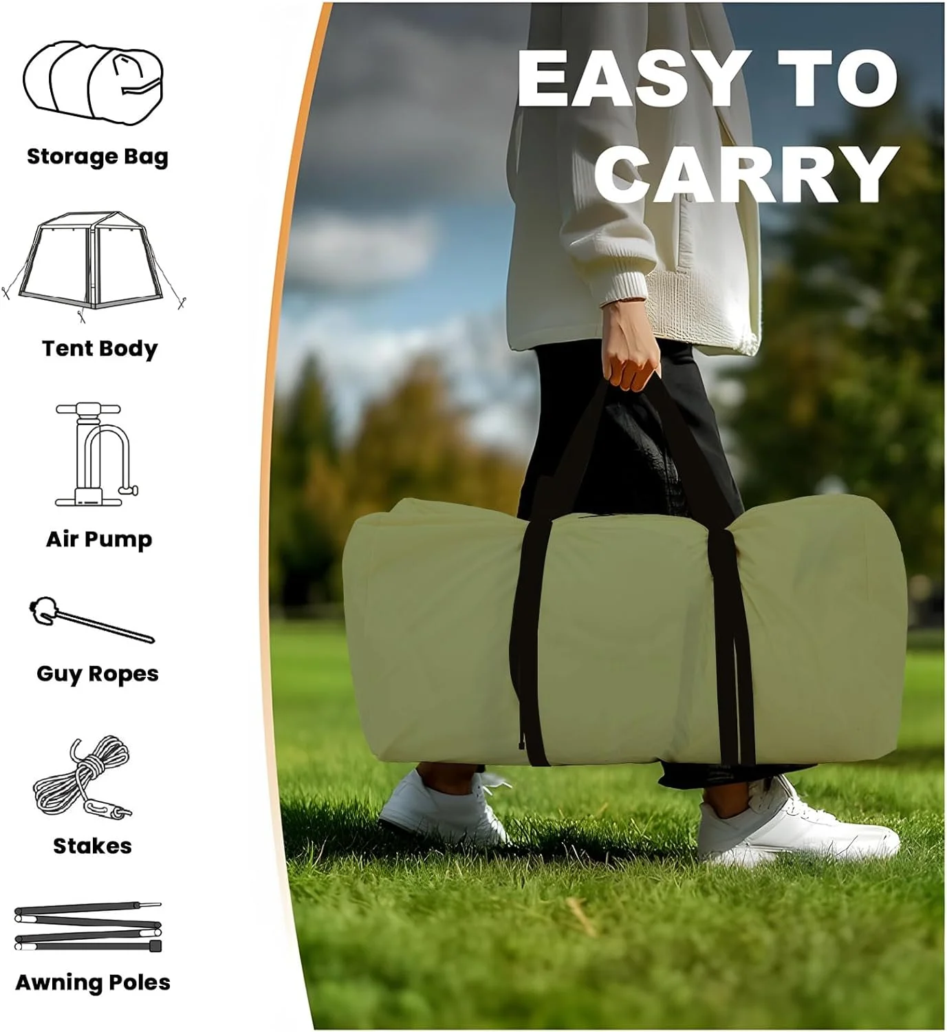 Quick-Setup Blow Up Tent :Inflates in just 5 minutes with the included high-pressure pump. No poles needed! This inflatable tent is perfect for beginners and families seeking hassle-free camping.