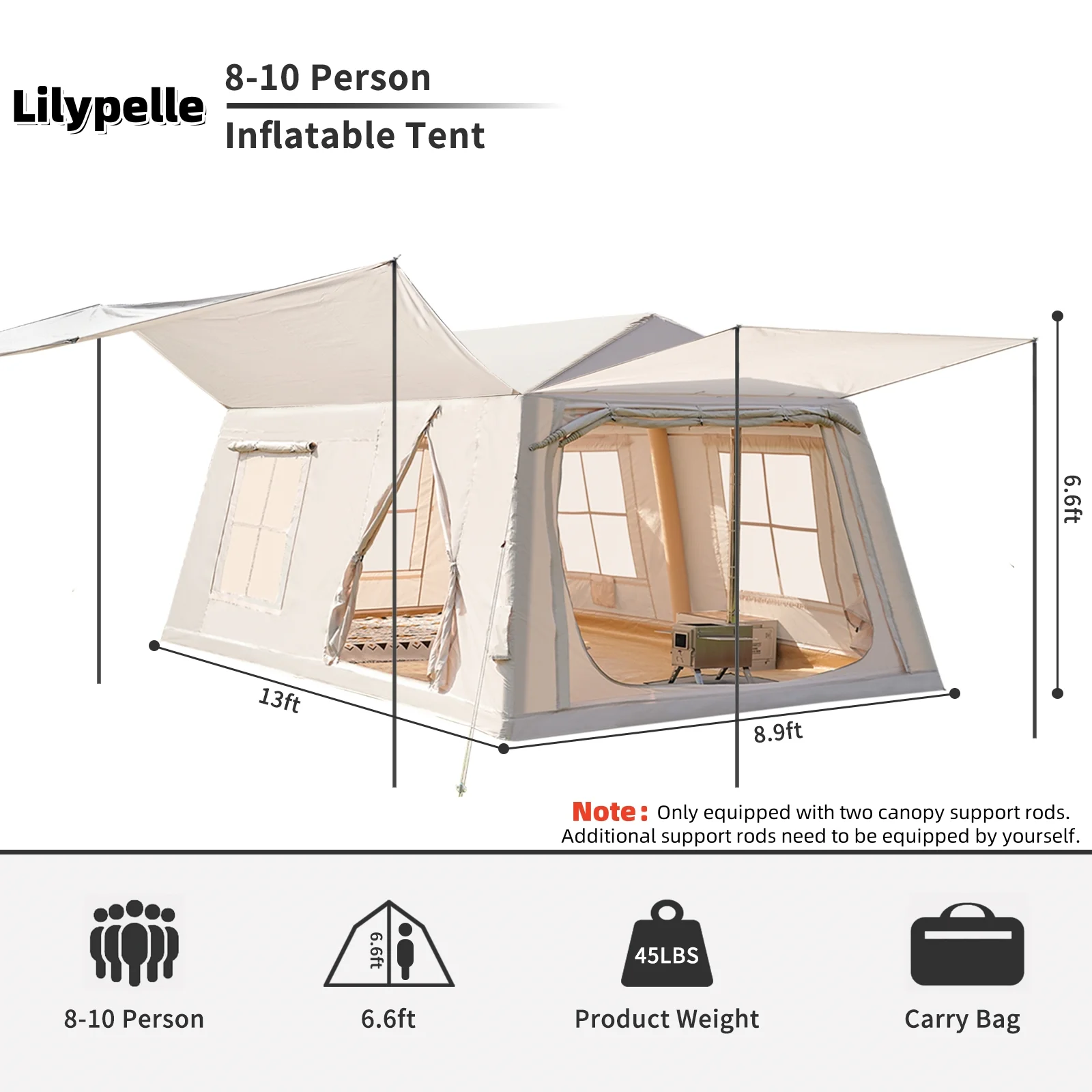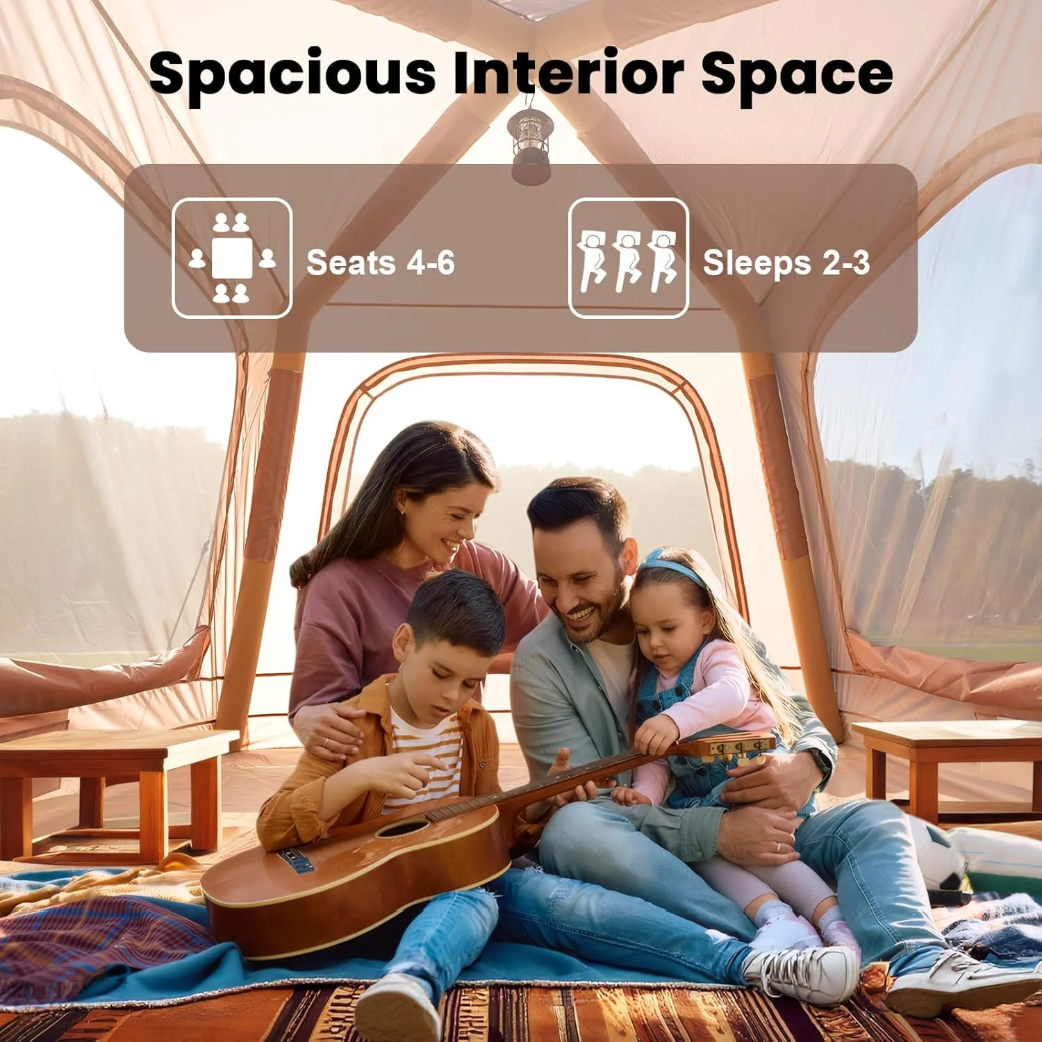 Spacious 4-6 Person Inflatable House :This inflatable tent house measures 9.8 ft × 6.9 ft × 6.4 ft, offering approximately 67.85 square feet of space. It comfortably accommodates up to 4 people for sleeping and can seat up to 6 people for activities, making it perfect for family camping trips.