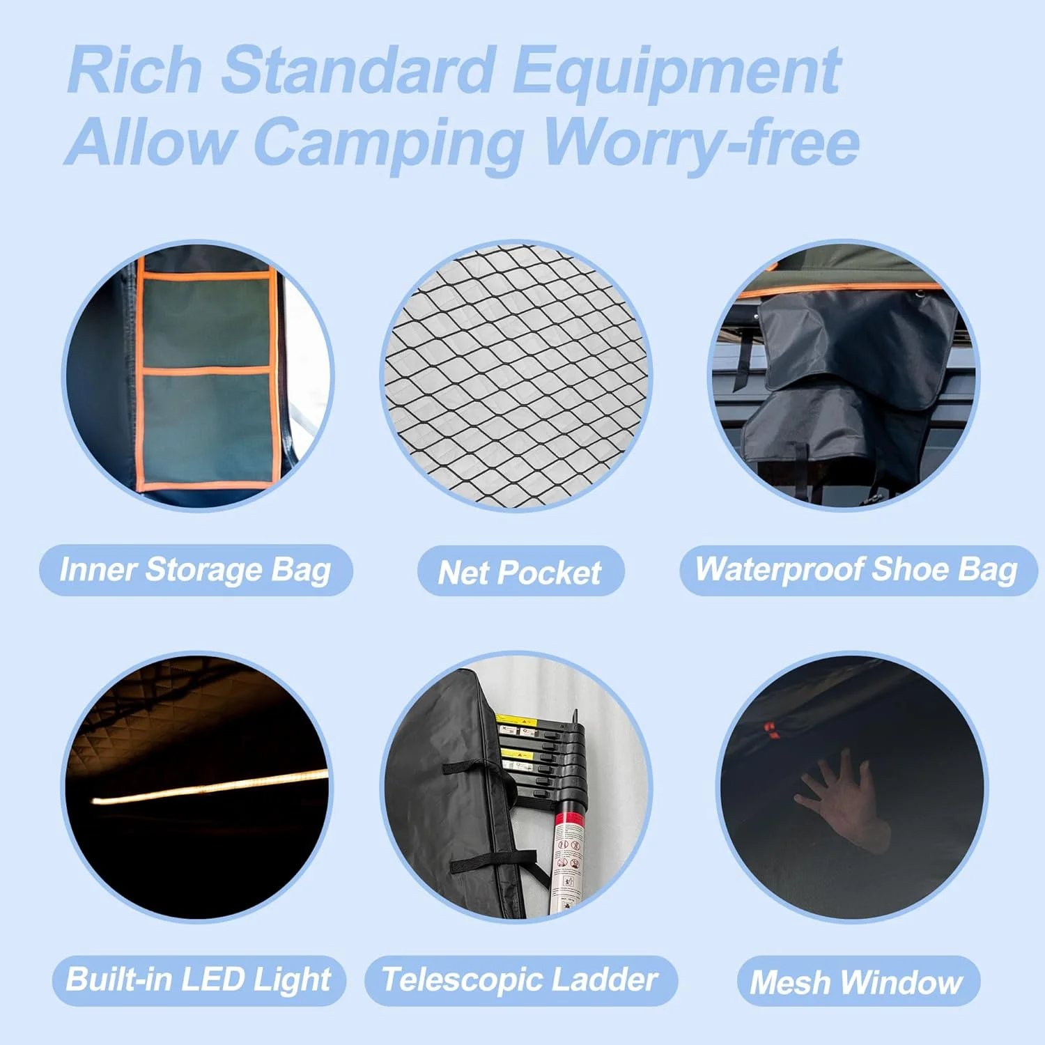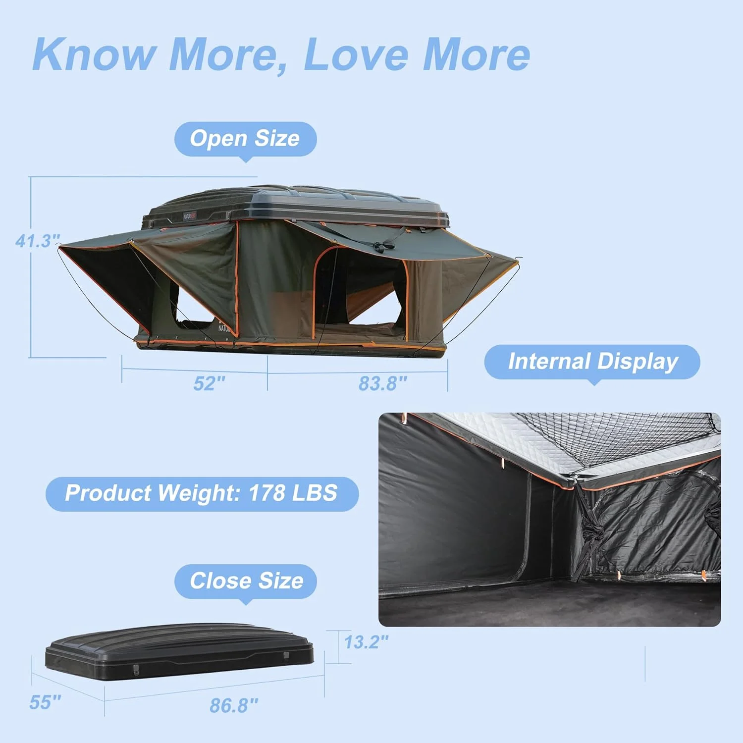 The tent is equipped with air conditioning and heater interfaces, allowing for year-round use with outdoor cooling or heating solutions.Constructed with a robust ABS shell that has undergone1000 hours of rigorous testing, this tent boasts significant resistance to corrosion, pressure, heat, and water, while also providing excellent sun protection. Its aerodynamic design reduces wind noise and resistance, enhancing your camping experience.The top luggage rod is versatile, supporting solar panels or toolboxes with a load capacity of up to100 pounds, making it perfect for all your camping gear.