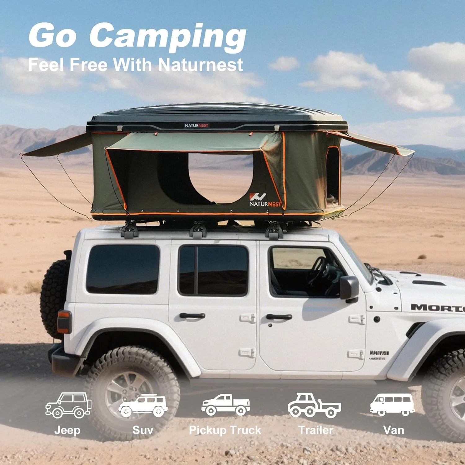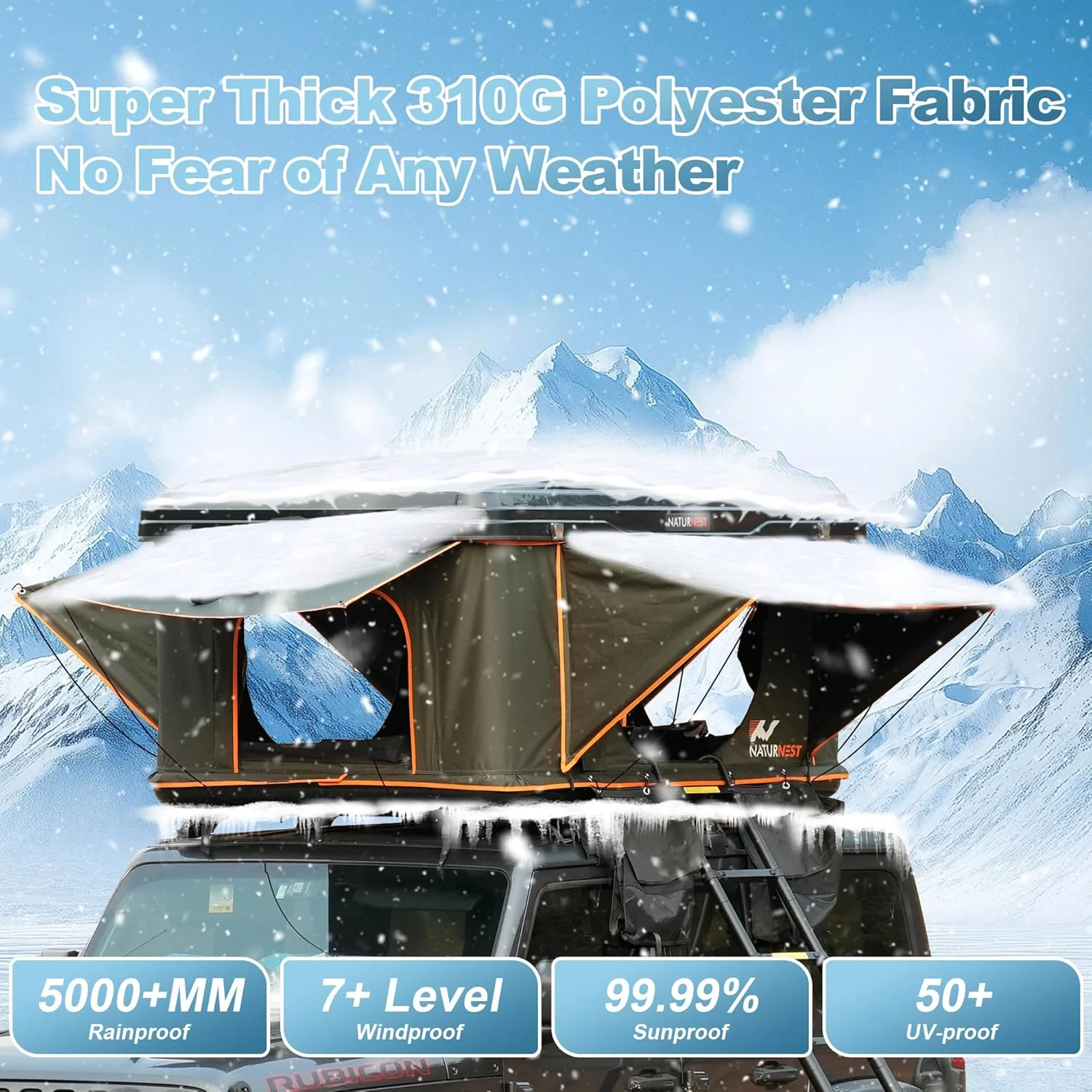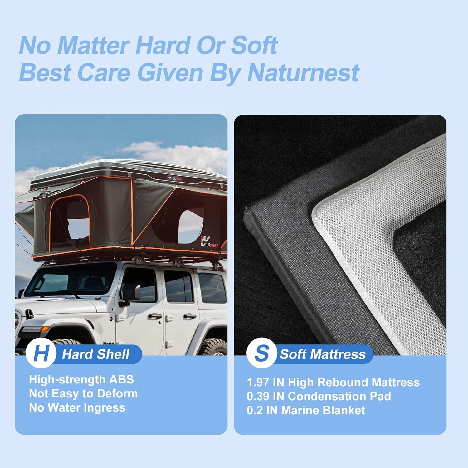 The Naturnest rooftop tent is designed for ultimate comfort and convenience during your outdoor adventures. It features a thick and warm three-layer mattress that ensures a restful sleep without the need for an additional mattress, incorporating a condensation pad and an ocean pad to effectively minimize moisture.