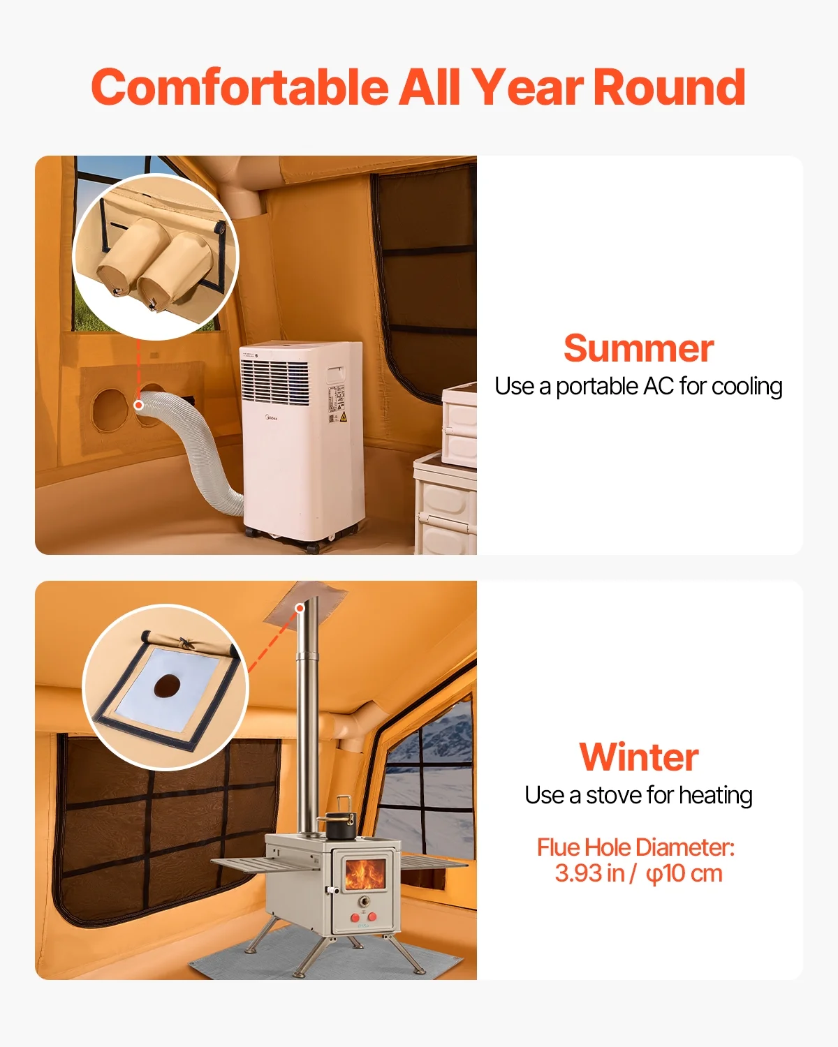 VEVOR Inflatable Tents for Camping, 8 - 12 Person Easy Setup Blow up Tent with Hand Pump, 4 Season Luxury Glamping Tent with 2 Skylights, Canopy, Stove Jack, 2 Doors & Mesh Windows(Include Storage Bag)