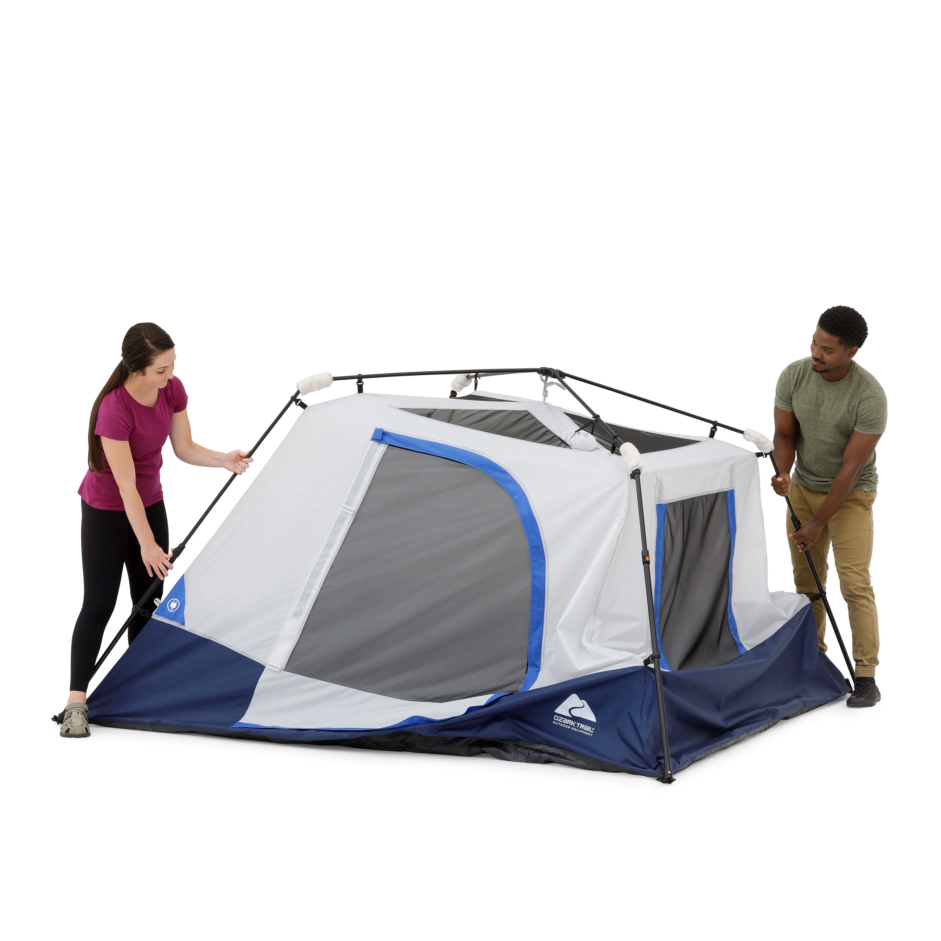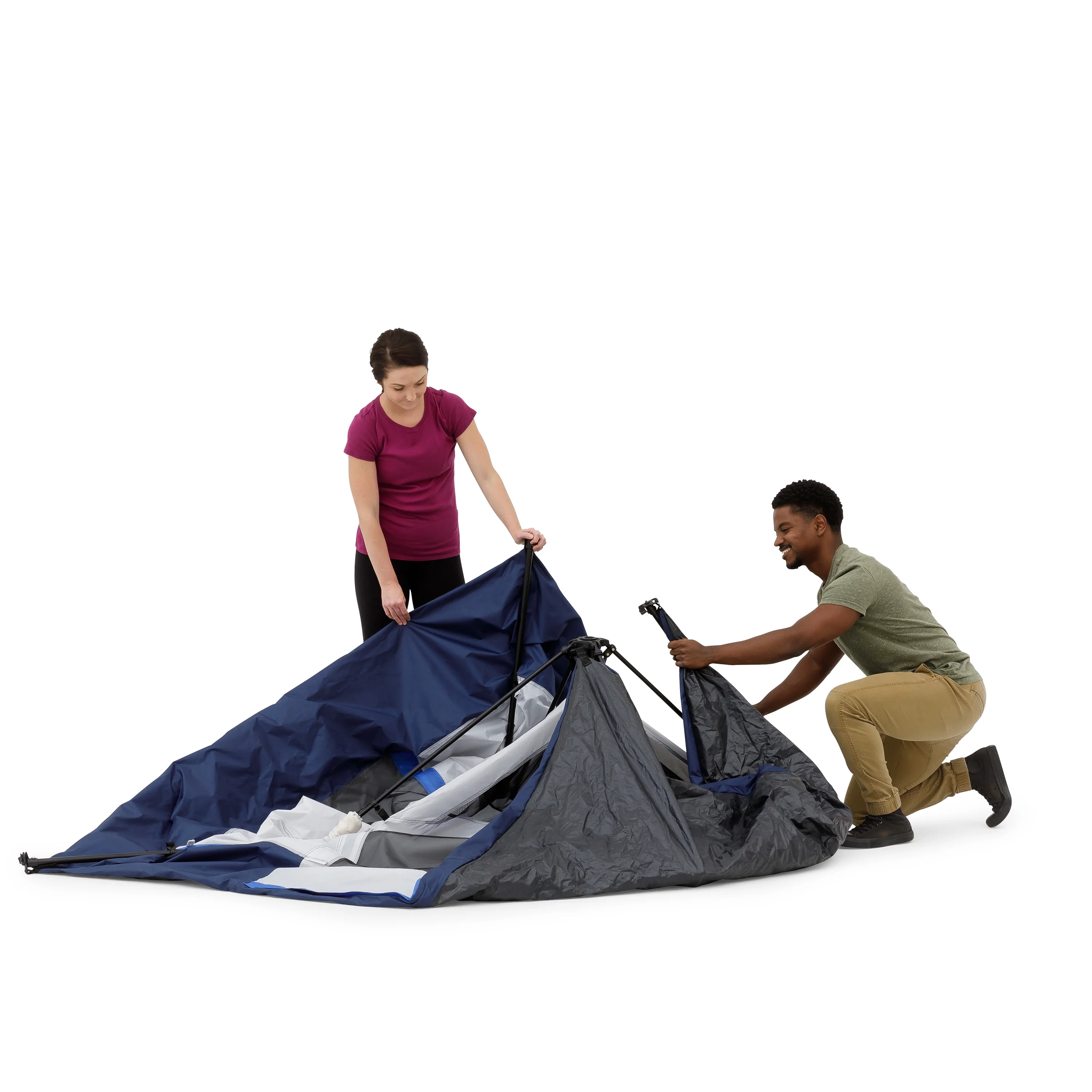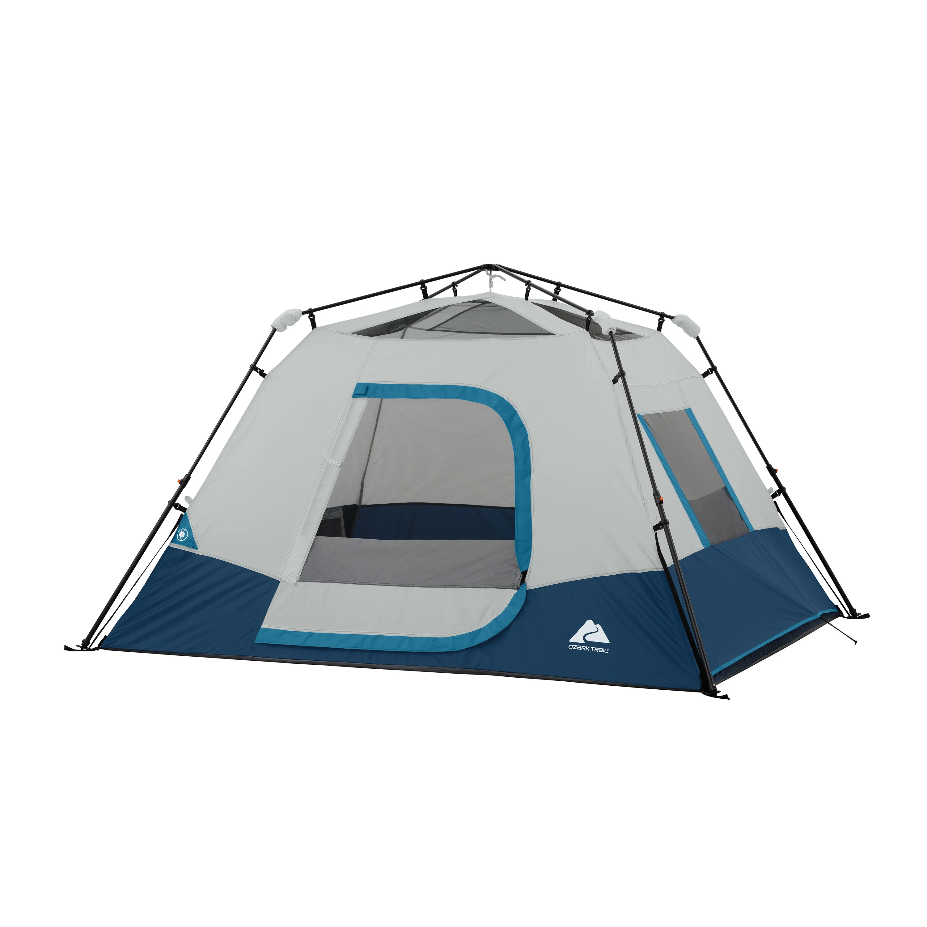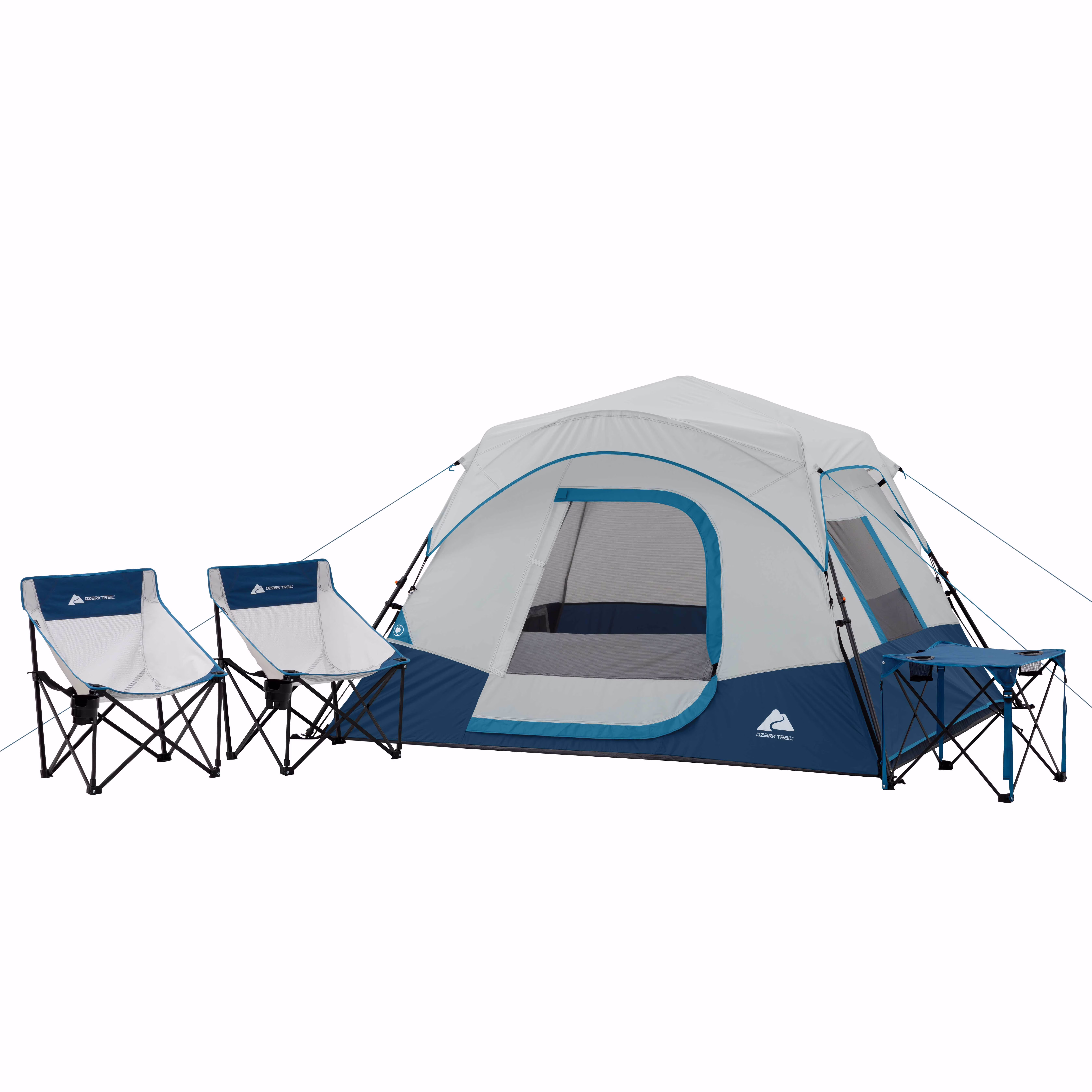 - Includes: 4-person instant cabin tent, 2 compact mesh sport chairs and compact camp table