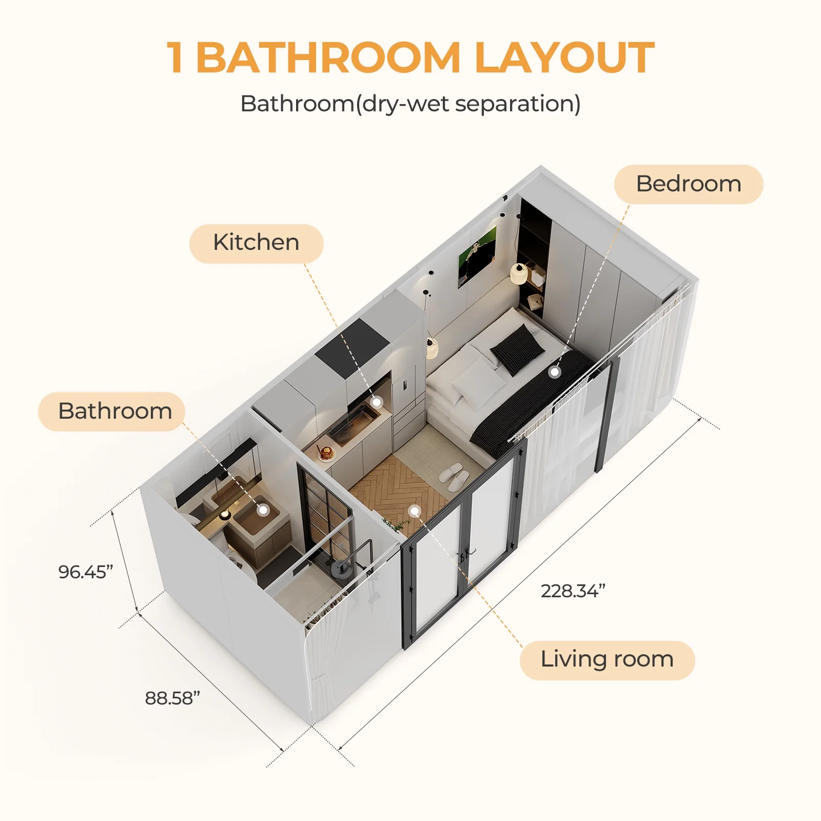 - 【Quick assembly without heavy machinery】The lightweight 50 kg panels enable manual operation and tool-free connection, and come with pre-aligned utility ports for quick electrical/plumbing installation. A typical 19-foot unit can be put into operation in 8 hours using basic household tools, and its intuitive sliding and locking mechanism does not require professional construction skills.