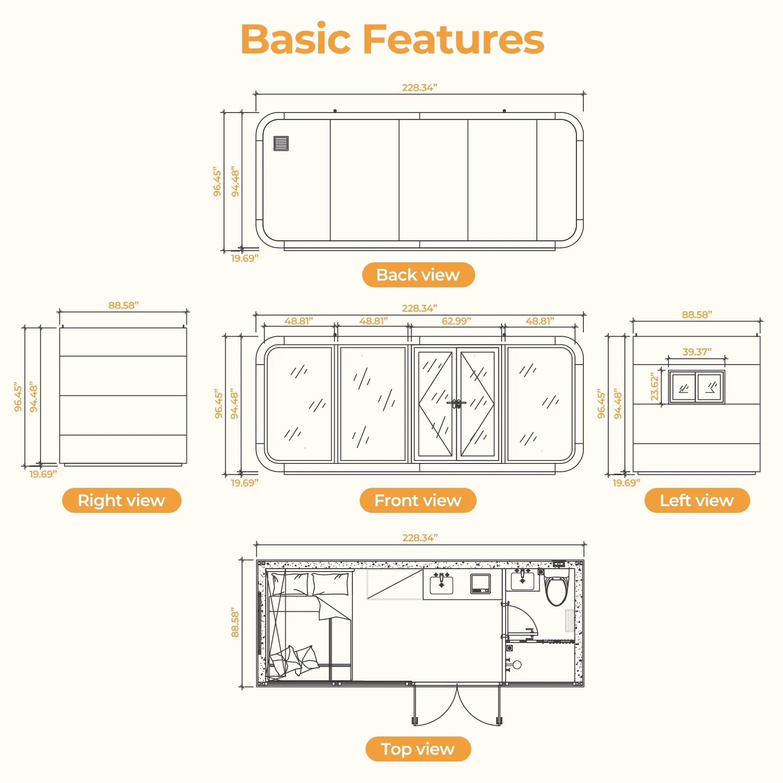 - 【Smart space utilization】The optimized single-story layout allows for flexible adjustment of sleeping and showering areas, maximizing the use of every square foot of space. High-strength floors support heavy equipment storage, while clever window layouts enhance natural lighting without compromising privacy. Wall panels can be repositioned after installation to achieve a personalized layout.