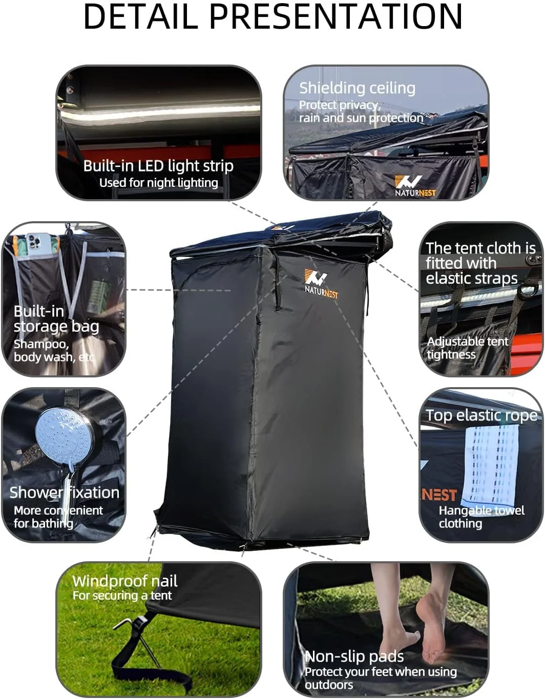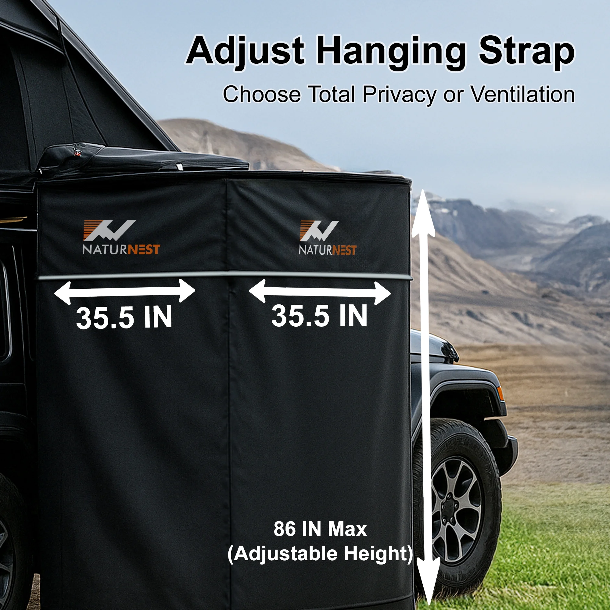 - Adjustable Height & Large Space: Naturnest camping shower room's max drop height is up to 86 inches (you can adjust it according to the height of the vehicle and personal needs), and its length and width reach 35.5*35.5 in, which allows you move around freely in such a wide space.