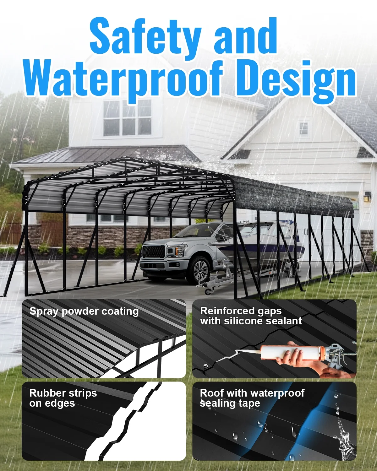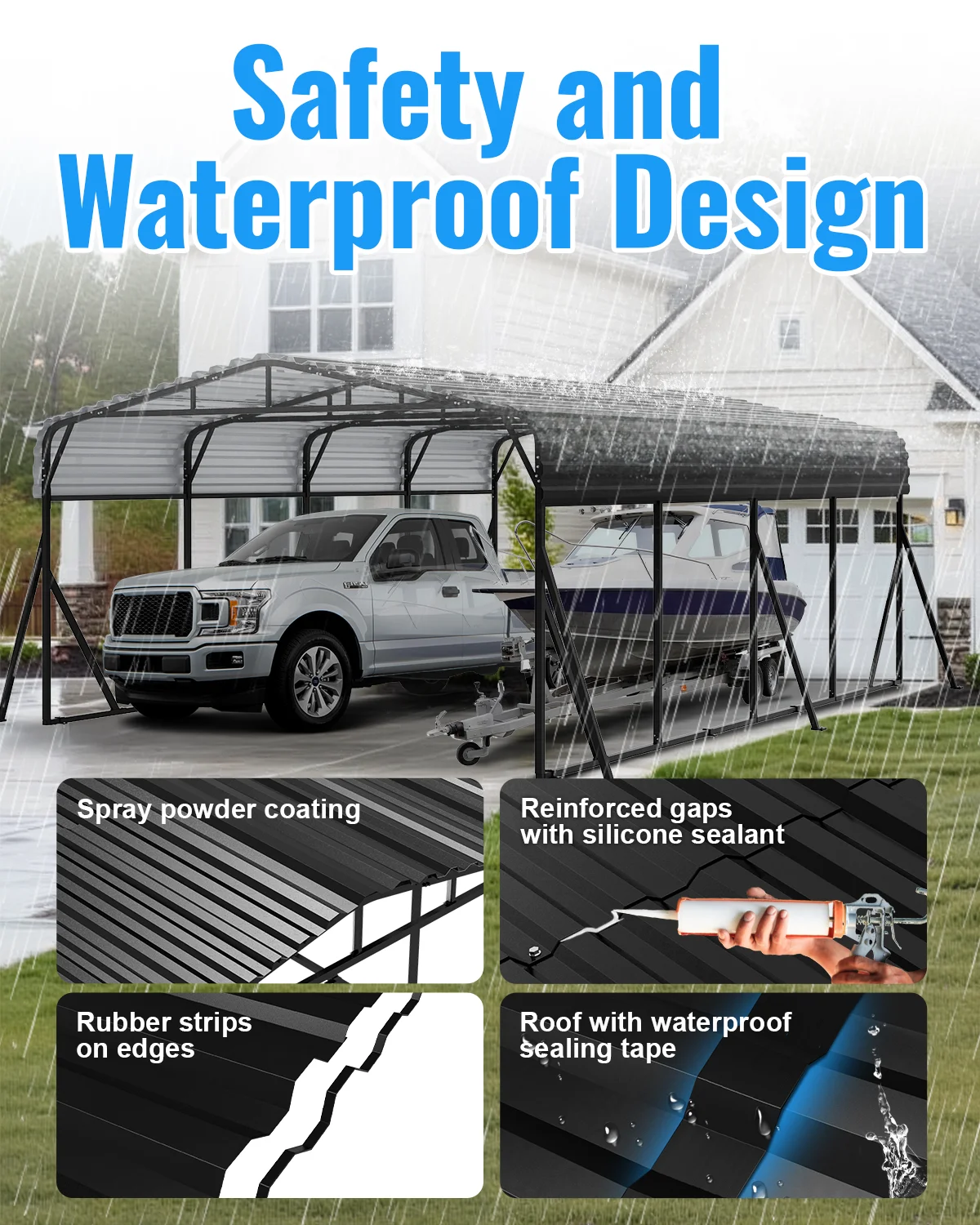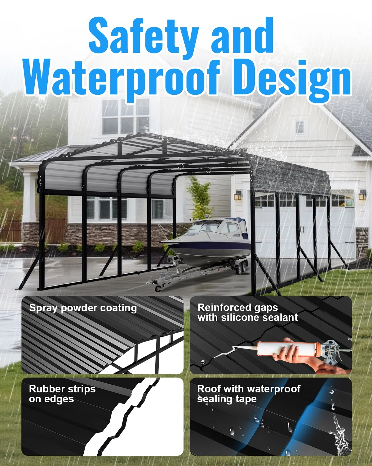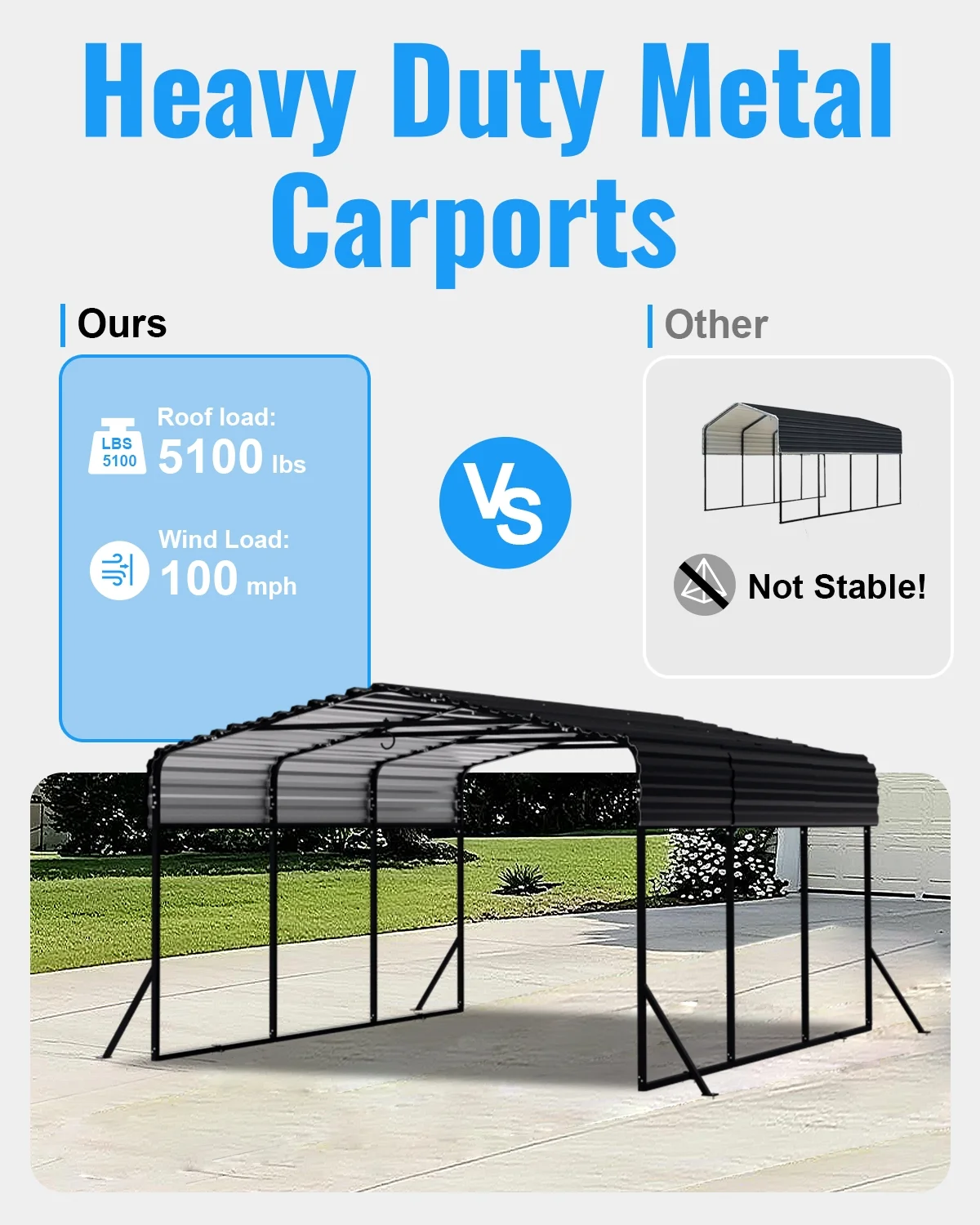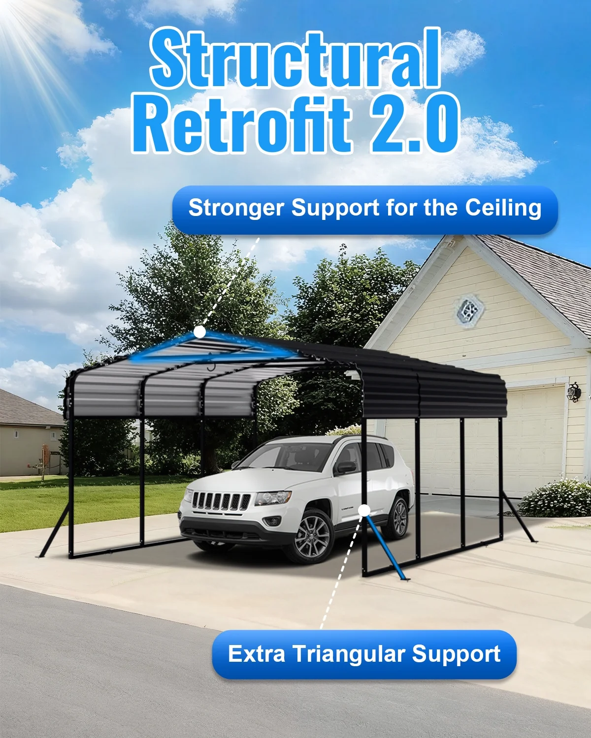 - [All-Weather Carport Durability] Built with a galvanized steel roof and powder-coated frame, this carport resists rust, UV rays, rain, and snow. The durable construction ensures your outdoor carport provides reliable coverage year-round—keeping vehicles cool in summer and preventing snow buildup in winter.