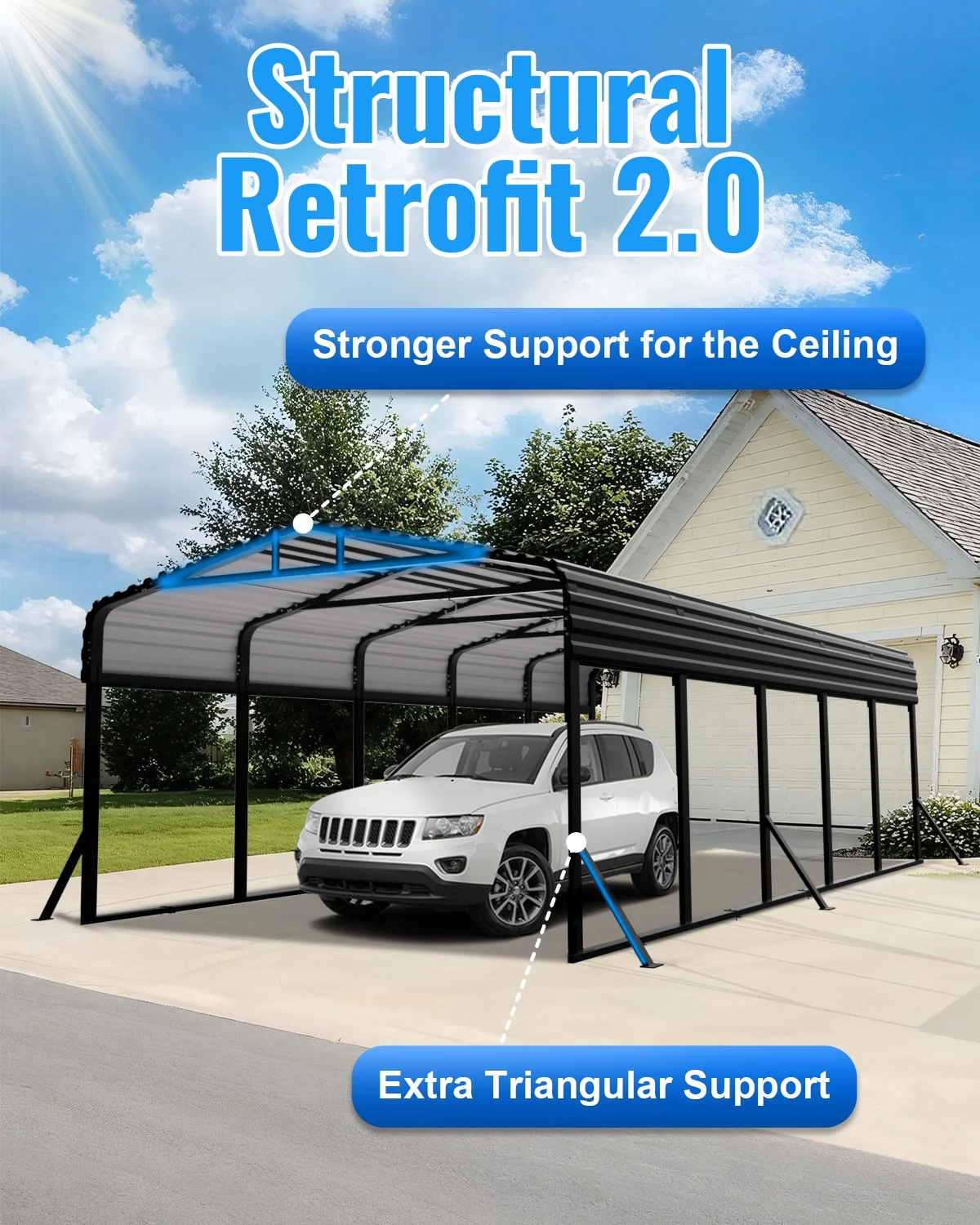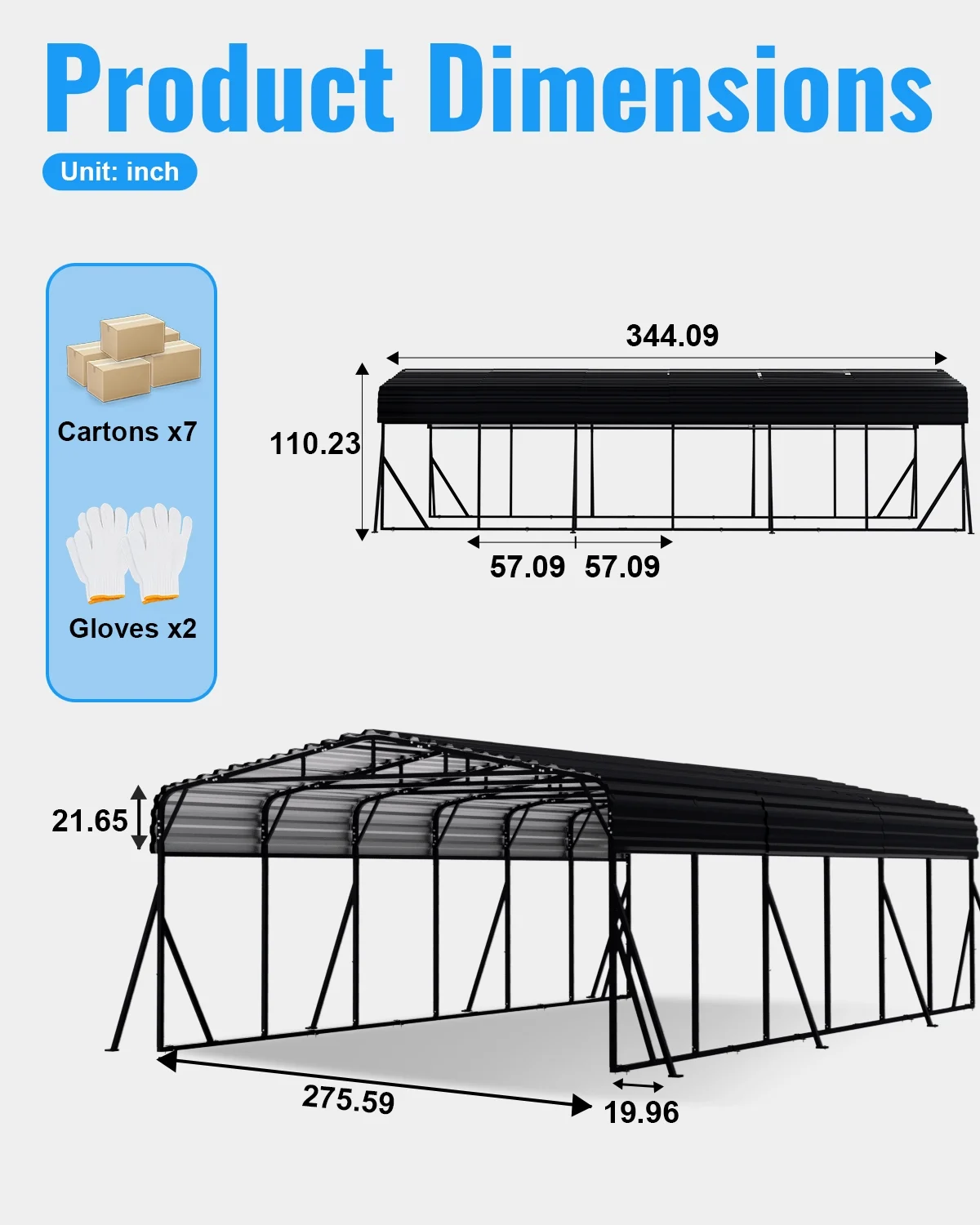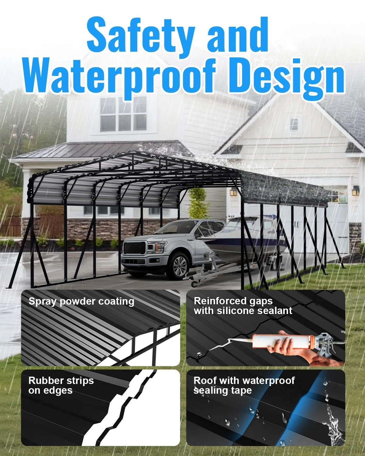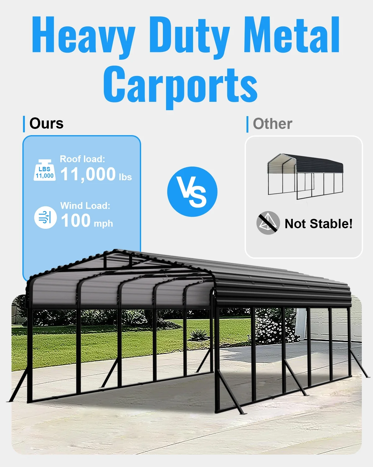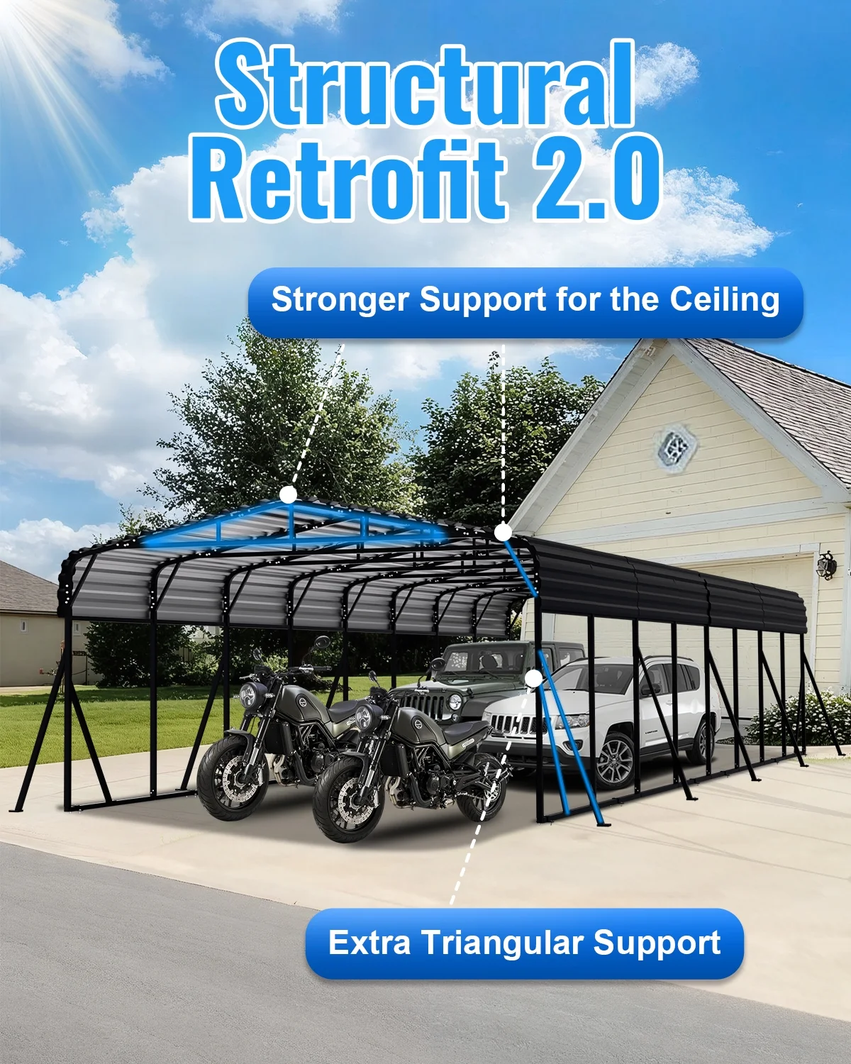 - [All-Weather Carport Durability] Built with a galvanized steel roof and powder-coated frame, this carport resists rust, UV rays, rain, and snow. The durable construction ensures your outdoor carport provides reliable coverage year-round—keeping vehicles cool in summer and preventing snow buildup in winter.