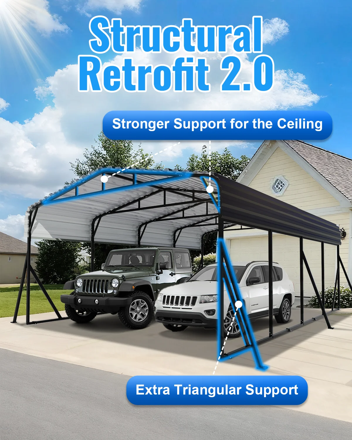 - [Heavy-Duty Reinforced Carport Structure] This metal carport is engineered with a triangular frame design, extended eaves, and reinforced side rods for superior load-bearing capacity. Ground anchors add extra stability, ensuring the carport shelter protects your cars, boats, and outdoor equipment even in tough conditions.